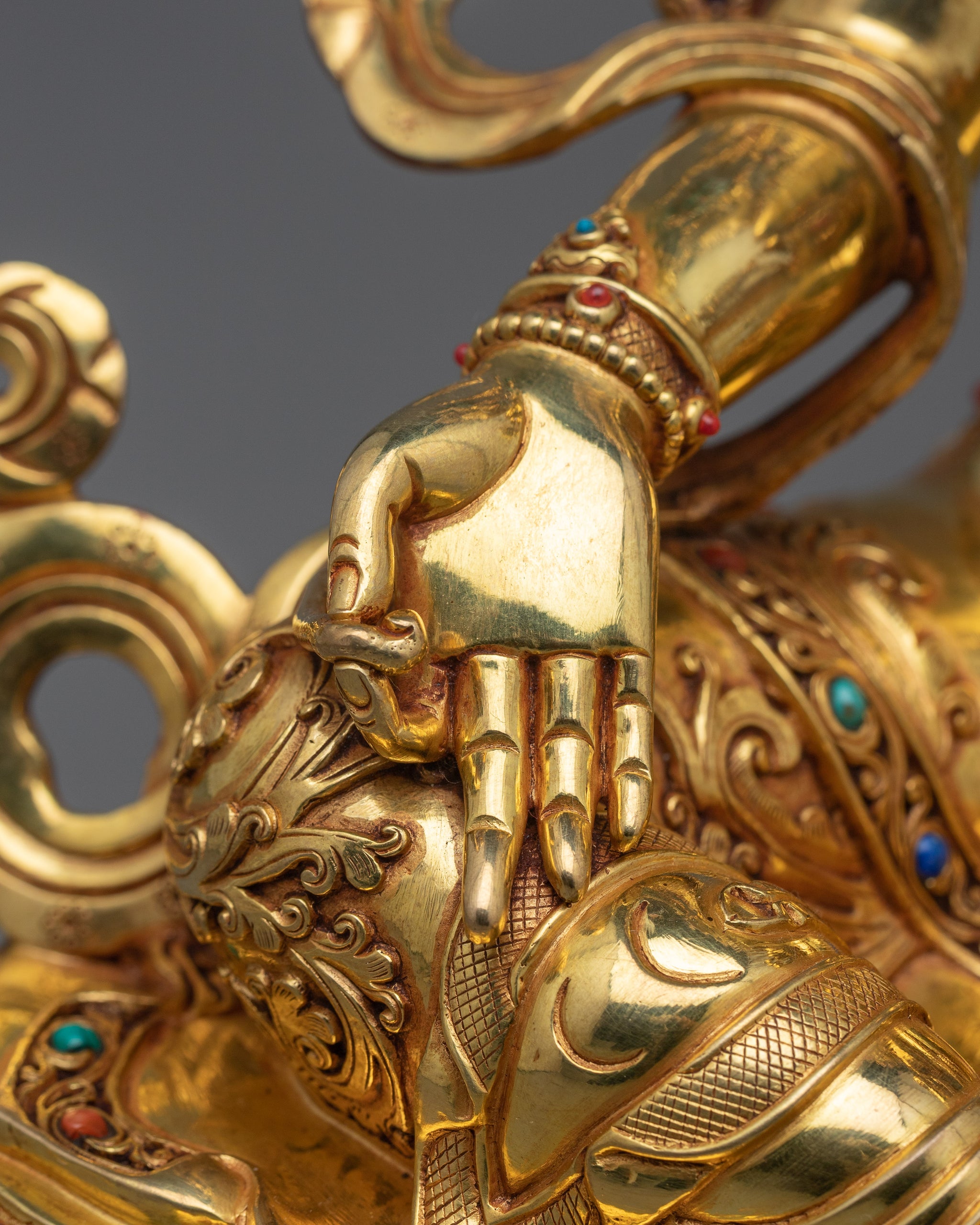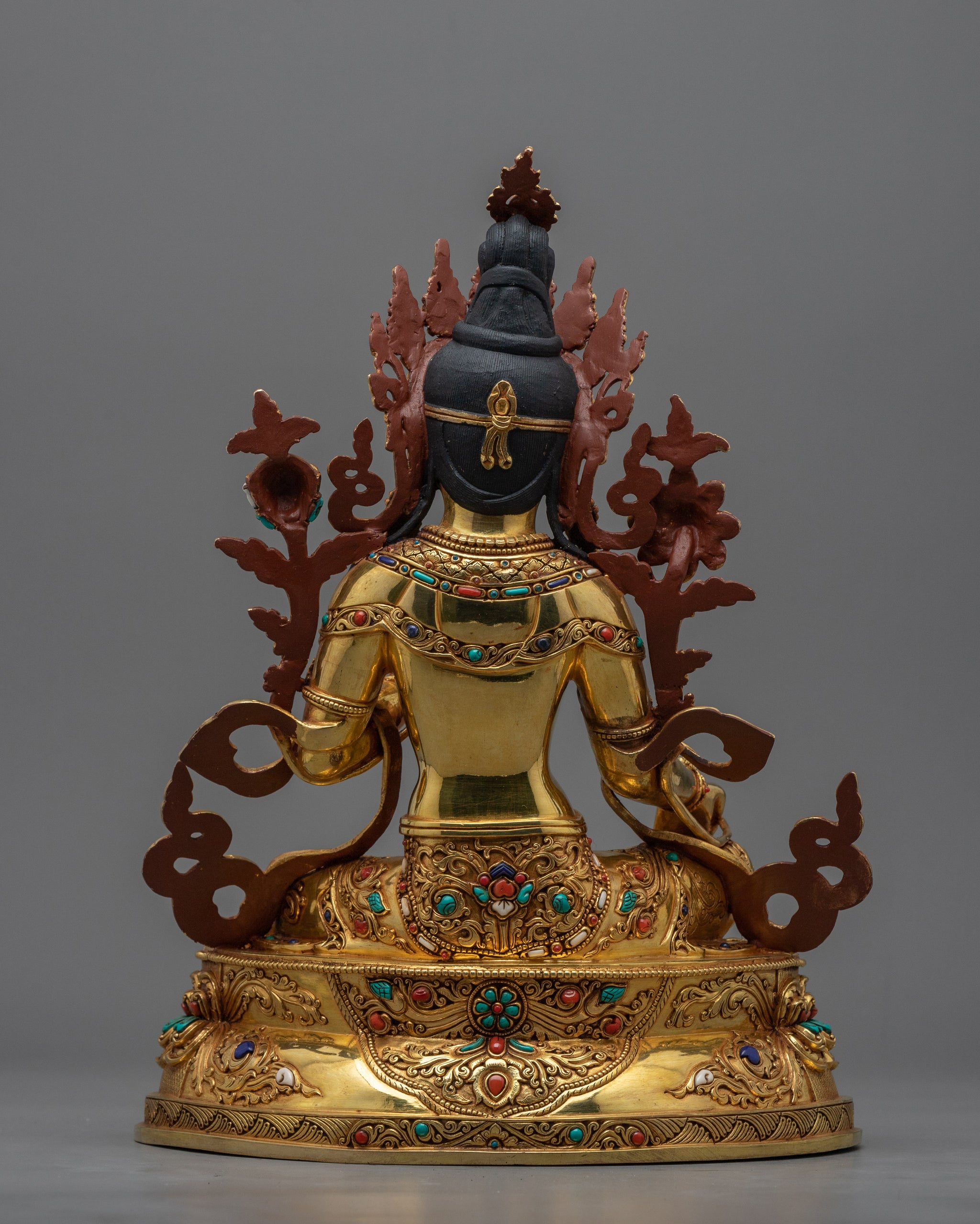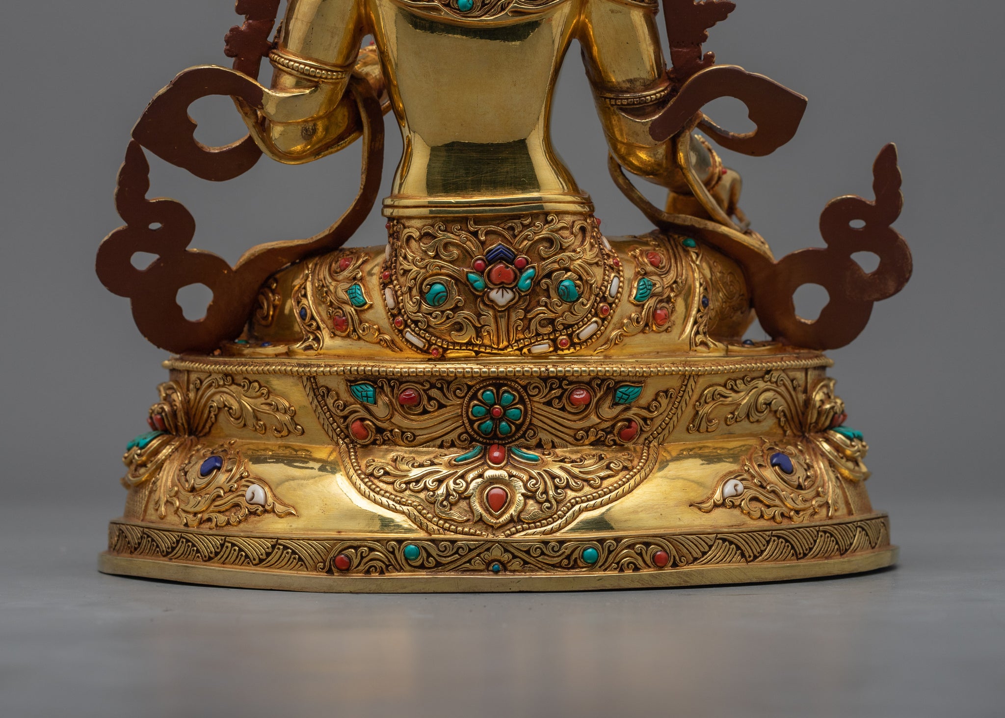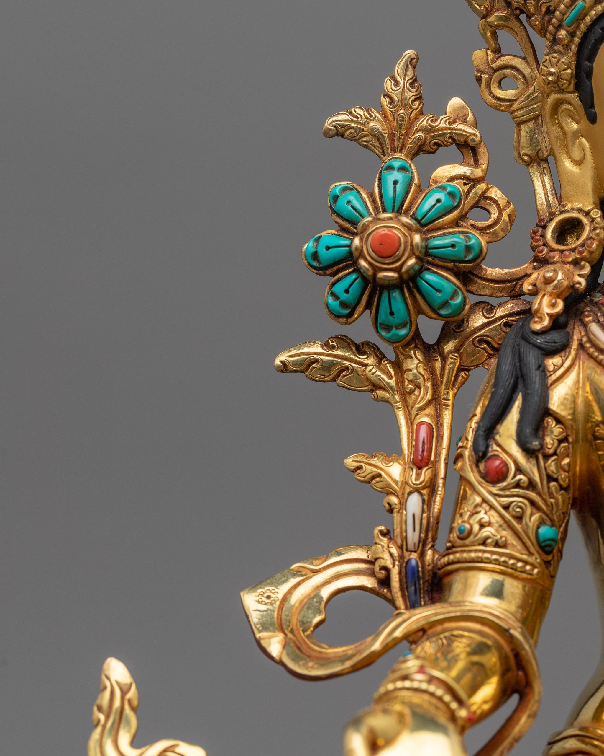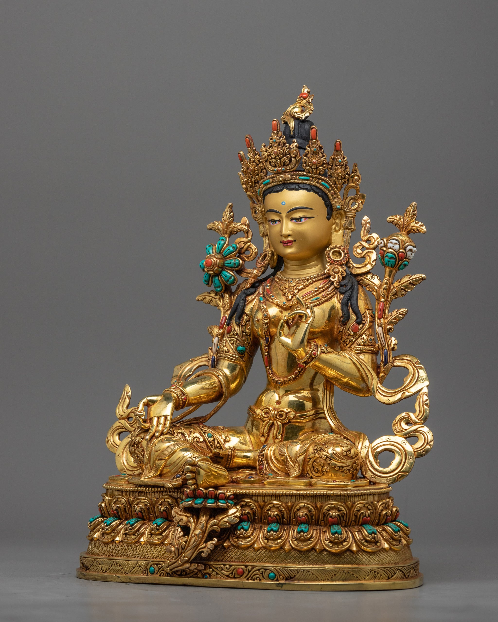 The Diva Shyamatara Statue is skillfully crafted from copper and adorned with elegant Triple layers of 24K gold plating. The gorgeous elegance of Shyama Tara is reflected in every finely carved detail, from the flowing robes to the caring gaze. With its brilliant gold and acrylic paintings, Deeply engraved carvings, and finely hand-carved gemstones, this monument radiates kindness and knowledge, beckoning devotees to enter its hallowed presence. The Diva Green Tara Statue is a work of beautiful accuracy that speaks to the divine nature of enlightenment and provides comfort and guidance to all who seek it.
