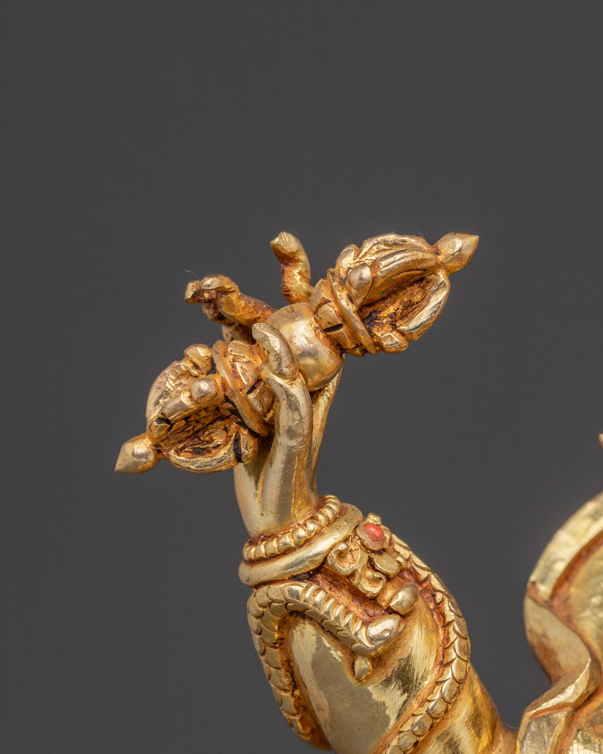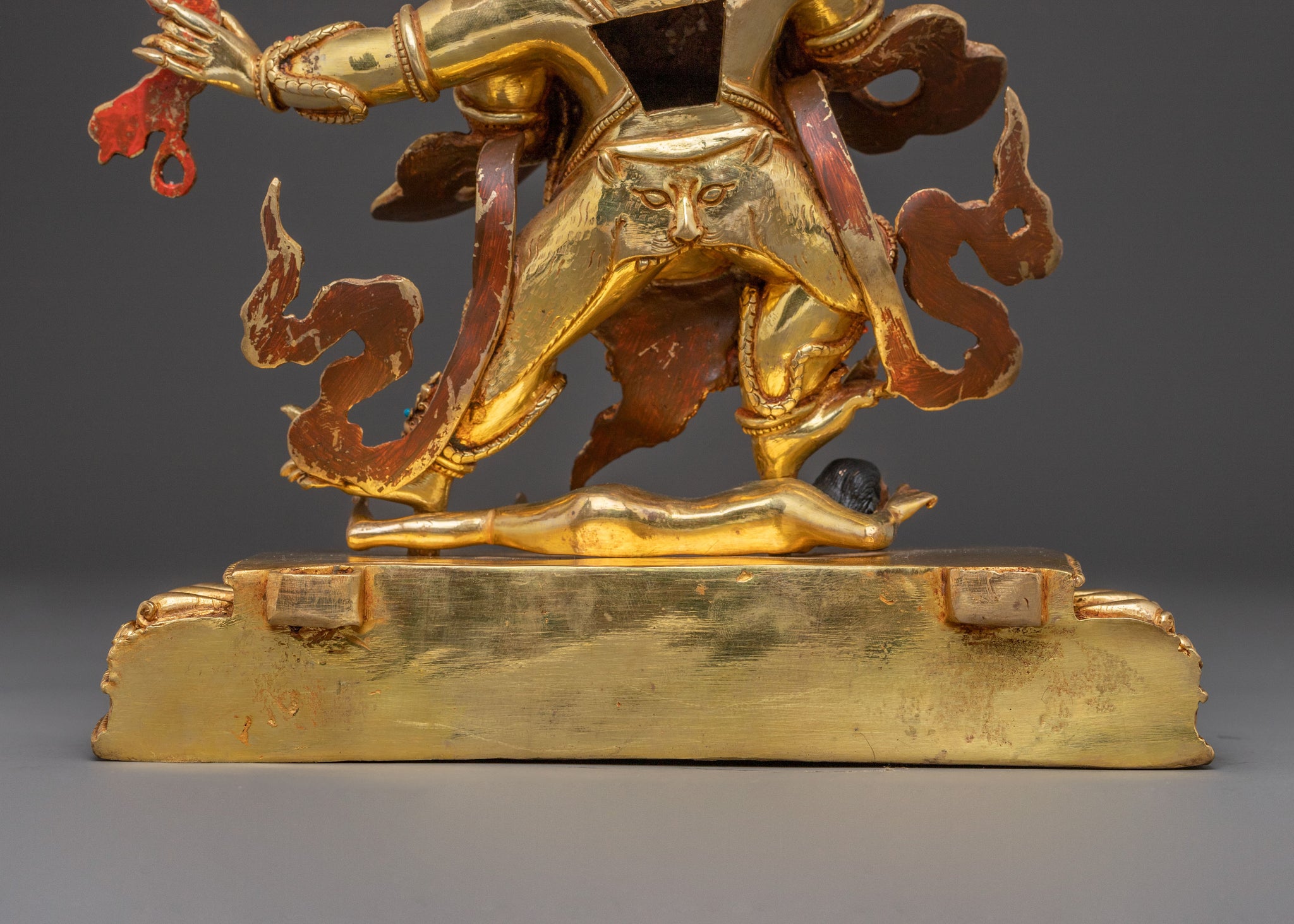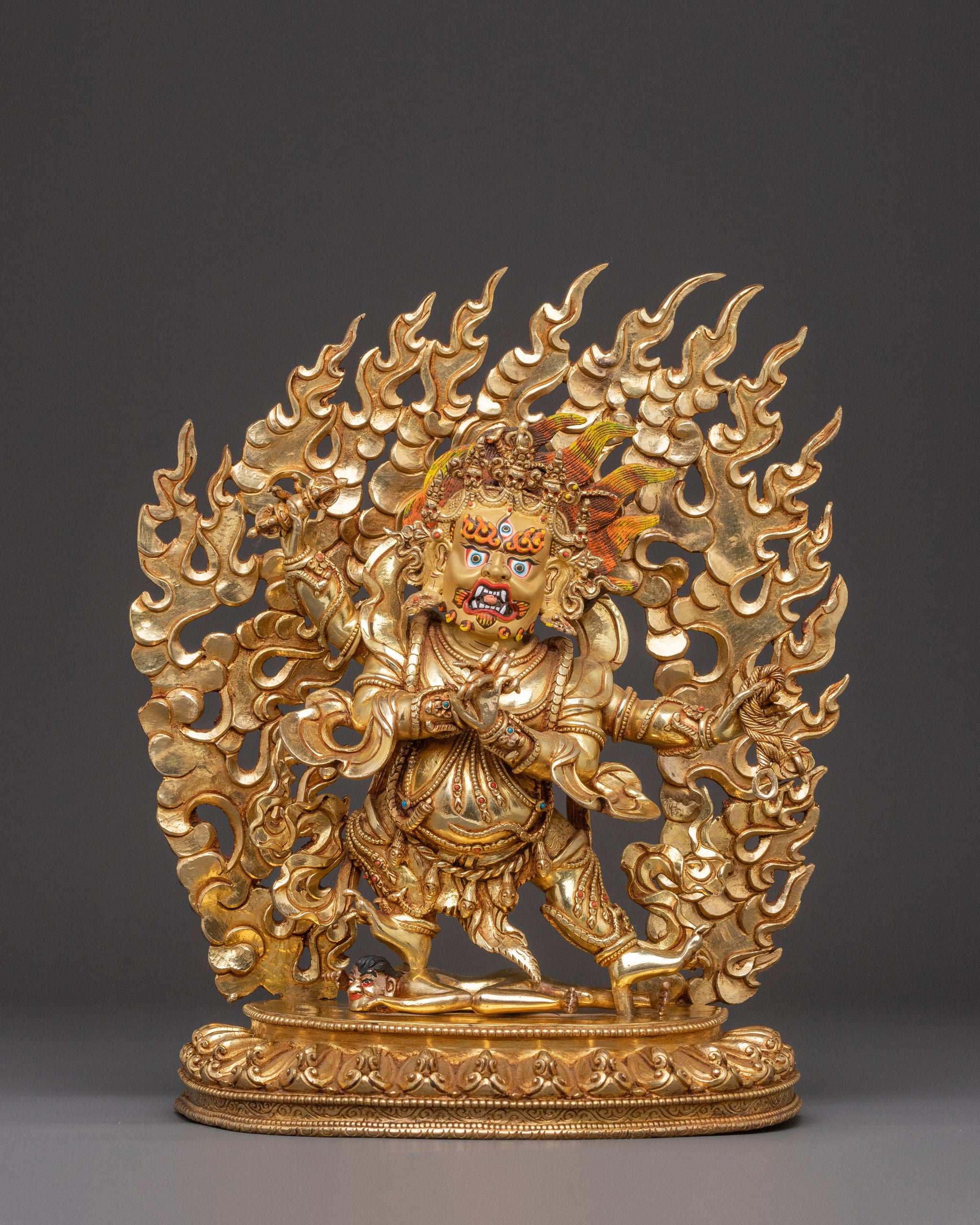 This majestic Butadamara guardian statue stands 12.4 inches (31.5 cm) tall with a 10.8-inch (27.5 cm) base, radiating powerful protective energy. Handcrafted from copper and meticulously gilded in radiant 24K gold, it offers a formidable yet serene presence. Weighing 4.91 kg, this exquisite sculpture serves as a focal point of spiritual strength, combining grace and power in perfect harmony. A truly exceptional piece, it makes an ideal addition to any sacred space, invoking protection and peace.