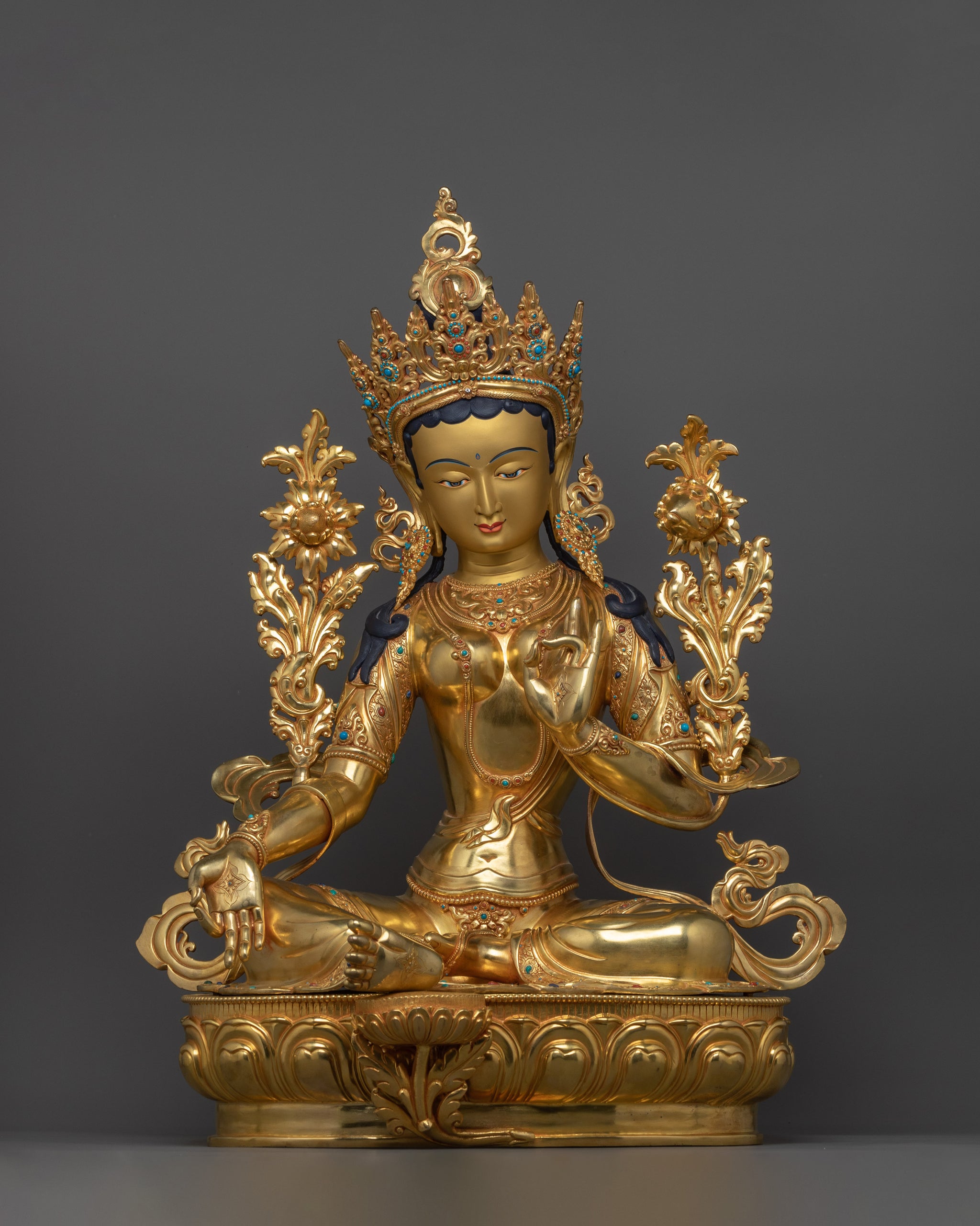 This handmade sculpture represents, the Divine Feminine Green Tara Goddess, for her immortal compassion and protective energy. This statue, stands an astounding 26.0" (Height) x 19.9" (Base) and weighs 21.30 kg. It is handcrafted from fine copper, gilded with triple layer 24K gold, and embellished with acrylic paintings, and deeply engraved 3D-like carvings. This sculpture, designed and built by expert Nepalese artisans, displays the beauty and spiritual depth of Himalayan traditions, making it an ideal centerpiece for altars, temples, or sacred spaces.