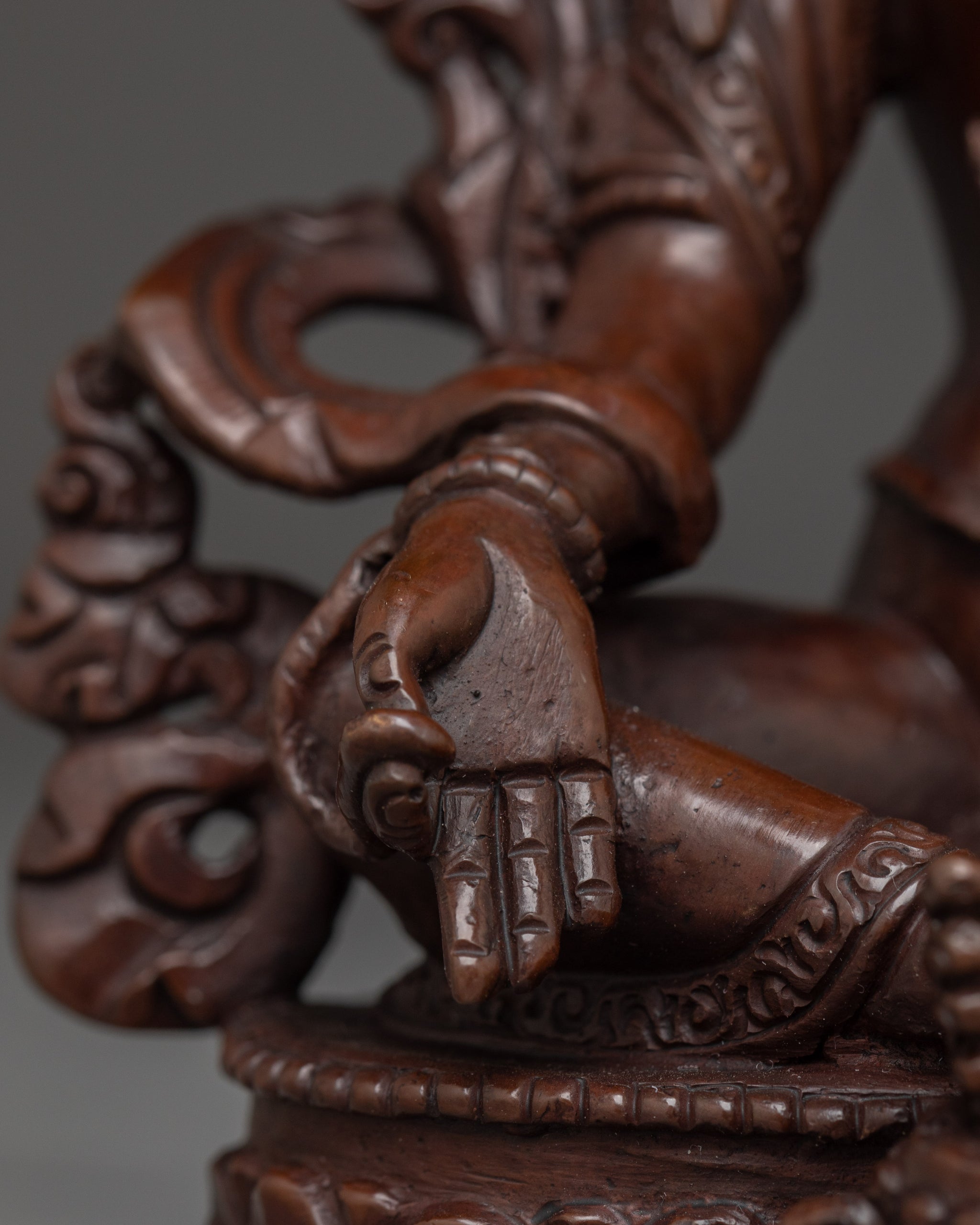 Vajrayogini is stunning. The details are amazing. It's easy to make out her facial expressions, skulls, feet, and the ring of fire around her. You can tell she's handmade. There is a consecration hole in her back.
