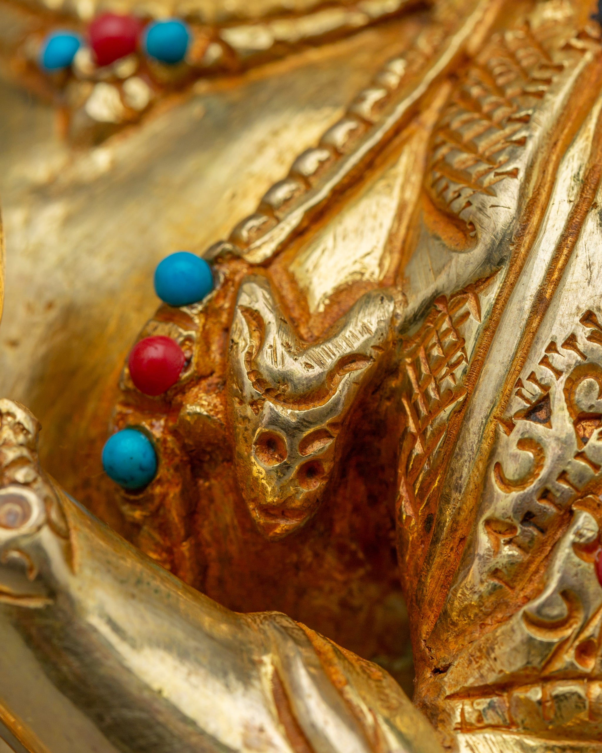 Vajrayogini is stunning. The details are amazing. It's easy to make out her facial expressions, skulls, feet, and the ring of fire around her. You can tell she's handmade. There is a consecration hole in her back.