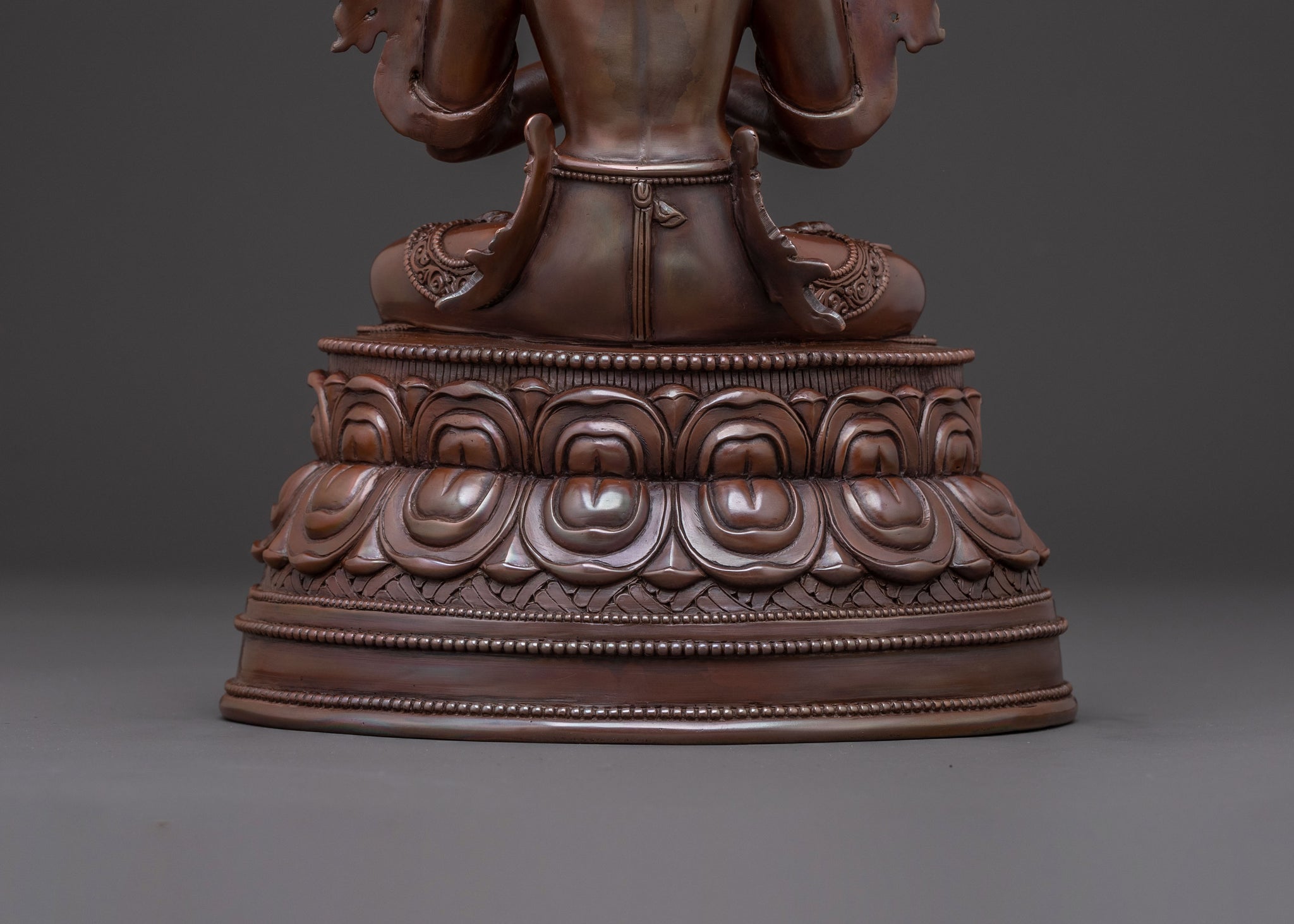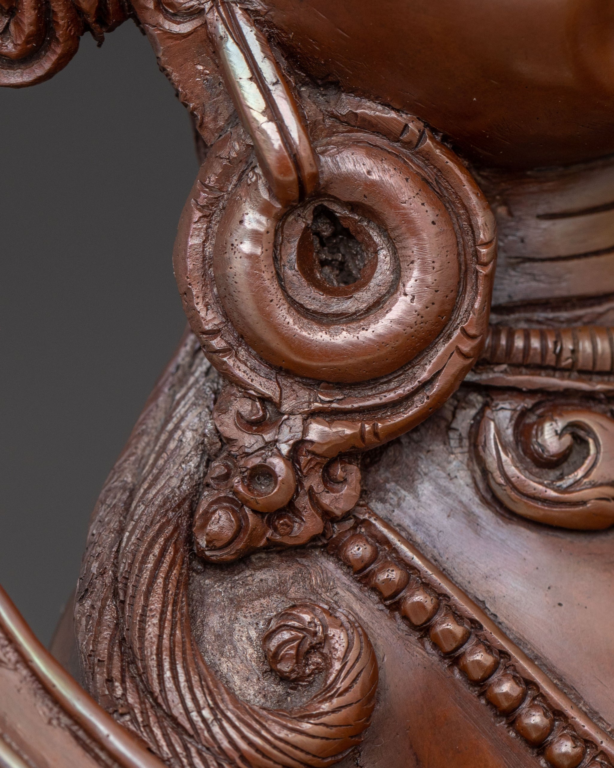 Arising from the venerable tradition of Himalayan artistry, this divine Vajradhara statue embodies ultimate enlightened wisdom. Handcrafted in Nepal from high-quality oxidized copper, its robust form and deep, dark patina convey a sense of ancient gravitas. Standing at 26cm (10.2”) in height, with a base measuring 18cm (7”), this sacred sculpture weighs 2.32 kg. Its tranquil yet potent spiritual presence makes it a profound addition to any devotional space, reflecting the wisdom of the Adi-Buddha.