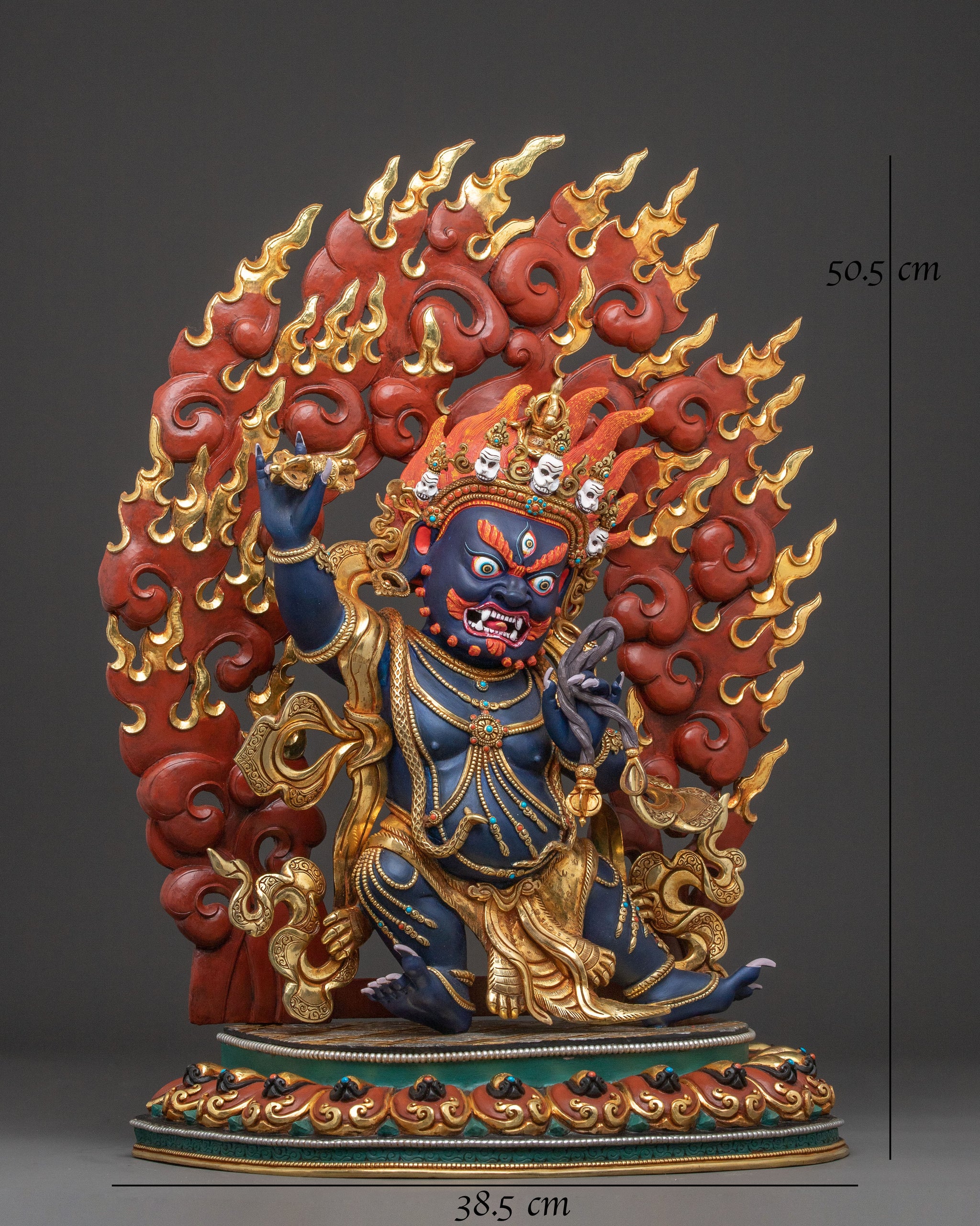 This divine Vajrapani statue is a powerful embodiment of enlightened energy. Standing at an impressive 50.5 cm, this masterwork captures the dynamic presence of Vajrapani, radiating an aura of protective vigor and spiritual fortitude. Crafted with a solid copper body, its commanding form is meticulously detailed, designed to inspire deep reverence and contemplation within any sacred space. This premium artwork exemplifies generations of Himalayan craftsmanship. The statue’s robust copper core is adorned with rich gold electroplating, lending it a radiant, enduring luster that speaks of its heritage. Intricate details are brought to life through delicate repoussé and chasing, complemented by carefully hand-placed gemstones and fine acrylic paintings that highlight Vajrapani’s wrathful yet benevolent features. This fusion of durable materials and refined artistry ensures a piece of lasting beauty and spiritual significance.