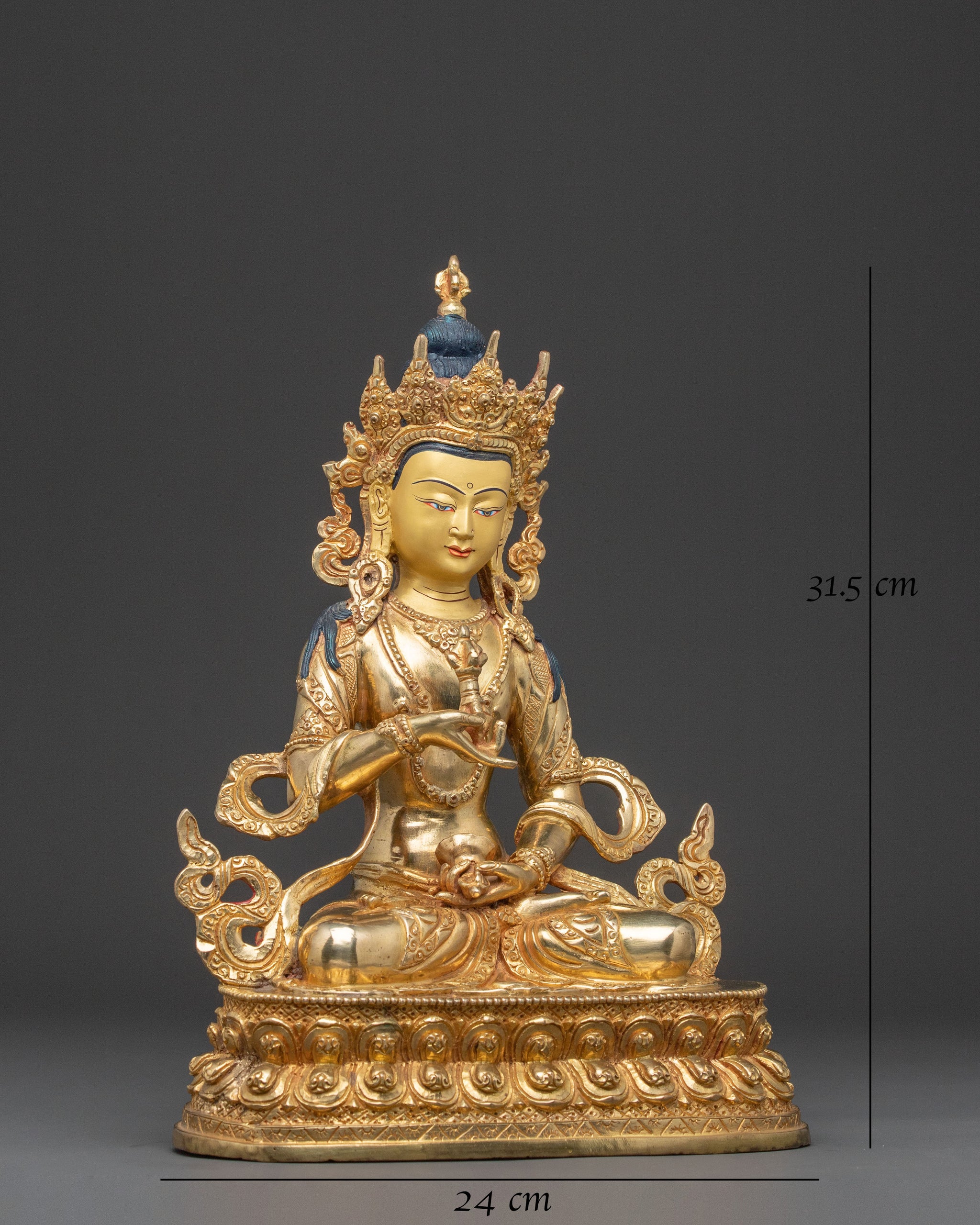 A resplendent representation, this divine Vajrasattva golden statue brings forth powerful energies of purification and serene clarity. Crafted with devotion in Nepal, it stands 31.5cm tall, a beacon of spiritual renewal for any sacred space. Its warm radiance, born from meticulously applied gold, invites introspection and deep meditative practice, embodying the essence of Vajrasattva’s enlightened mind.