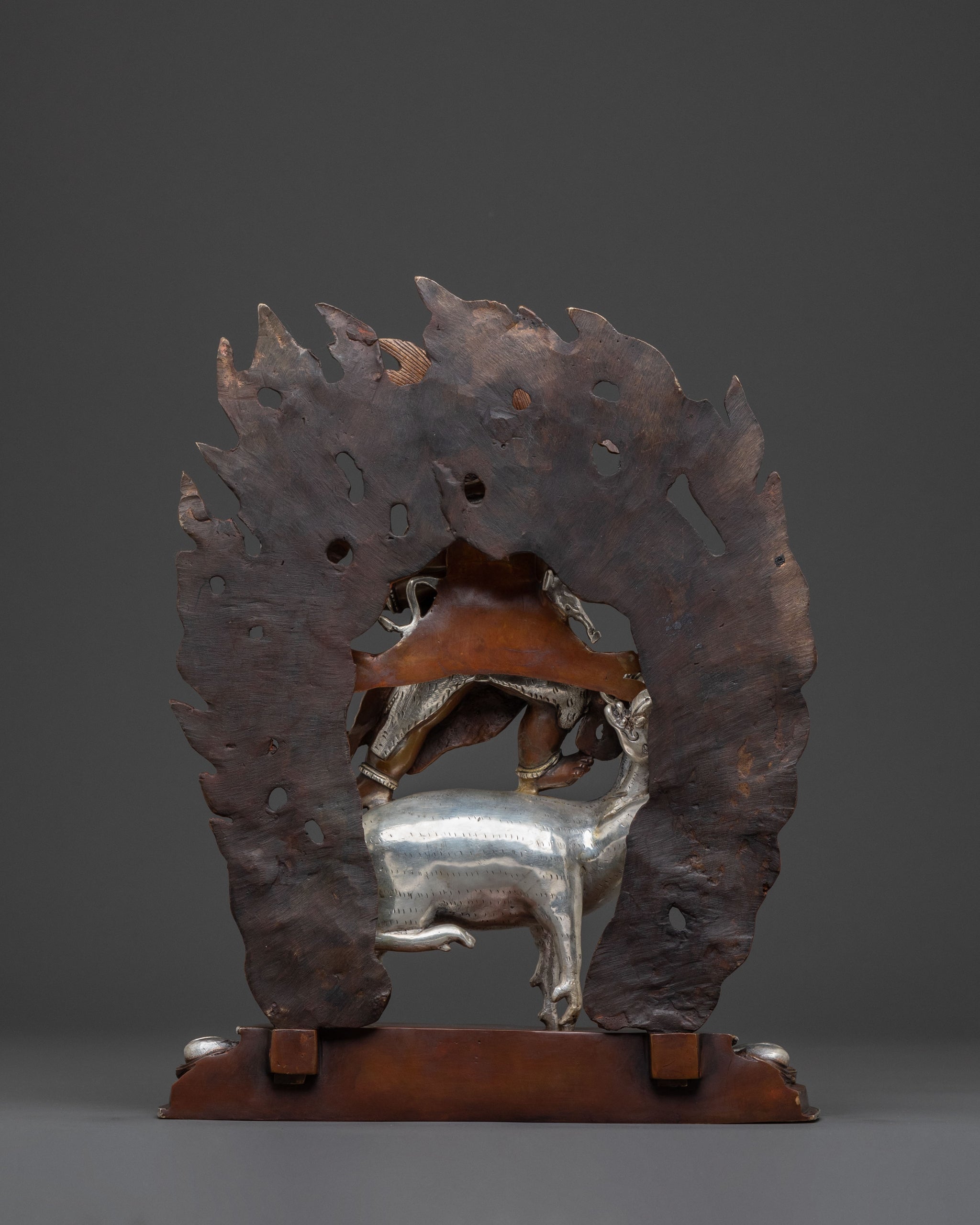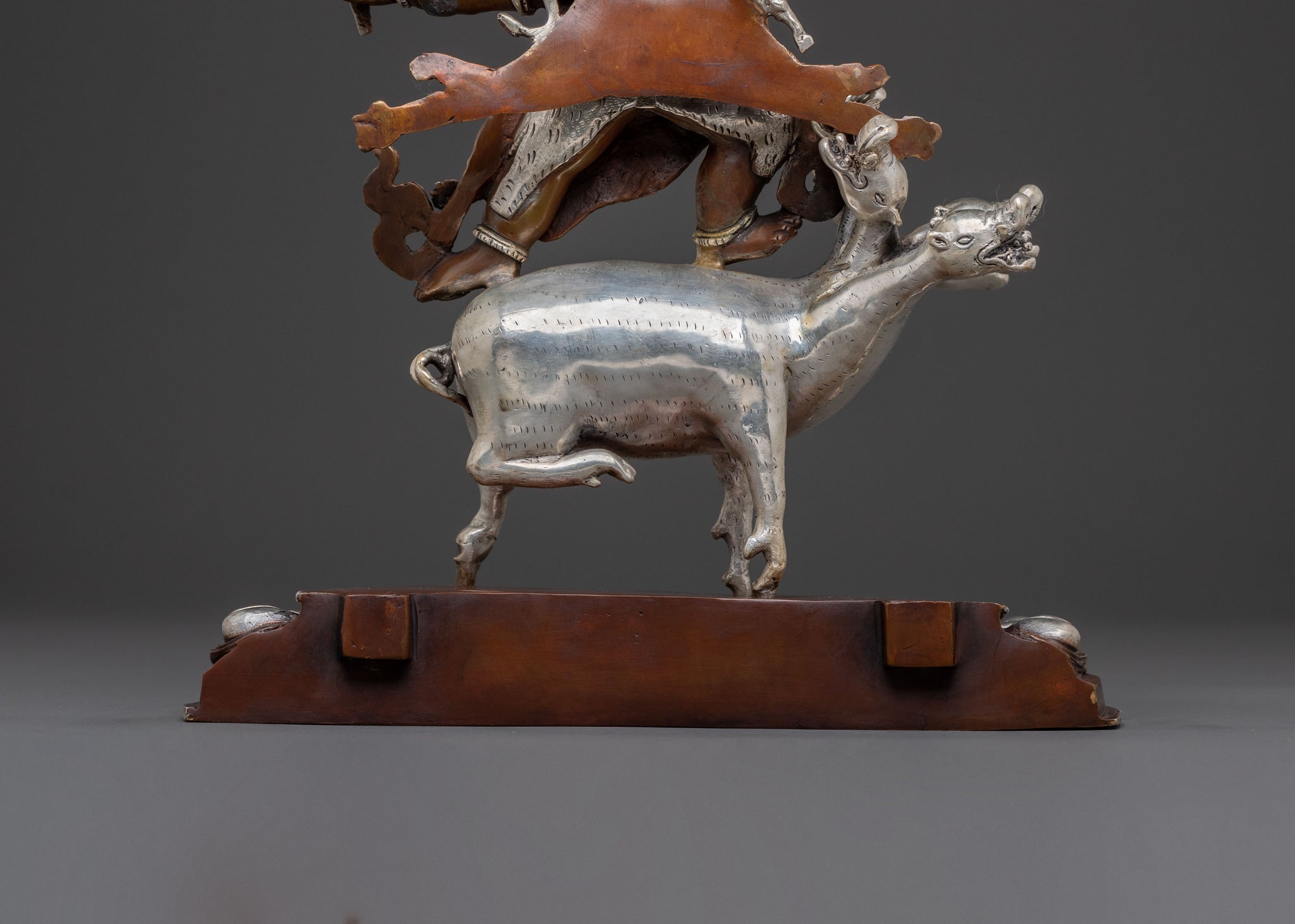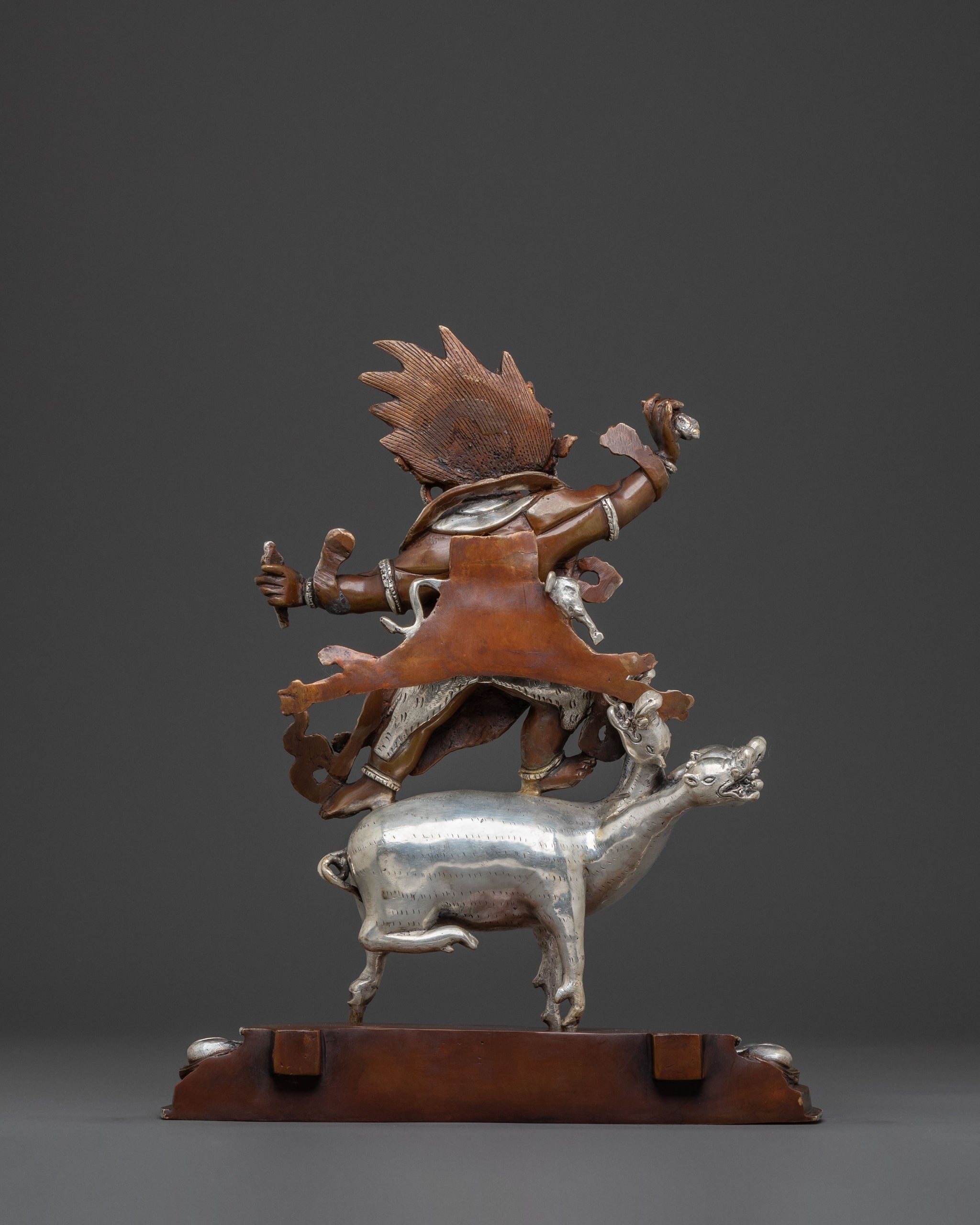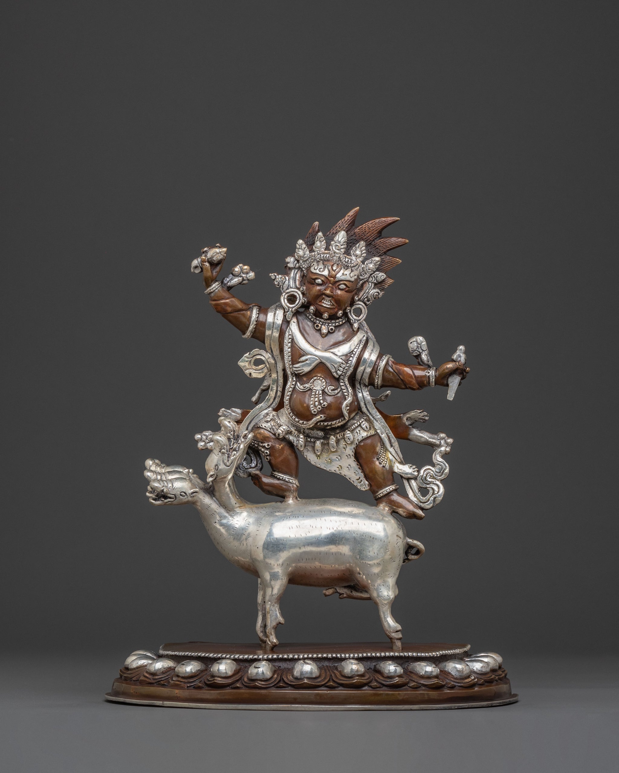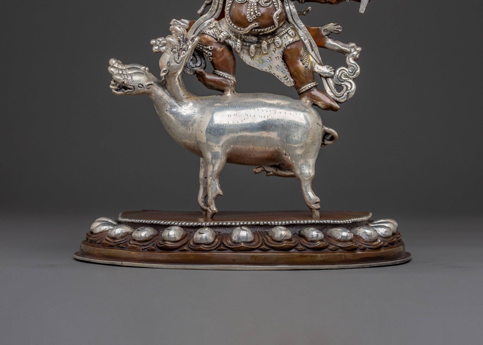 This Dorje Gotrab statue stands 11.81 inches (30cm) tall with a 9.06-inch (23cm) base and weighs 3.88 kg. Handcrafted from oxidized copper and enhanced with silver electroplating, this powerful meditation statue reflects authentic Nepalese artistry. Made by skilled Newar artisans, it is perfect for personal altars, meditation spaces, or as a meaningful spiritual gift.