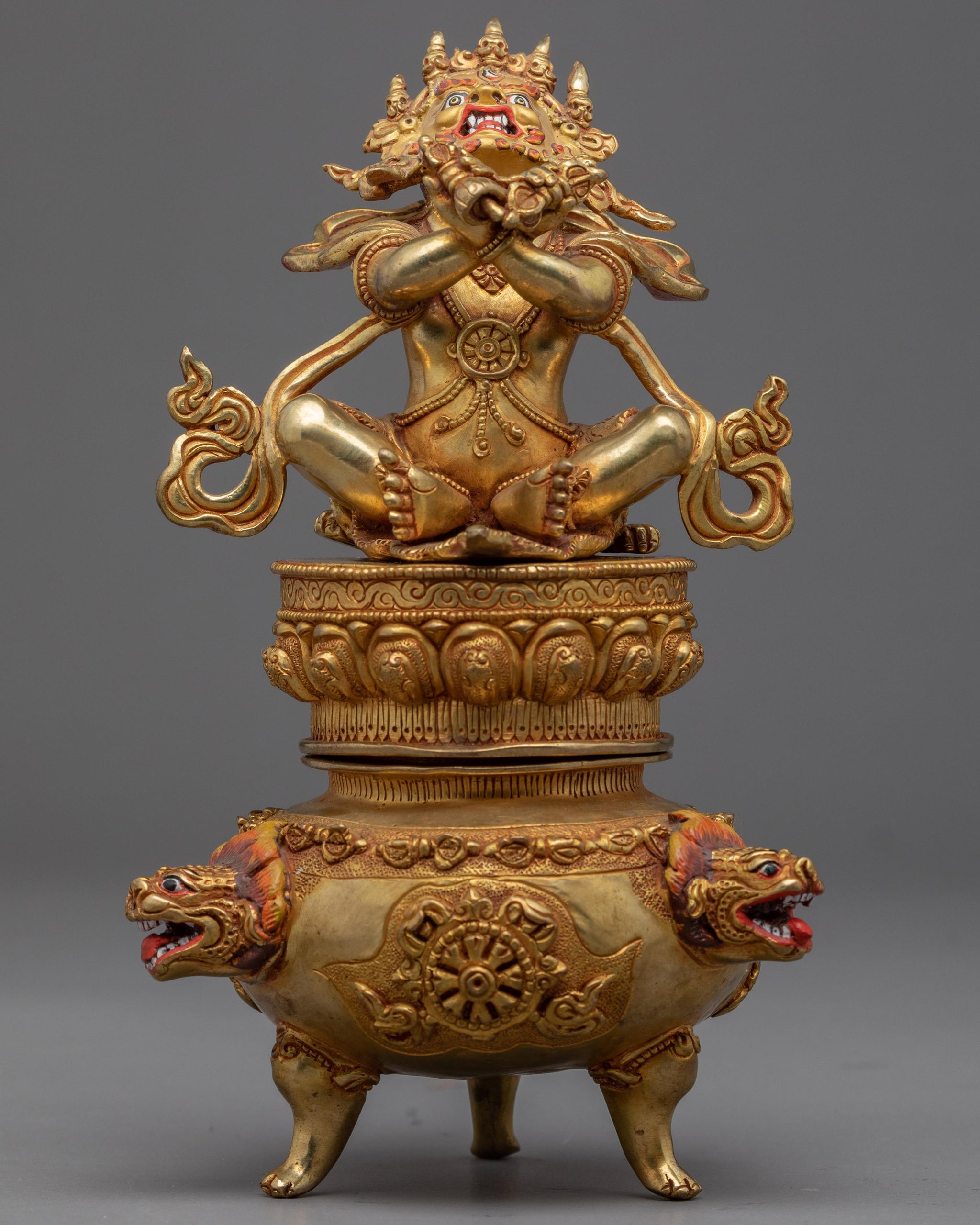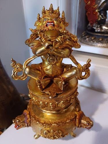 The Dorje Khadro statue is depicted sitting upon a moon disc lotus, placed upon a unique majestic throne detailed with mystical beings and intricate carvings. Hand carved from a copper body, gilded with 24k genuine highlighting the details patterns of the statue, and finely painted with acrylic paint. The deity is seated with a wrathful expression with his head pointed towards the sky with both his hands crossed together, making the king desire mudra. Both hands hold a vajra, respectively. This statue took our artists months to complete, and it will be the perfect gift for a practicer like you.