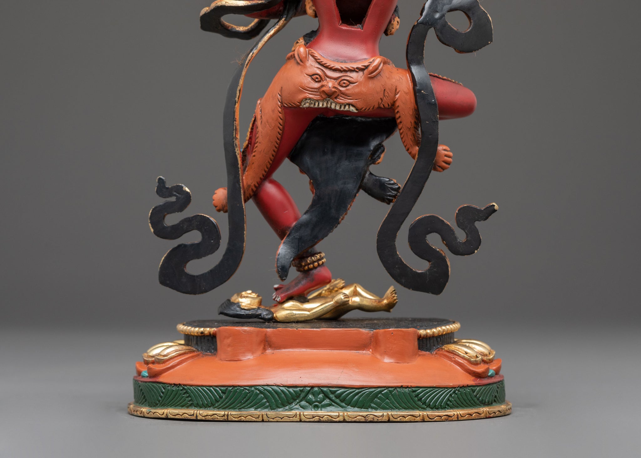 Dorje Phagmo is depicted in her dynamic form, standing with one leg bent and the other extended in a powerful stance, symbolizing her readiness to overcome obstacles and ignorance. Her right hand holds a vajra at her heart, signifying indestructible compassion and method. In her left hand, she holds a skull cup containing the nectar of immortality, representing her mastery over death and the transmutation of negative energies. She tramplest upon a subdued figure beneath her feet, indicating her triumph over ego, delusion, and opposing forces. A radiant halo encircles her head, emanating her enlightened energy, while a garland of skulls adorns her waist, symbolizing impermanence and her transcendence over cyclic existence. She is adorned with a five-pointed skull crown, representing the transformation of five aspects of negativity into positive energy.