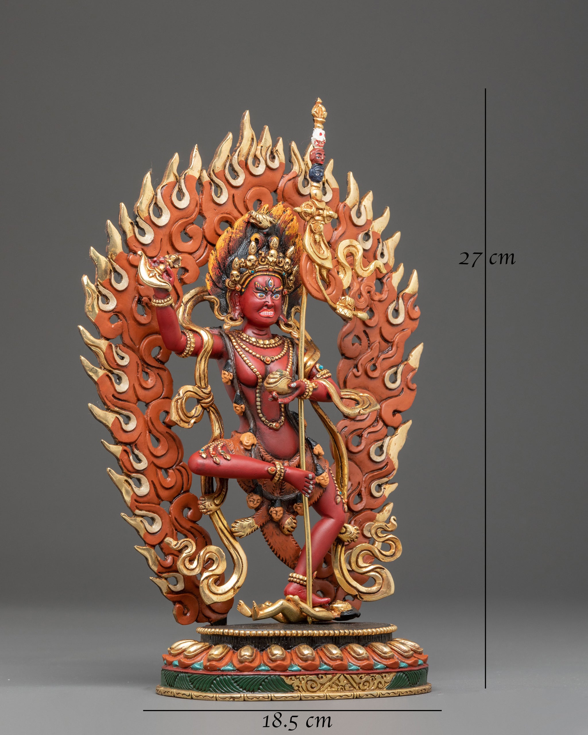 The Dorje Phagmo Copper Handmade Statue stands 10.6 inches (27 cm) tall with a base width of 7.3 inches (18.5 cm) and weighs 1.66 kilograms. Expertly crafted from copper, it is adorned with 24K gold gilding, intricate acrylic paintings, and hand-set gemstones that enhance its spiritual and visual appeal. Representing the fierce yet compassionate aspect of Vajrayogini, this statue embodies tantric wisdom and transformation. Its detailed craftsmanship and balanced proportions make it a powerful and meaningful addition to any meditation altar, spiritual collection, or sacred space.