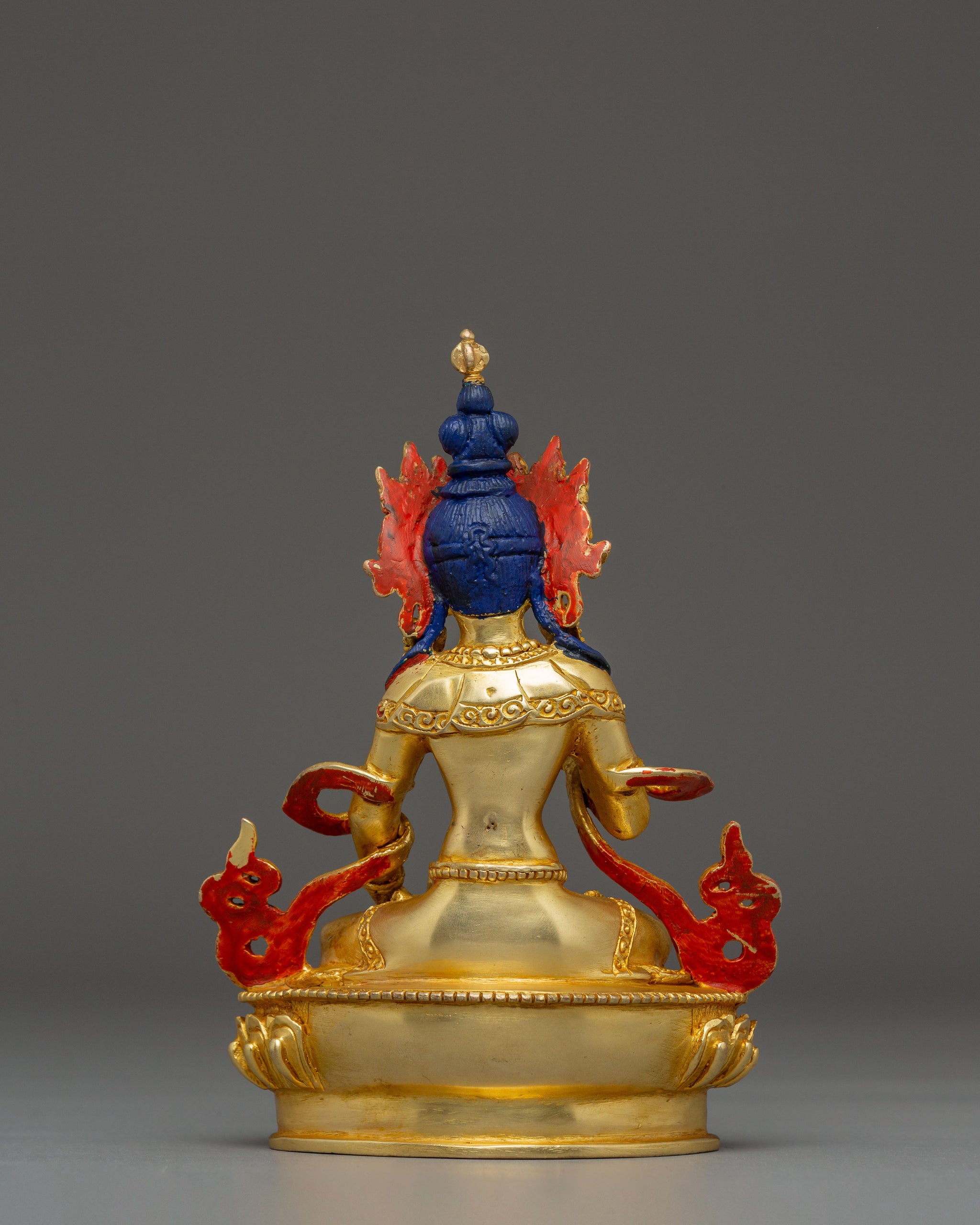 Vajrayogini is stunning. The details are amazing. It's easy to make out her facial expressions, skulls, feet, and the ring of fire around her. You can tell she's handmade. There is a consecration hole in her back.