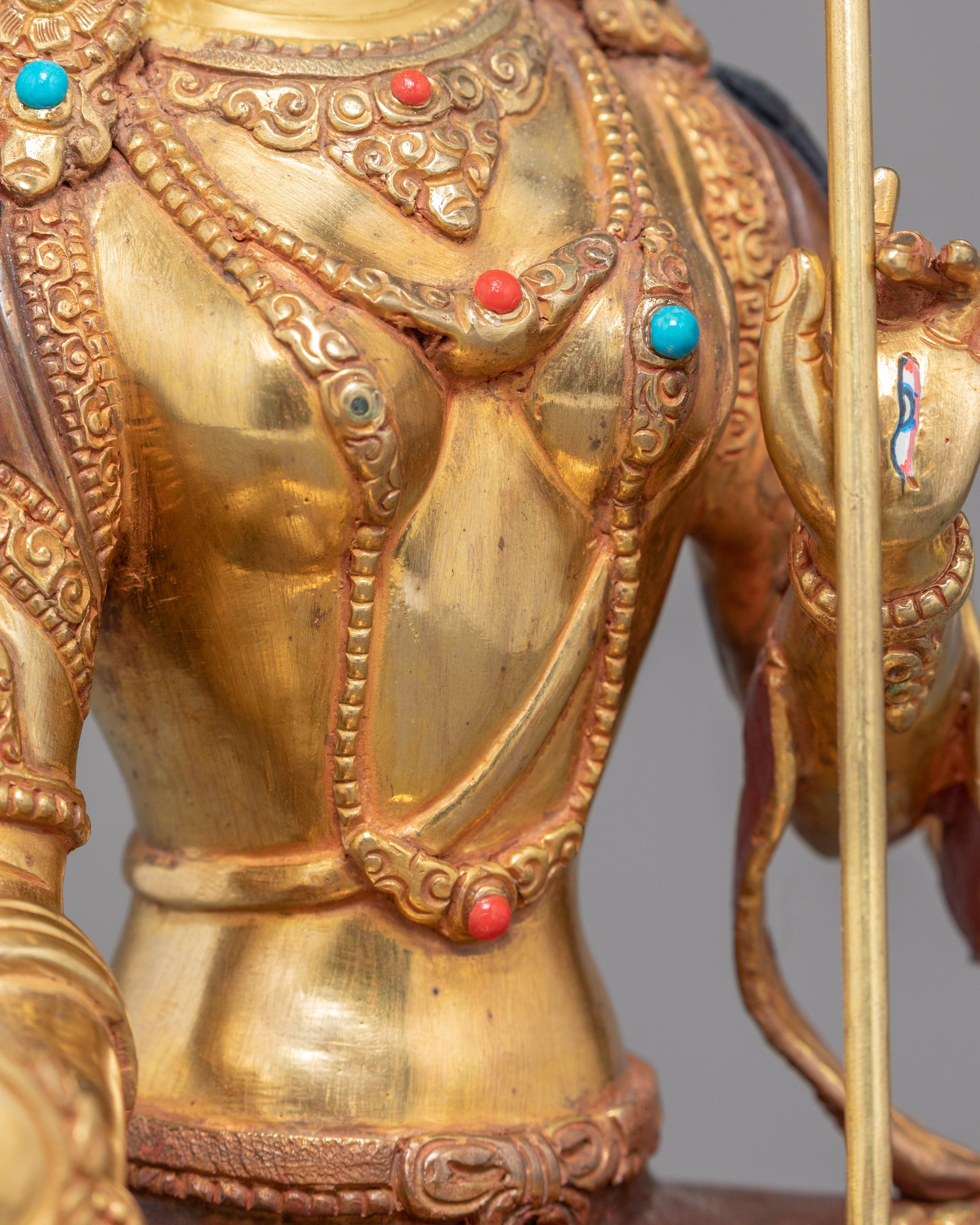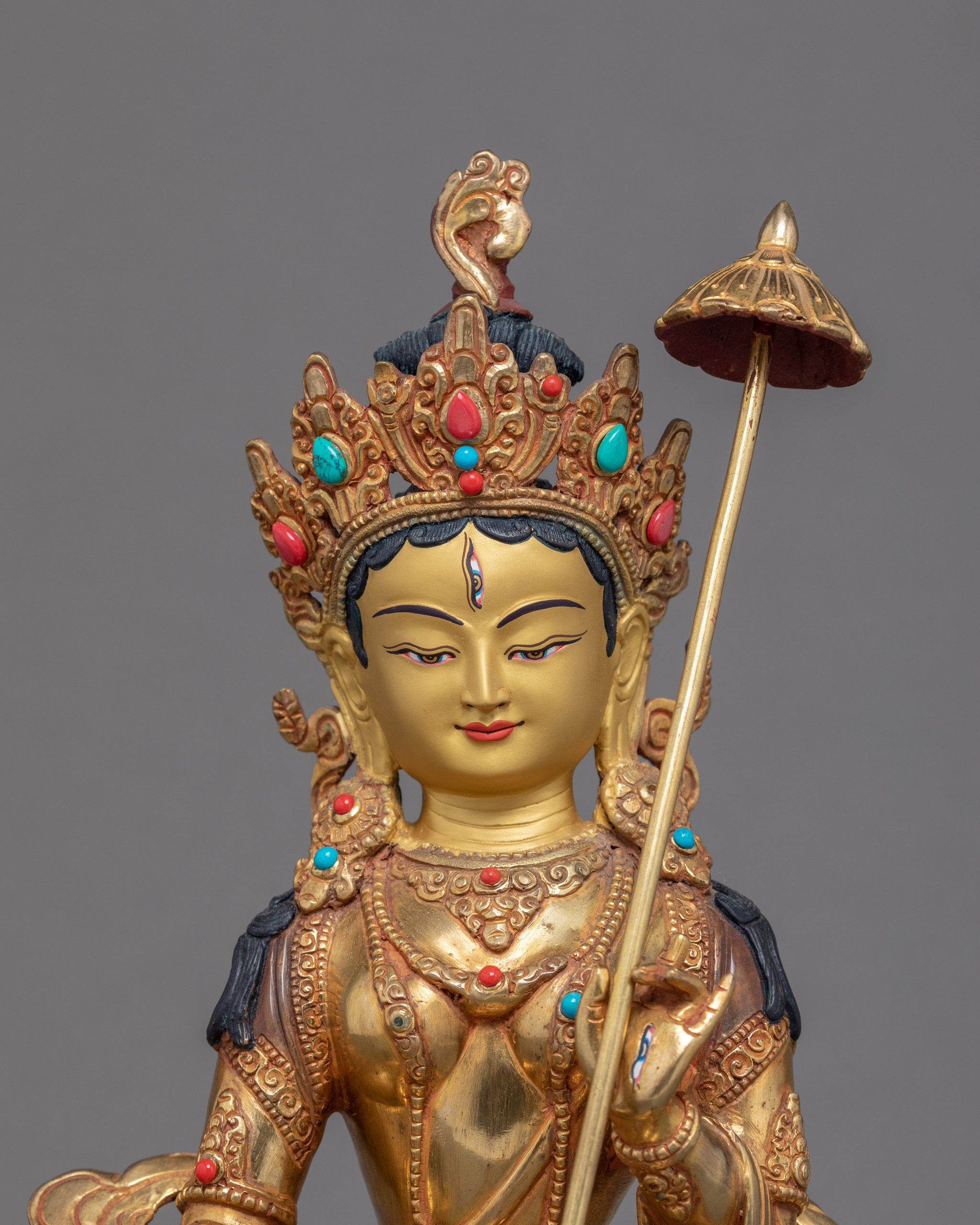 We have magnificently sculpted the sculpture of Dukar in the traditional Himalayan art of Nepal. You can make use of this statue in various Buddhist traditions and ceremonies. It also benefits you for meditational yoga activities and even for gifting purposes. We exquisitely hand-carved the elegant crown by adorning it with rare turquoise and precious gemstones. We have used materials like 24k gold for gilding the statue, copper for carving, and corals and pearls for embellishing. We assure you that the materials are of high quality and endure statue for many years.