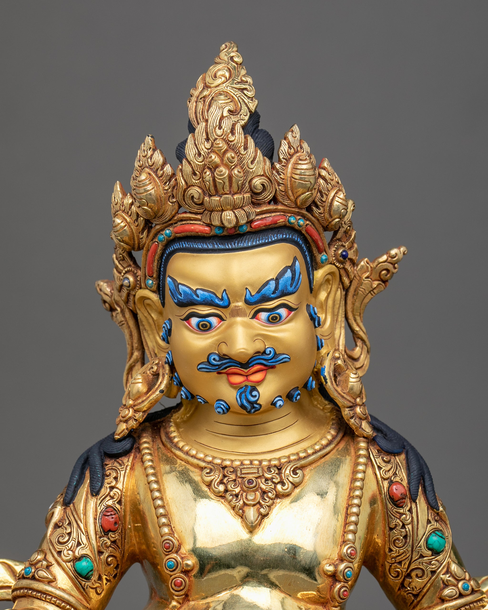 This Dzambhala Copper Statue was crafted by the master craftsmen of Nepal with flawless intricate iconographic details. The statue was molded from a copper body and gilded with genuine 24k gold over the statue. The use of acrylic paint further highlights the carvings on the statue's body. The deity is depicted seated over a moon disc lotus with a semi-wrathful expression as a mongoose rests in his left hand and a citron fruit in his right. Our ability to sculpt these deities into figurines has been passed down through the generations. This particular statue of the Dzambhala took our artists months of hard work to carve the figure and will be the perfect gift for a practitioner like you from Nepal.