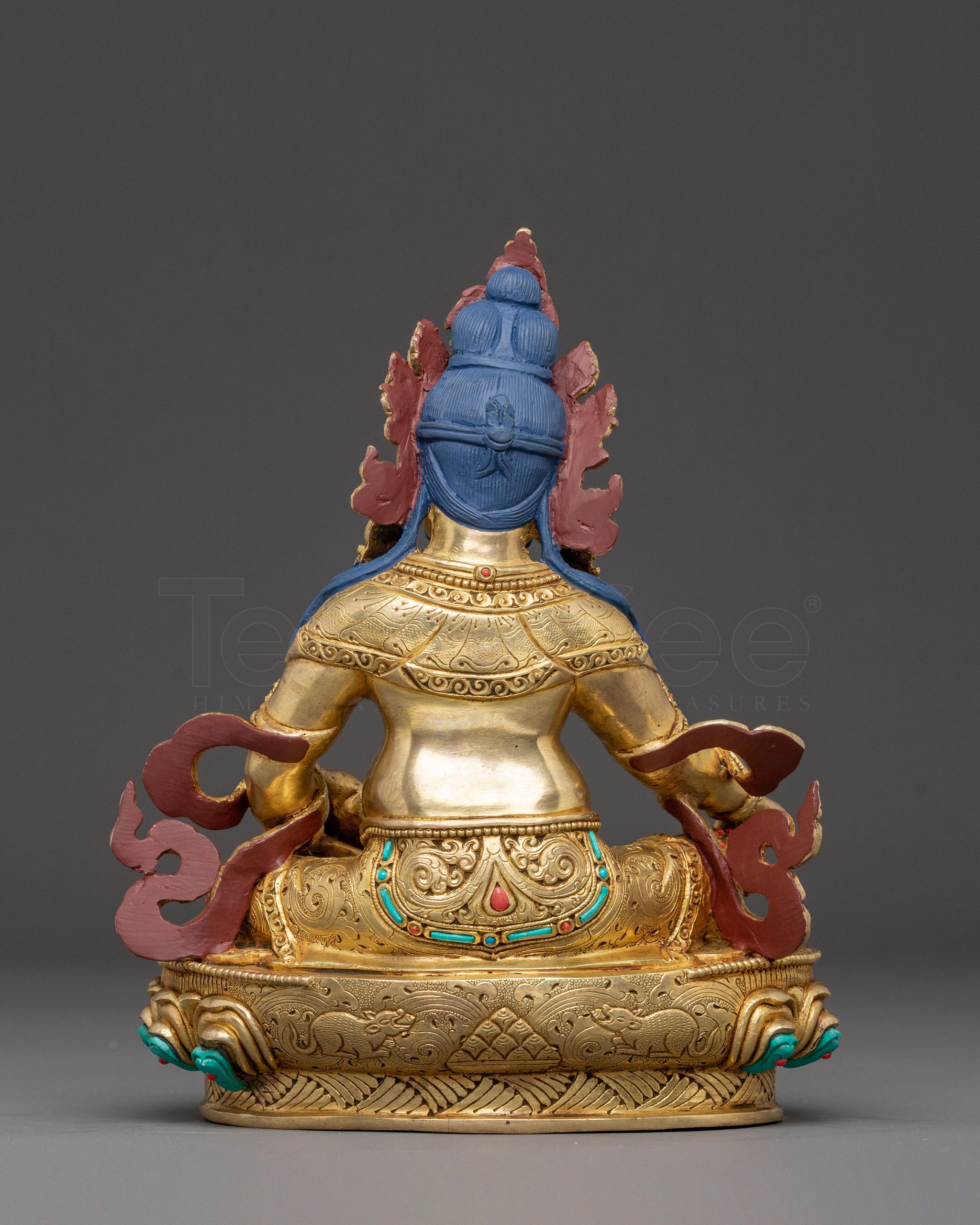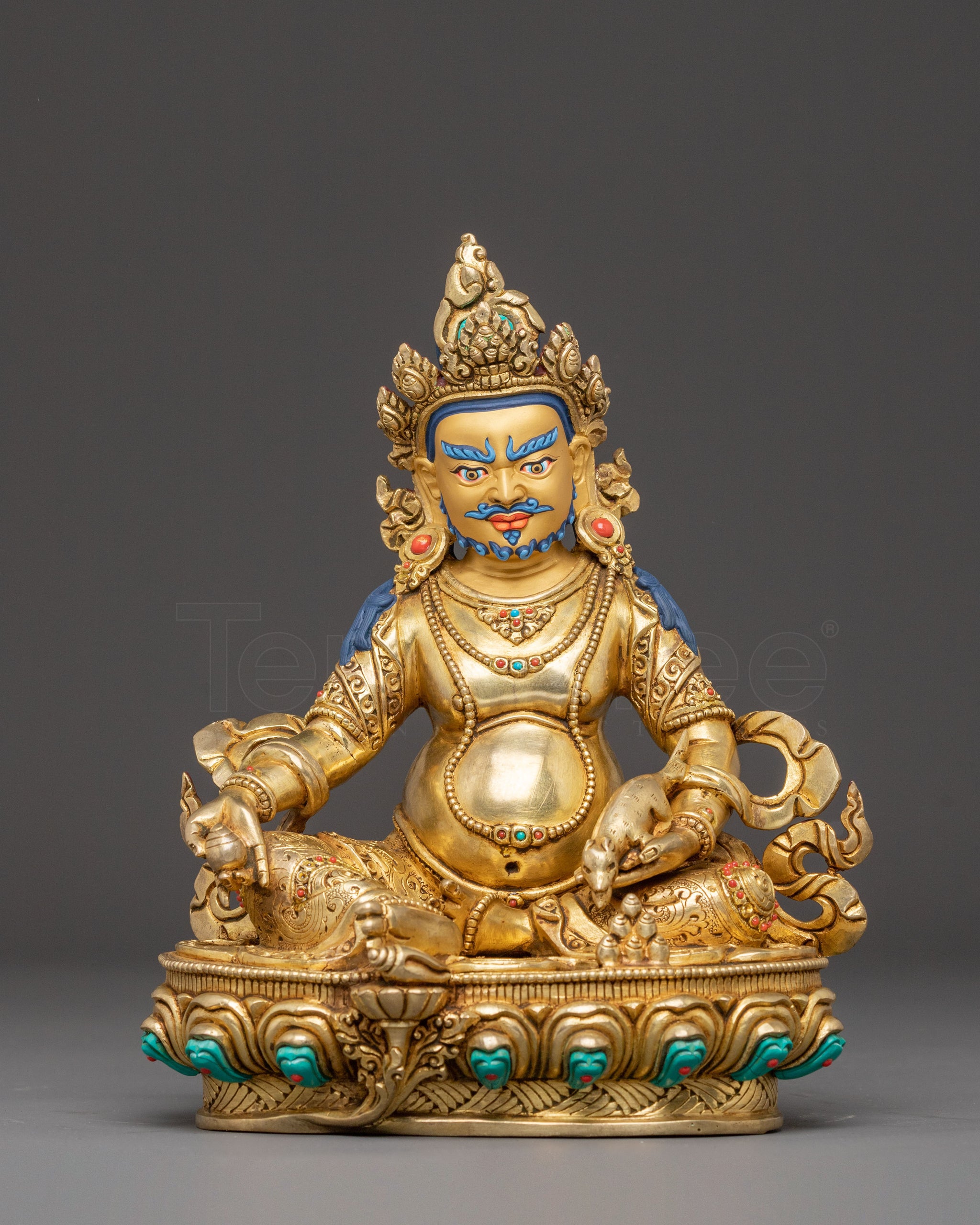 The Dzambhala Copper Statue: The Wealth Deity, is a beautifully sculpted symbol of wealth and success. This statue is made of copper and gilded in bright 24K gold. The statue's exquisitely painted features and colorful gemstones enhance its beauty and spiritual importance. The statue's elaborate design, which includes Dzambhala sitting among lotus petals and holding a mongoose that spouts jewels, represents the deity's capacity to bestow riches and remove financial obstacles.