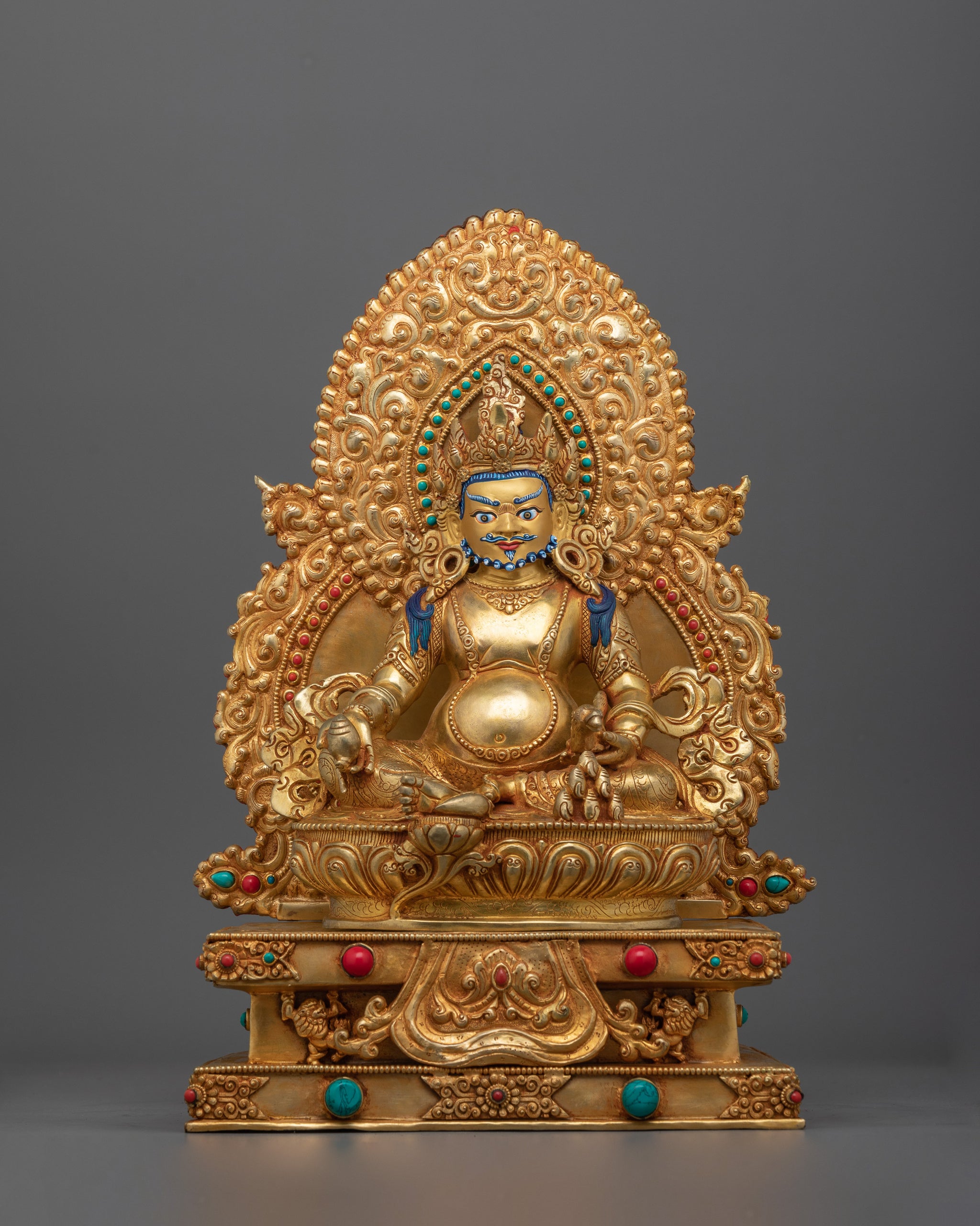 The Sacred Altar Dzambhala Figurine is carved on a durable copper body and finished with 24K gold gilding for a beautiful appearance. The figurine's throne has been gold electroplated, adding to its grandeur and longevity. This gorgeous item is further enhanced with gold and acrylic paintings, which highlight the intricate designs and brilliant colors. Hand-carved jewels are precisely inlaid, lending an amazing touch to the statue while also strengthening its spiritual importance. With a height of 13.6 inches (34.5 cm), a base of 9.4 inches (24 cm), and a weight of 2.67 kg, this statue is an ideal combination of craftsmanship and devotion, making it an eye-catching addition to any sacred shrine.