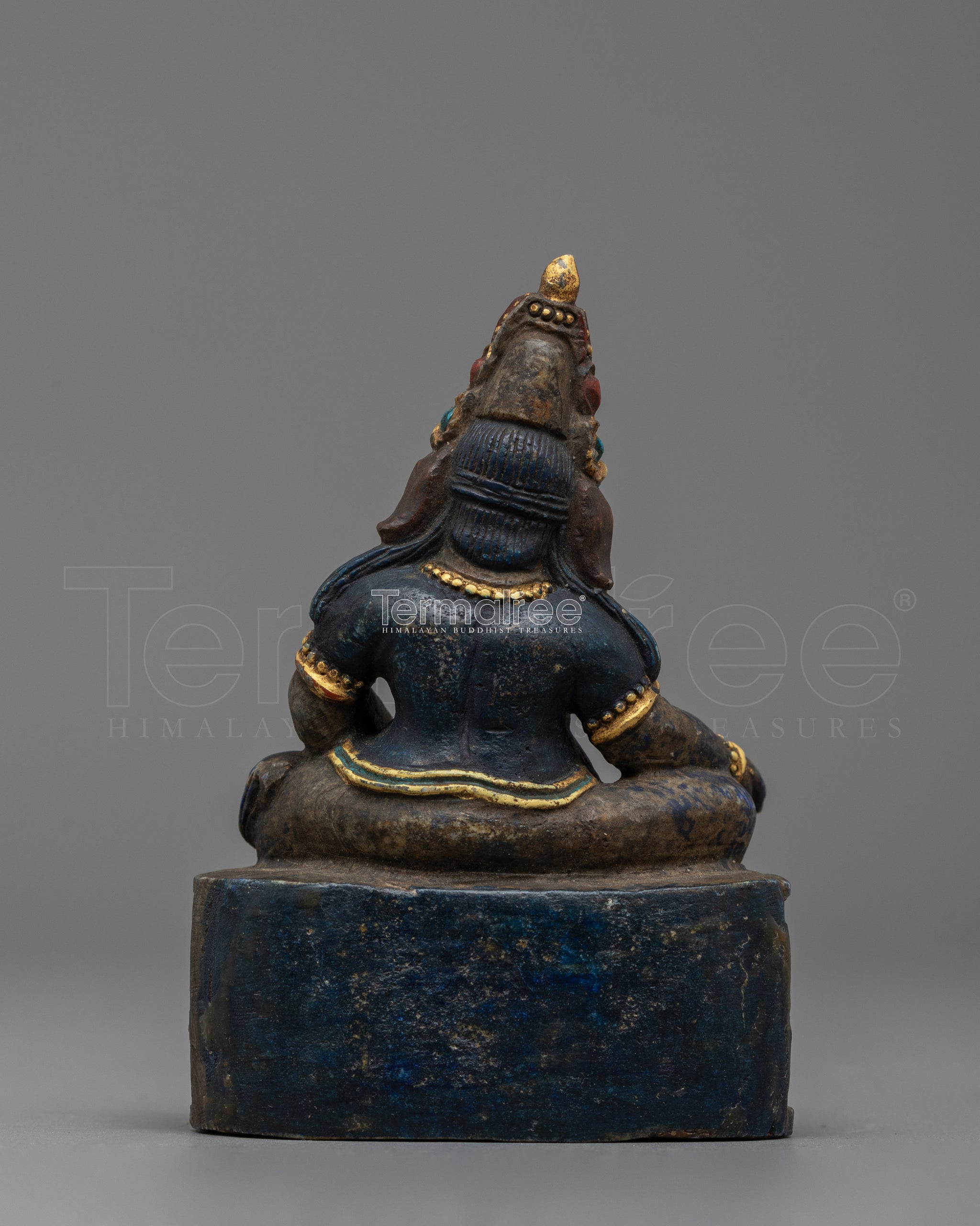 This Dzambhala lapis stone statue with exquisite gold face paint, is a magnificent work of art. The copper highlights show the fine detailing of his seated stance, regal countenance, and the sacred mongoose he wields—a sign of giving that emits infinite riches. Each element is painstakingly crafted by expert artisans in Patan, Nepal, demonstrating their dedication and artistry.