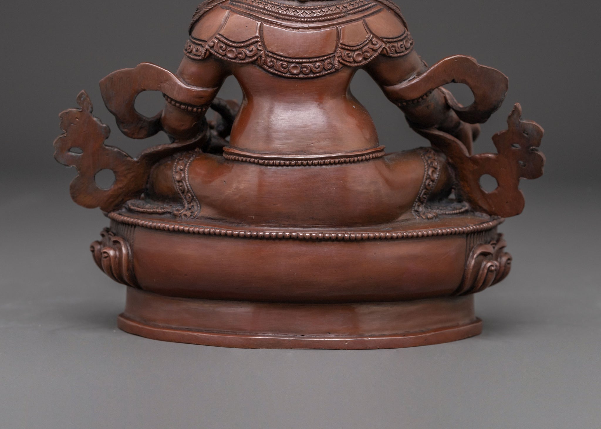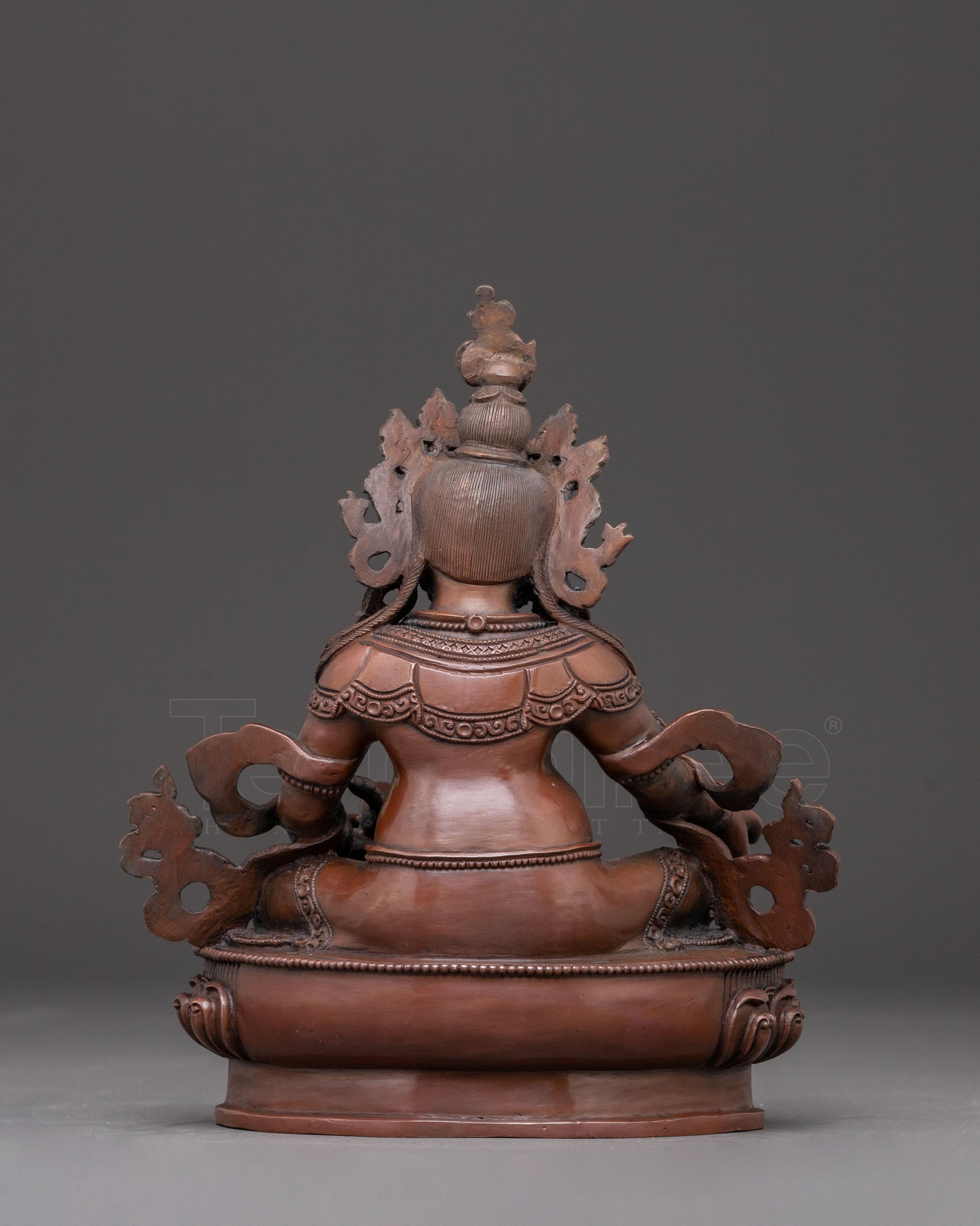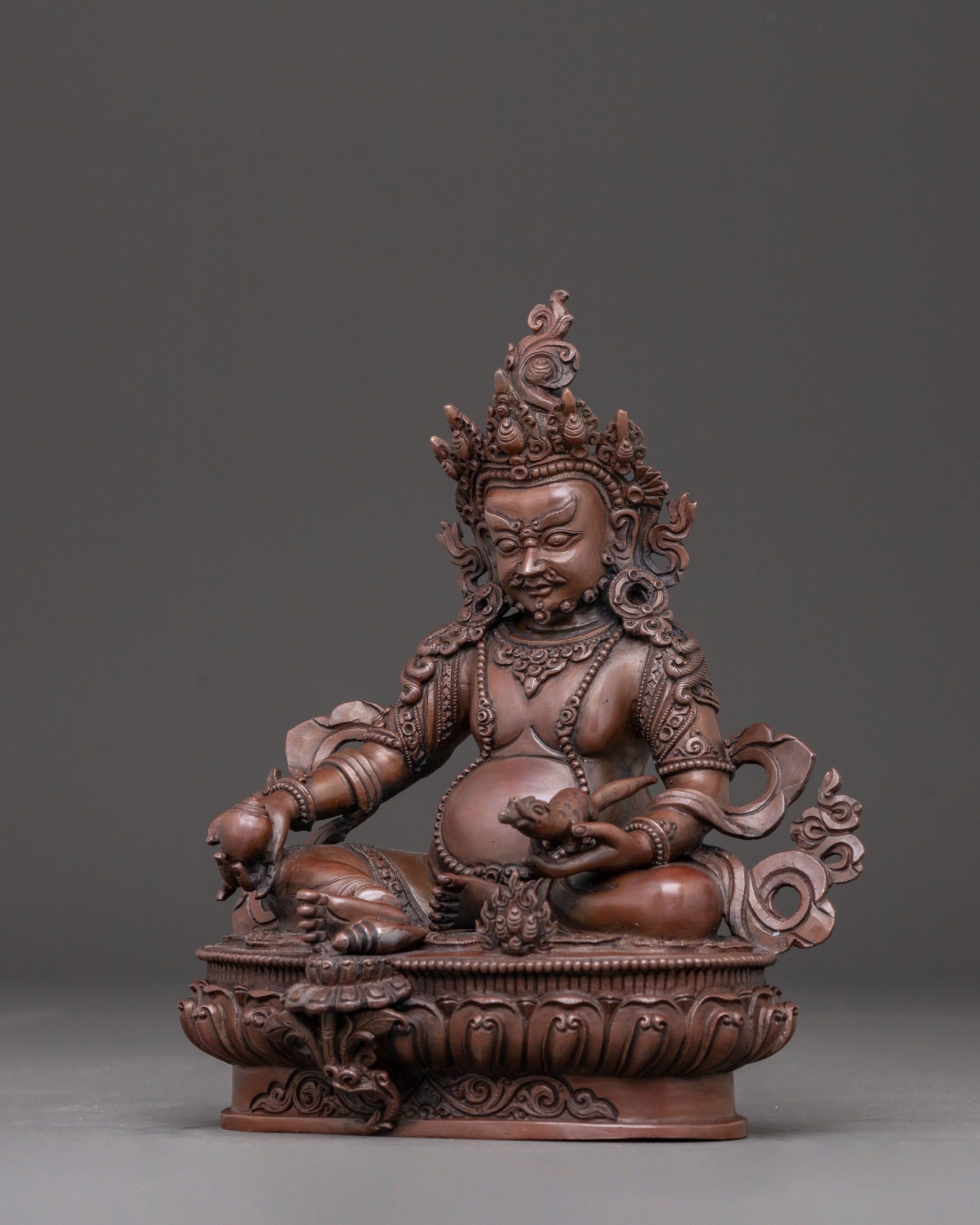 Dzambhala is shown sitting, holding a mongoose in his left hand to represent the removal of material and spiritual impediments, while his right hand holds a precious "mani" citron fruit. Dzambhala's strong yet sympathetic visage reminds practitioners of his protective nature and capacity to alleviate poverty by providing spiritual and practical gifts. The intricate engravings on his flowing robes, ornaments, and religious symbols demonstrate amazing craftsmanship, making this statue a reminder of the blessings of abundance and generosity.