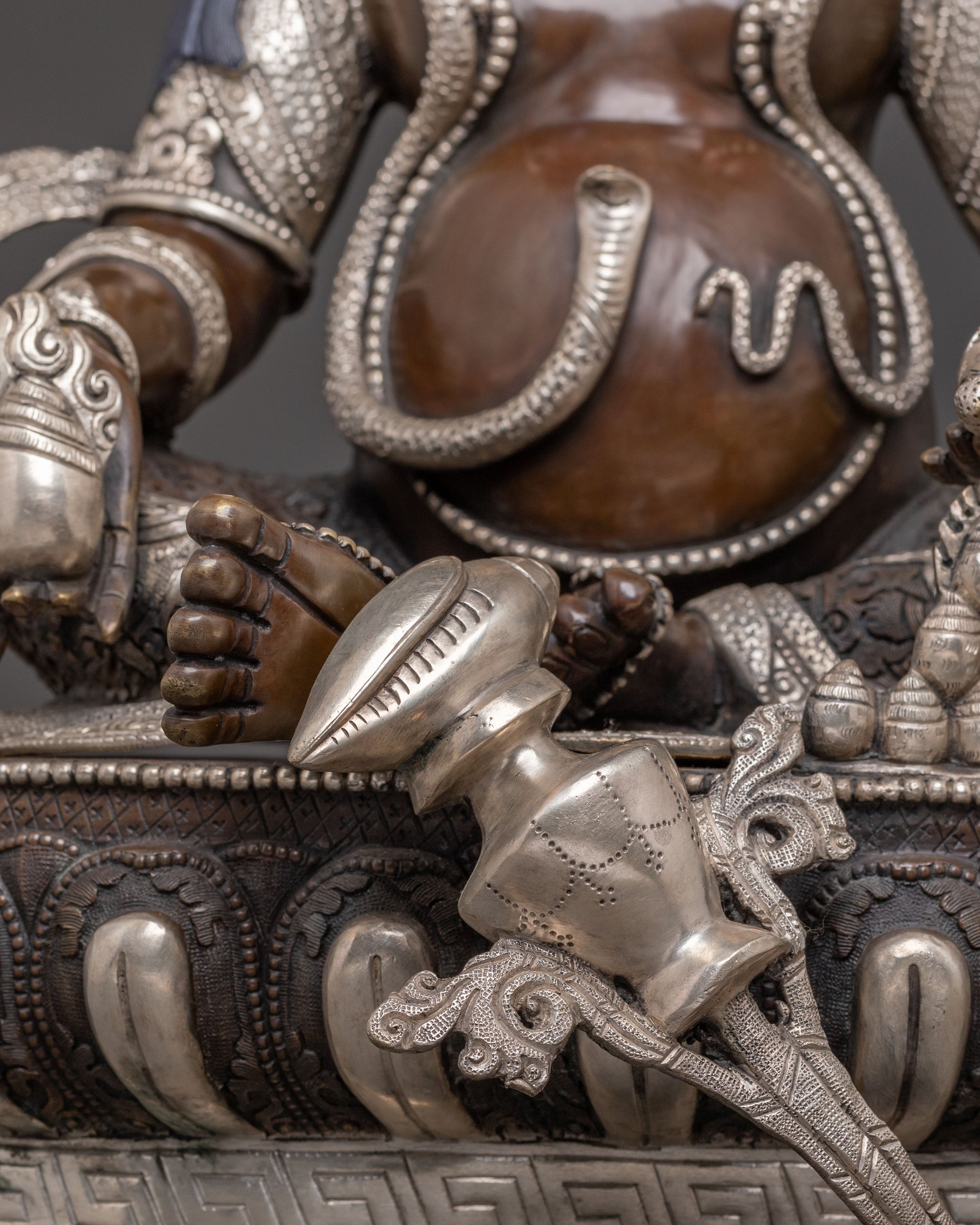 Emanating a benevolent and powerful aura, this exquisite Dzambhala sacred statue offers a profound connection to both spiritual and material abundance. Standing at an impressive 51cm (20 inches), this substantial oxidised copper form, elegantly silver electroplated, radiates a commanding yet deeply compassionate presence. Every intricate detail, from his serene expression to the dynamic flow of his garments, has been rendered with exceptional artistry, capturing the deity's transformative essence.