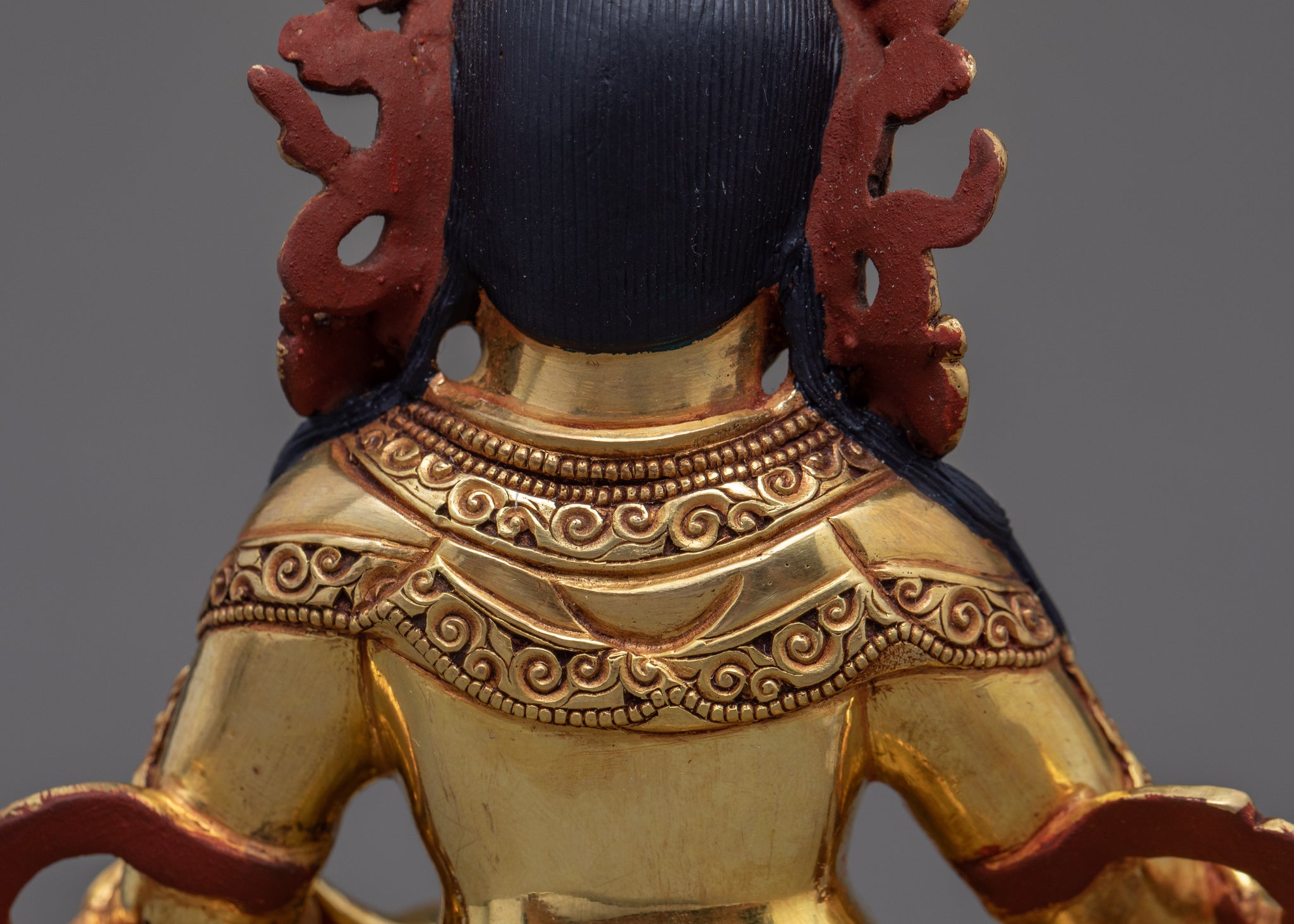 Dzambhala is the lord of wealth and the guardian of the northern direction. This beautiful statue was sculpted by our experienced artists based in Kathmandu, Nepal, and is sculpted on a copper body, gilded with pure 24k Gold. This Dzambhala Statue has a piercing gaze expression on his face and sits in a royal posture. He carries a citrus fruit on his right and a mongoose on his left.