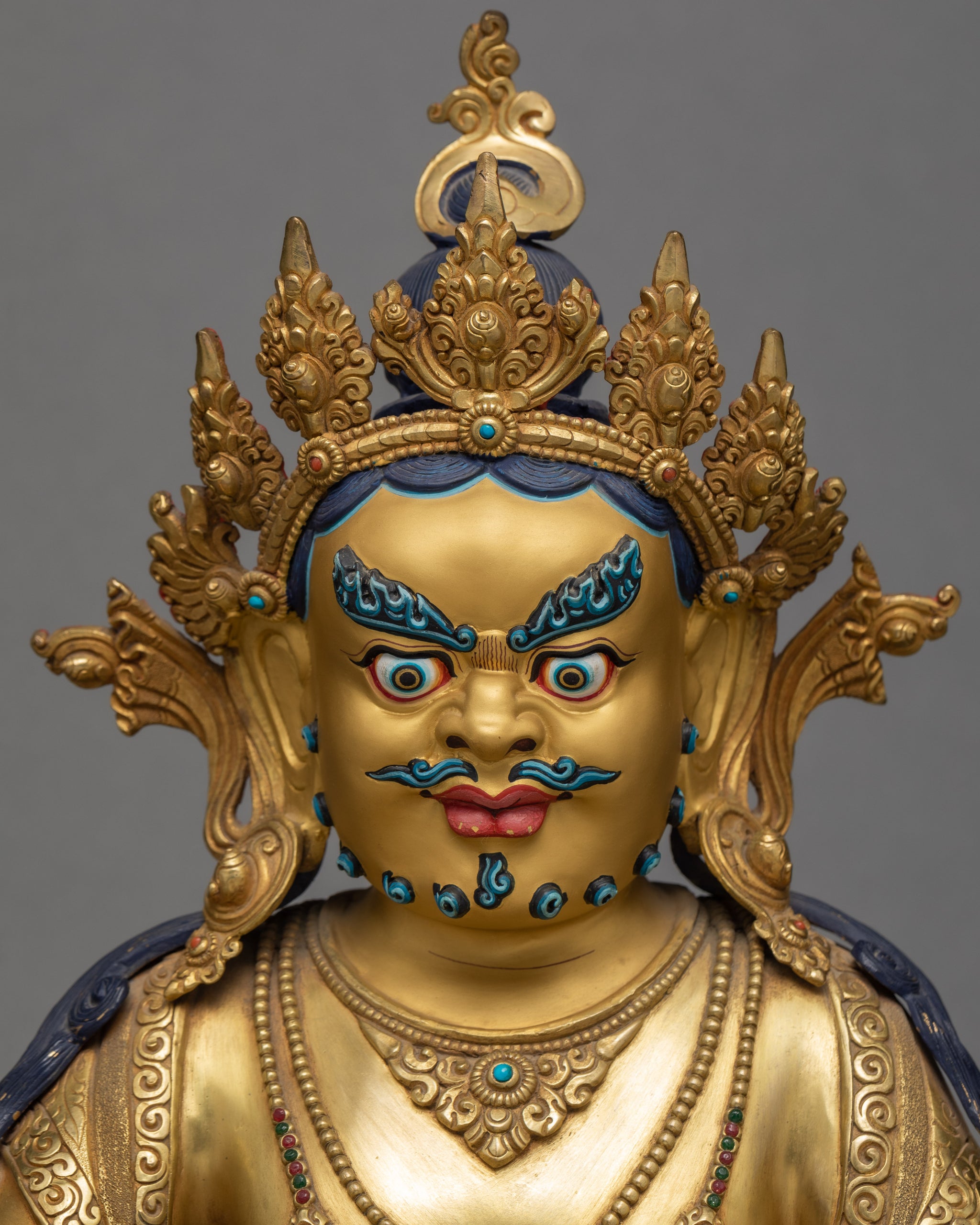 Dzambala has a semi-peaceful expression of subtle wrath and splendor. The statue is purely gilded with gold, finished with expert artistry and skill. The minute details, as well as the combination of golden and the occasional blue features, give it a very aesthetic and unique look. It pleases the eyes, and helps you in your practices.
