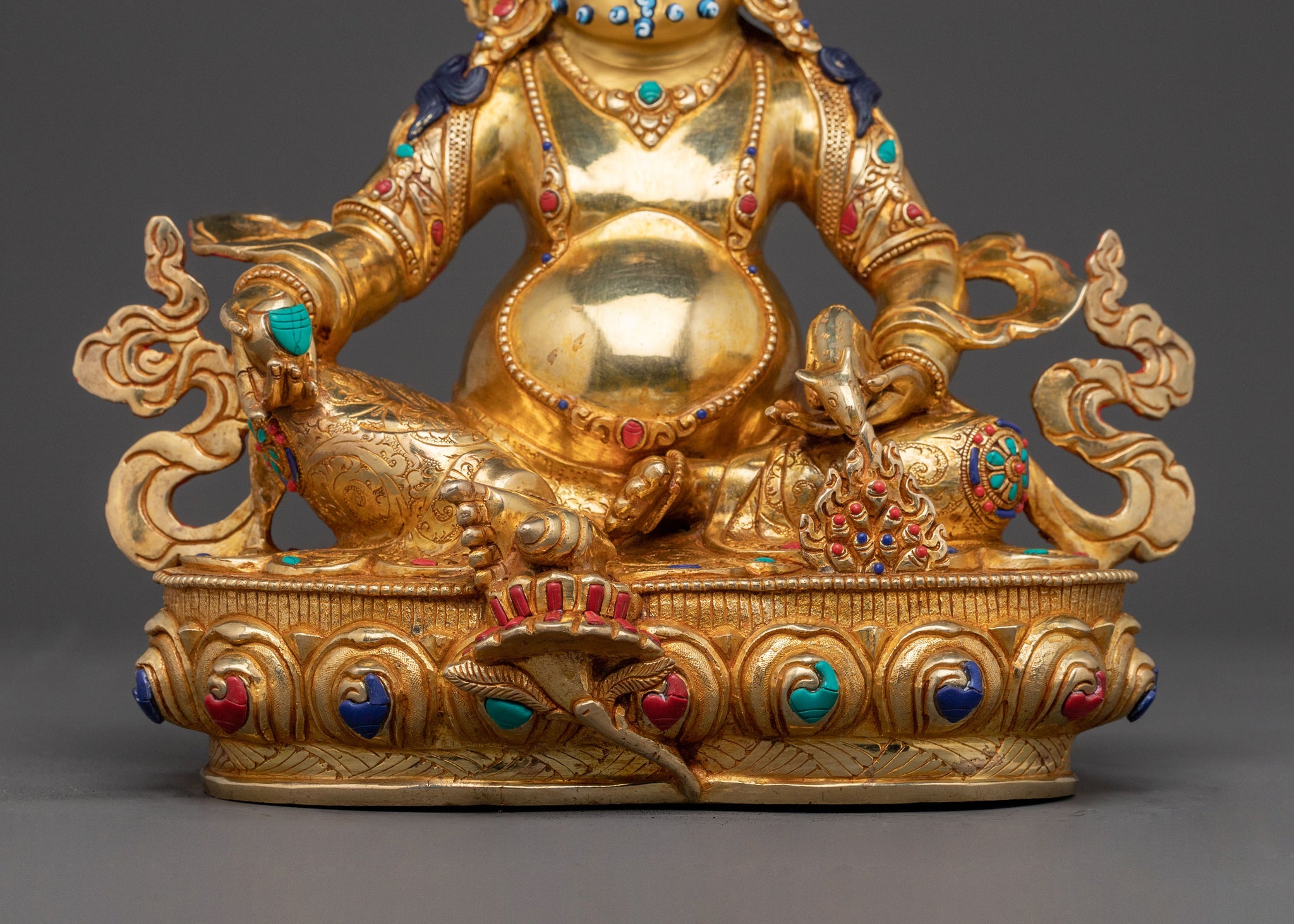 Born from the esteemed tradition of Nepalese artisans, this Buddhist art piece showcases authentic Himalayan craftsmanship. The copper core is expertly shaped and then meticulously covered with radiant 24K gold gilding, highlighting every intricate detail. Delicate acrylic paintings add depth to Dzambhala's features and robes, while carefully placed gemstones imbue the spiritual decor with an aura of preciousness and sacred artistry.