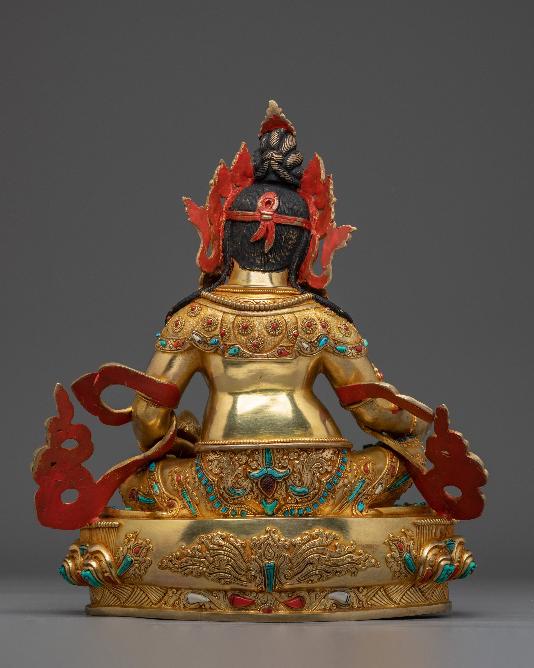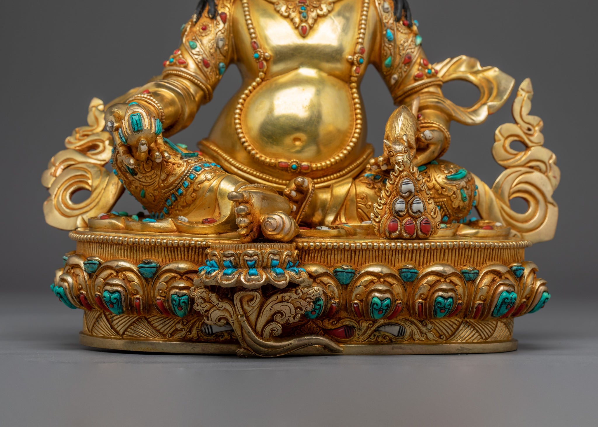 Dzambhala is traditionally depicted in a regal posture, symbolizing his royal status as the Lord of Wealth. In his right hand, he holds a citron fruit, which represents fertility, prosperity, and the nourishment of spiritual and material wealth. His left hand holds a mongoose that is shown spitting jewels, symbolizing the endless granting of riches and abundance. The radiant crown adorning his head signifies his enlightened authority, while the lotus base beneath him reflects purity, spiritual awakening, and the flourishing of prosperity in both worldly and spiritual realms.