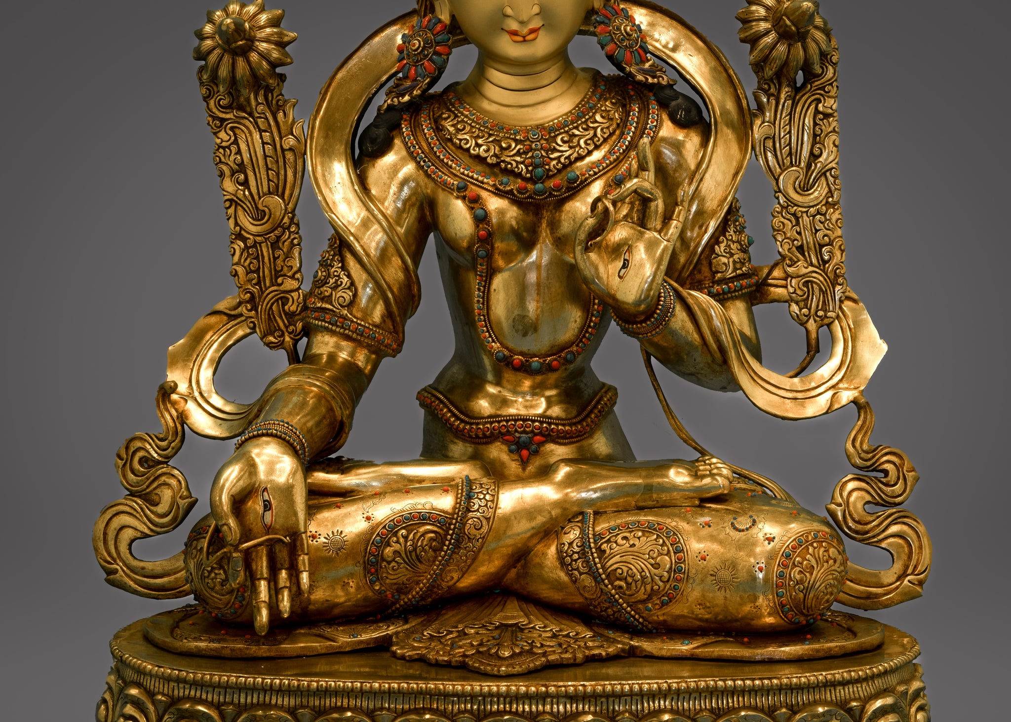 The Elegant White Tara Figure is a lovely representation of elegance, beauty, and enlightenment that will help you surround yourself with divine compassion. This statue, which is expertly created, encourages you to witness White Tara's beauty. It is revered and admired, standing thirty-two inches tall and twenty-four inches wide. This figurine, which is made of 24K gold-gilded copper, embodies a divine aura and encourages deep reflection and spiritual development. Put it somewhere you can see it clearly and feel its presence enhancing your spiritual practice.