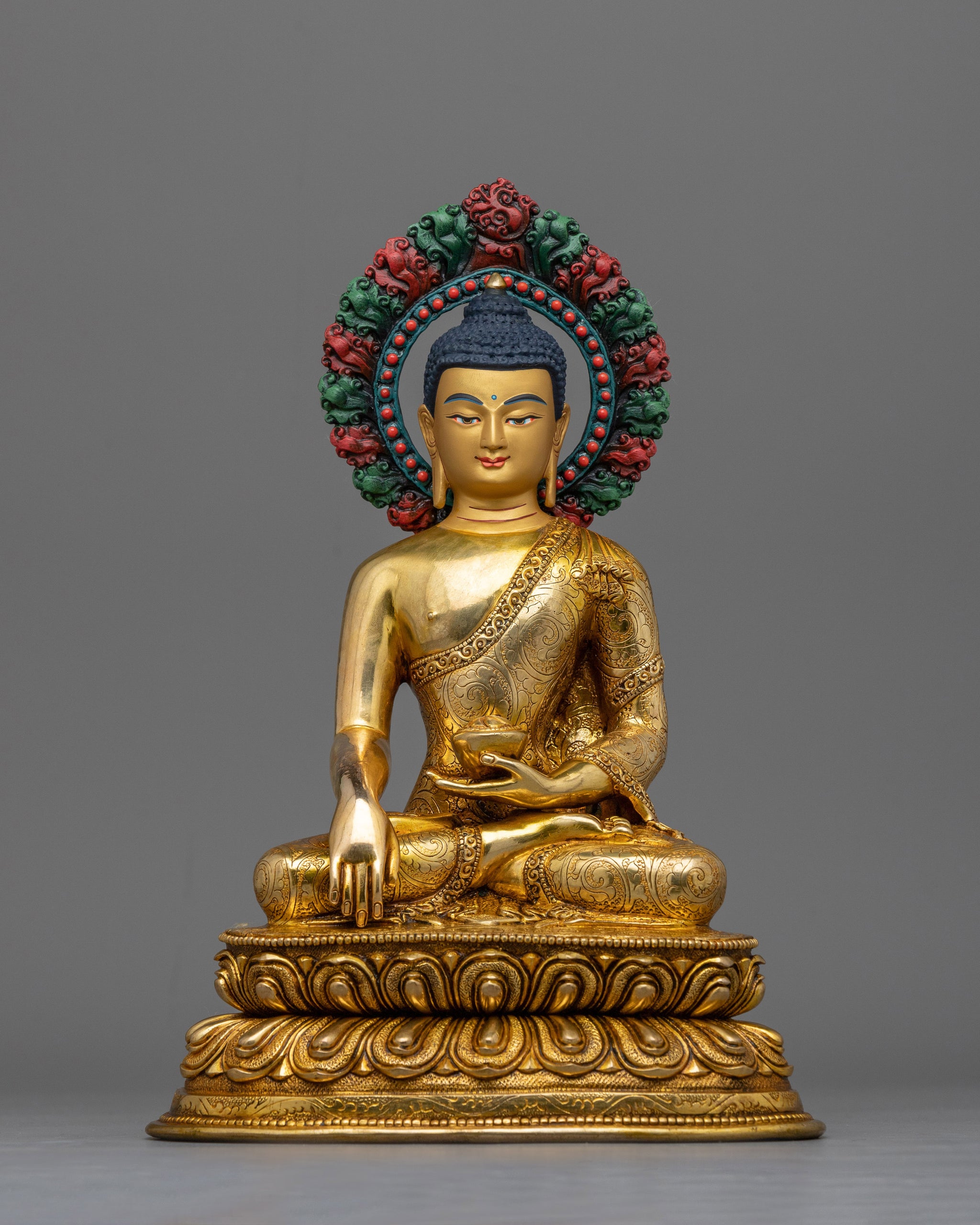 Explore the intricate significance of our Enlighten Shakyamuni Buddha Statue, which represents enlightenment and spiritual awakening. Shakyamuni Buddha is a lighthouse, guiding individuals toward freedom from suffering with his calm countenance and kind manner. This statue, which is 11.4 inches in height and 7.9 inches at the base, represents the transformation from ignorance to wisdom and from darkness to illumination. The statue's elaborate paintings in gold and acrylic accentuate its hallowed the atmosphere, beckoning practitioners to discover inner peace and freedom by connecting with the core of Buddha's teachings.