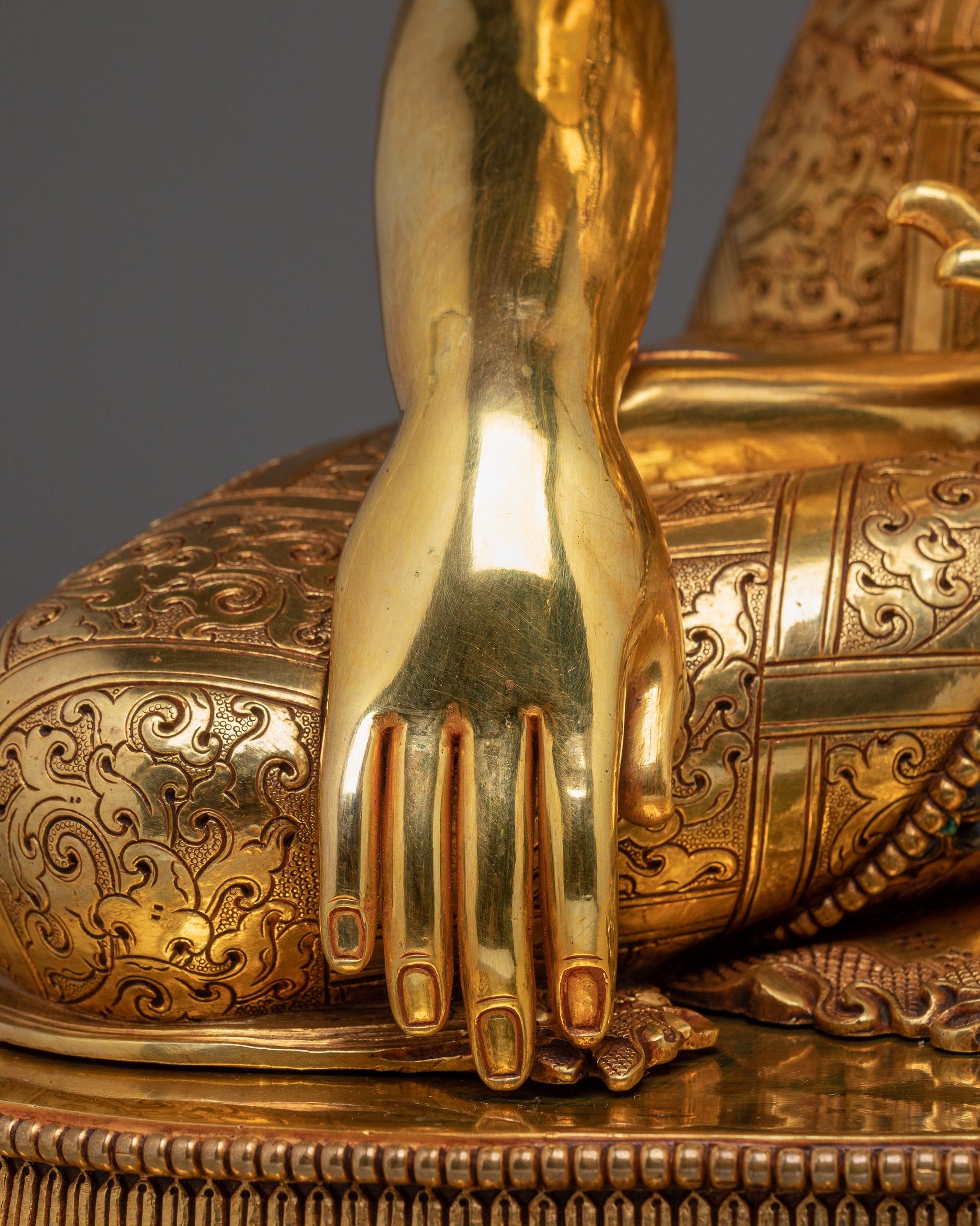Shakyamuni Buddha is depicted sitting in the lotus pose (padmasana), indicating his steady concentration and mastery over the distractions of the material world. His right hand stretched toward the earth in bhumisparsha mudra represents his moment of enlightenment, inviting the earth to witness his waking. The left hand, lying gently in his lap in dhyana mudra holding an alms bowl depicts the profound state of meditation and mindfulness that leads to insight and clarity.