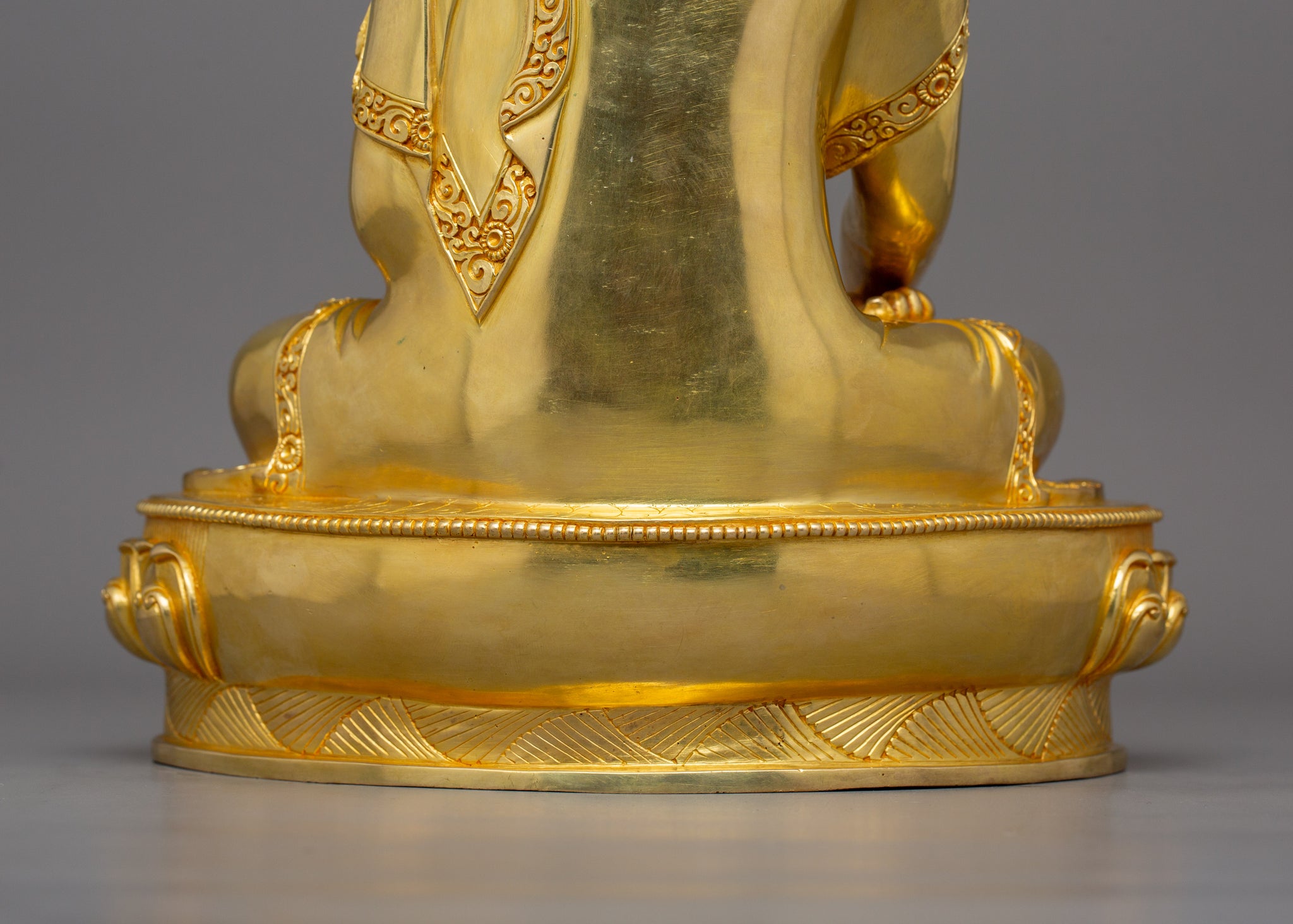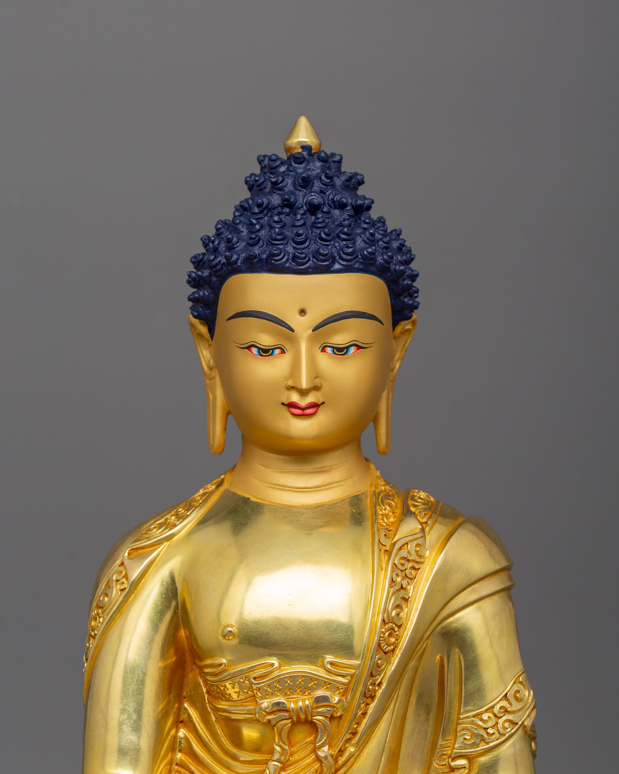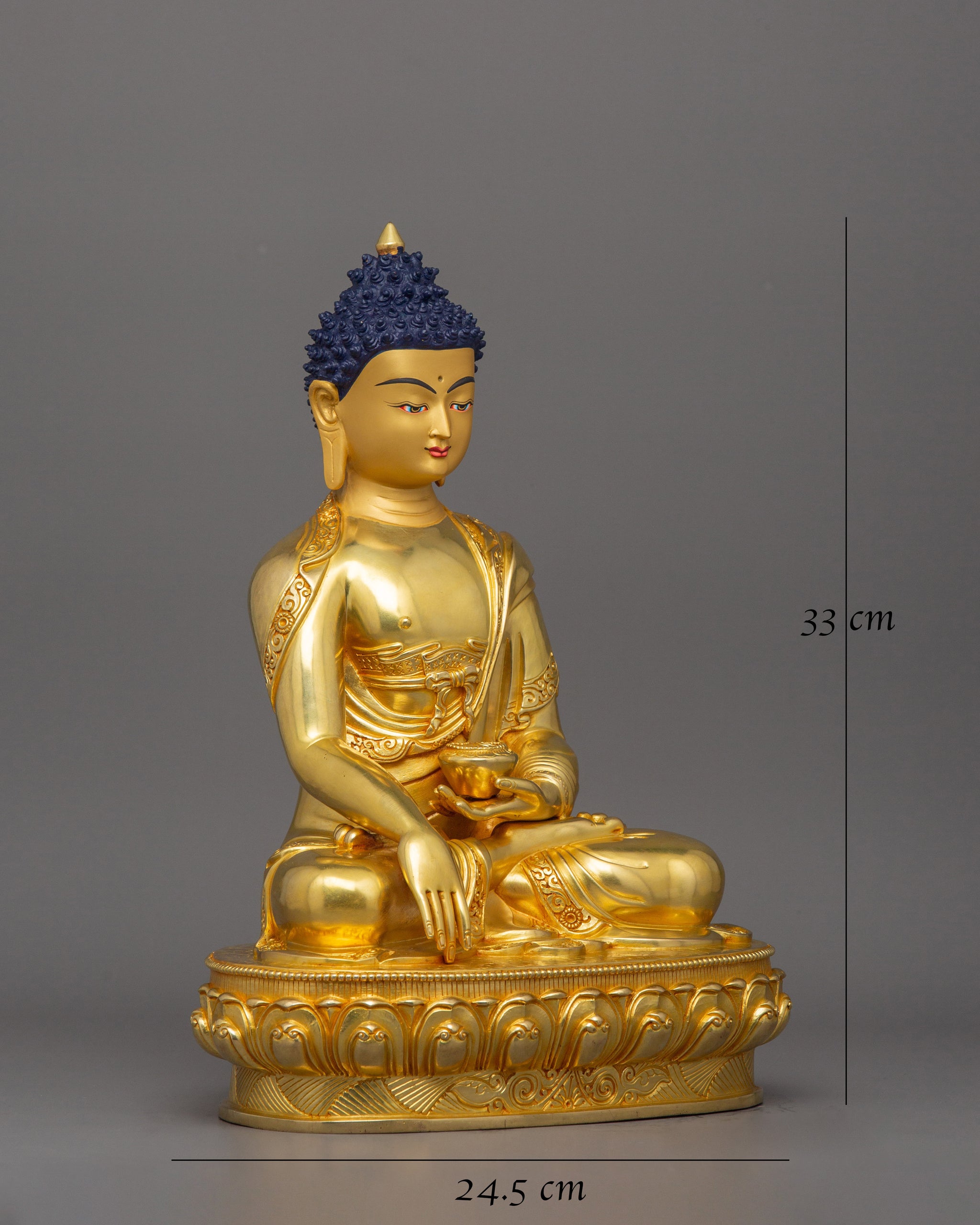 The Enlightened Tibetan Buddha Shakyamuni statue, measuring at 13.0”/33 cm in height with a 9.6”/24.5 cm base and weighs 3.77 kg. This statue depicts Shakyamuni Buddha, the historical Buddha, in a serene and meditative posture, symbolizing enlightenment and inner peace. It is made with 24K gold gilded, gold and acrylic paintings and copper body. Designed by talented Nepalese artisans, this detailed sculpture is ideal for altars, meditation areas, or as a meaningful decor item for individuals seeking awareness in their daily life.