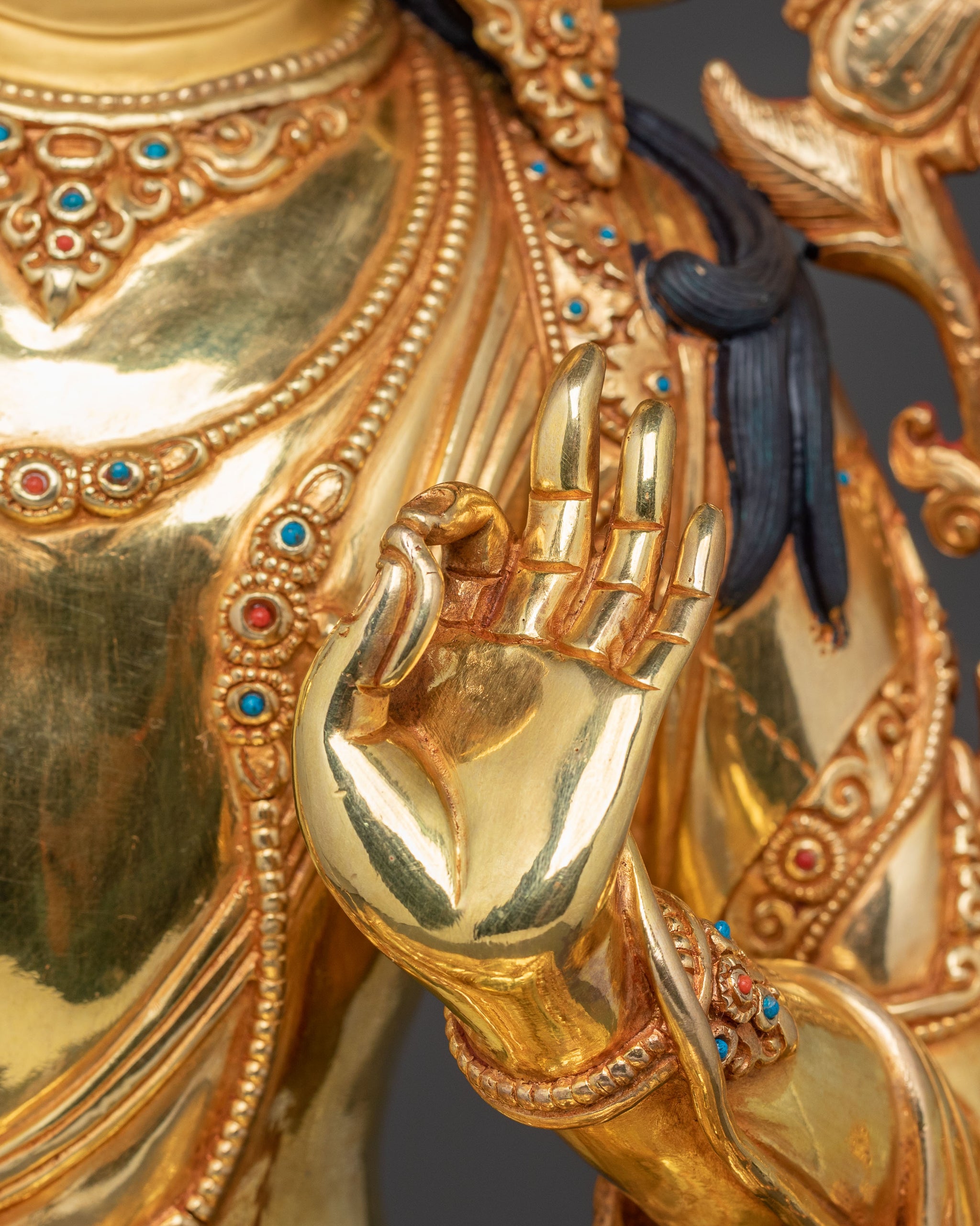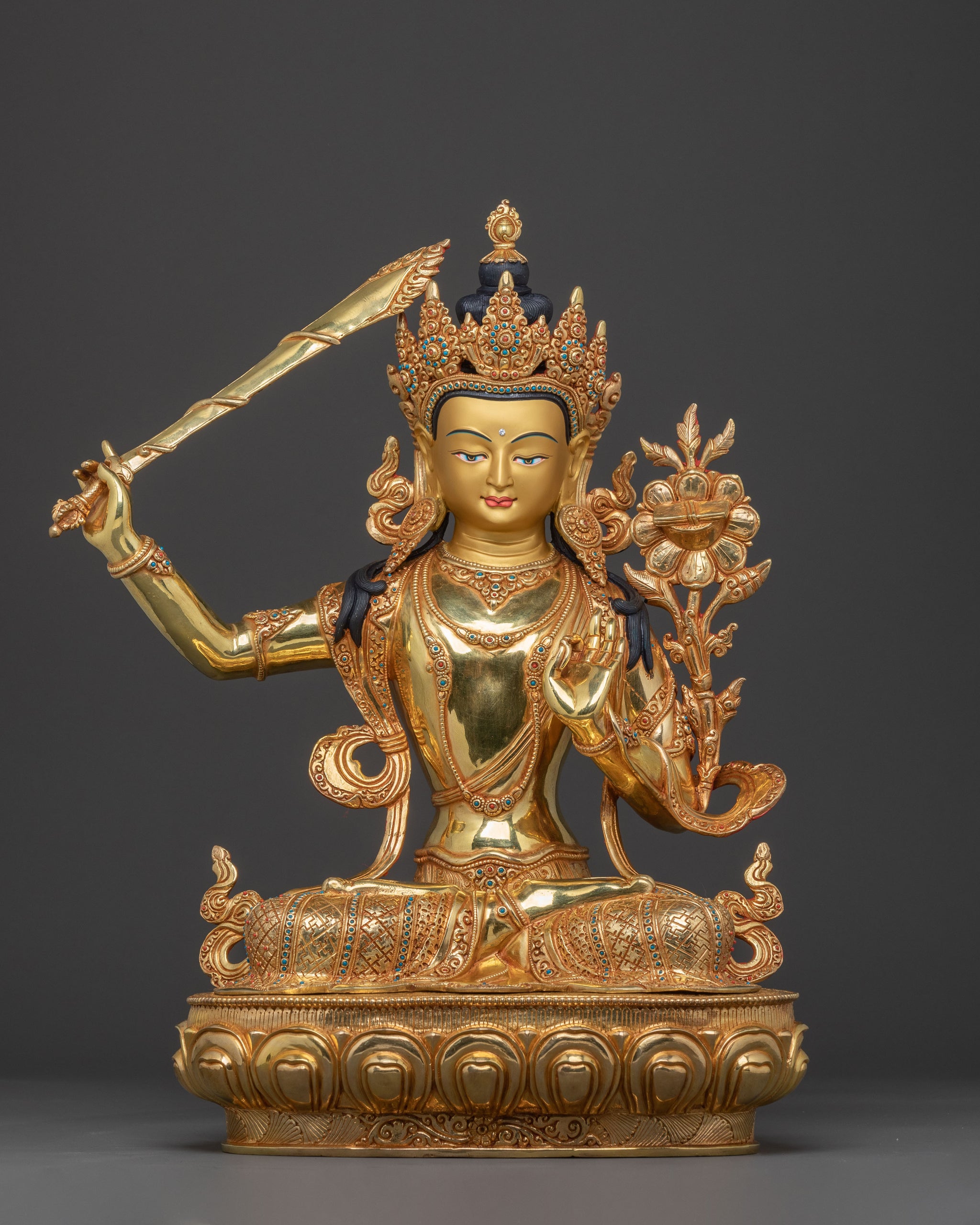 This statue, standing 19.7 inches (50 cm) tall with a 14.2-inch (36 cm) base, comes from the esteemed lineage of Nepalese artisans. Handcrafted from copper and carefully gilded with radiant 24K gold, it exudes enlightened wisdom and poised grace. Weighing 8.43 kg, this masterpiece is adorned with intricate acrylic paintings and vibrant gemstones, making it a stunning focal point for any sacred space or spiritual decor. Its exceptional craftsmanship and spiritual depth showcase the pinnacle of Himalayan artistry, embodying the essence of wisdom and enlightenment.