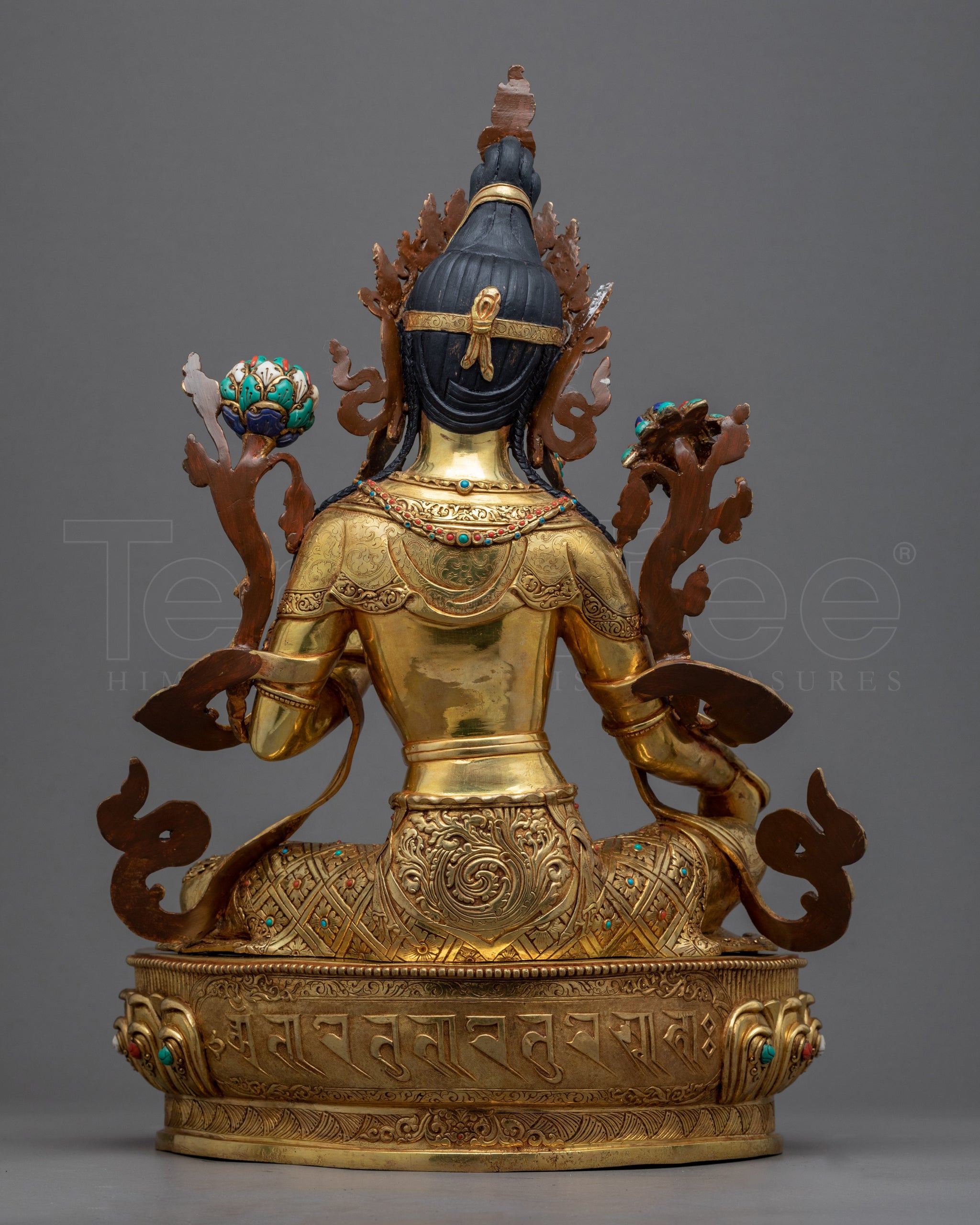 Our studio made the hand-carved Female Buddha Sculpture according to ancient Himalayan art techniques. It emphasizes the exquisite carvings on the statue's body and is molded from a copper body skillfully gilded in 24k real gold. The deity is seen sitting on a lotus moon disc lotus with her left hand making the Prithvi Mudra, which symbolizes the combination of wisdom and compassion, and her right hand making the gesture of offering shelter. We have adorned the deity with precious gemstones on the crown, body ornaments like necklaces, anklets, bracelets, lotus seats, and an utpala. We assure you that the materials used to create this figurine are of the highest quality.