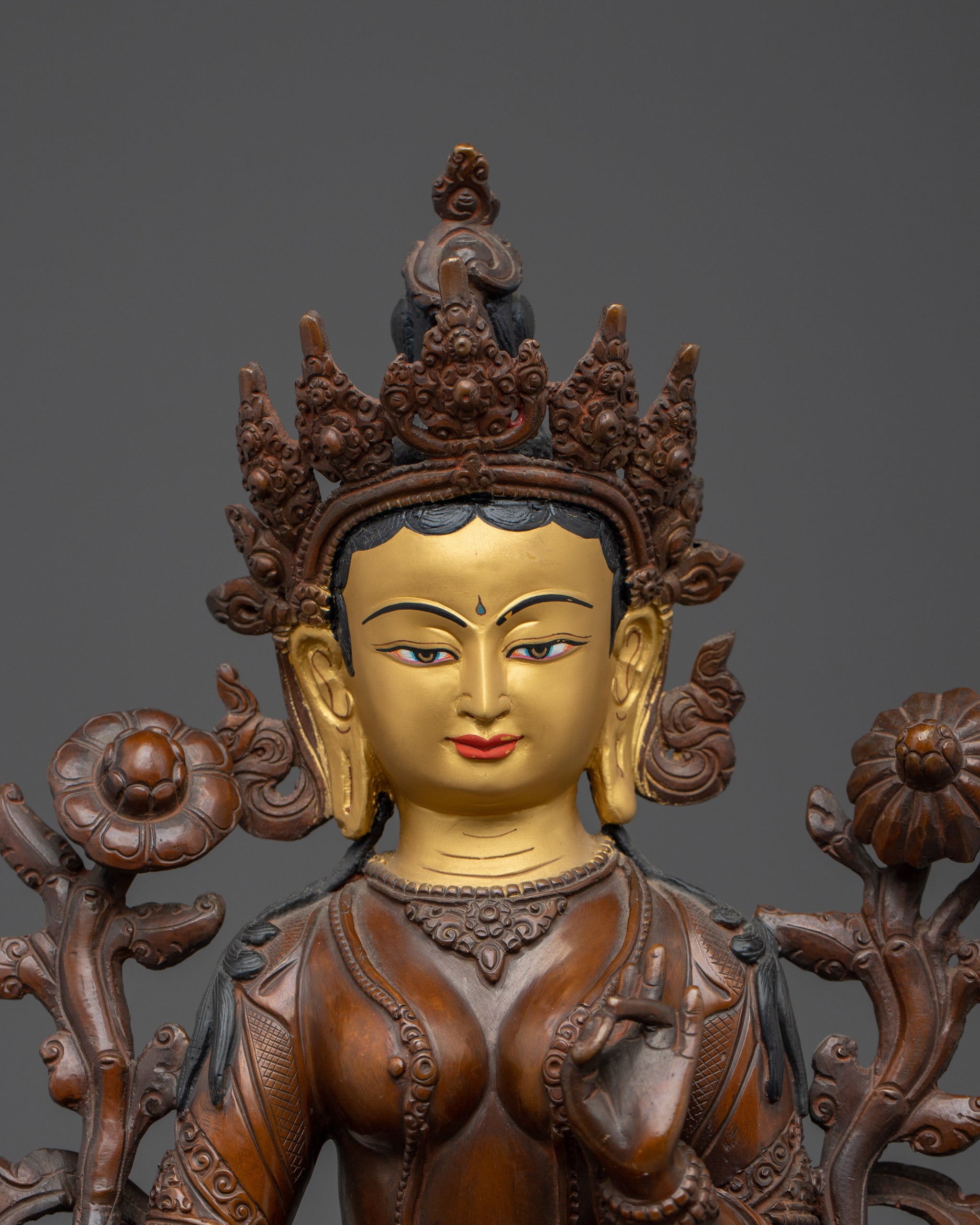 As depicted, Green Tara is shown seated on a lotus throne with her right leg typically extended forward, signifying her active compassion and willingness to help. Her hands express profound meaning through their gestures; the right hand is displayed in the "gesture of giving" (Varada Mudra), symbolizing her boundless generosity and willingness to provide blessings. Meanwhile, her left hand delicately holds a blue lotus (Utpala), a symbol of purity and spiritual awakening, offering protection and reassurance to those who seek her guidance.
