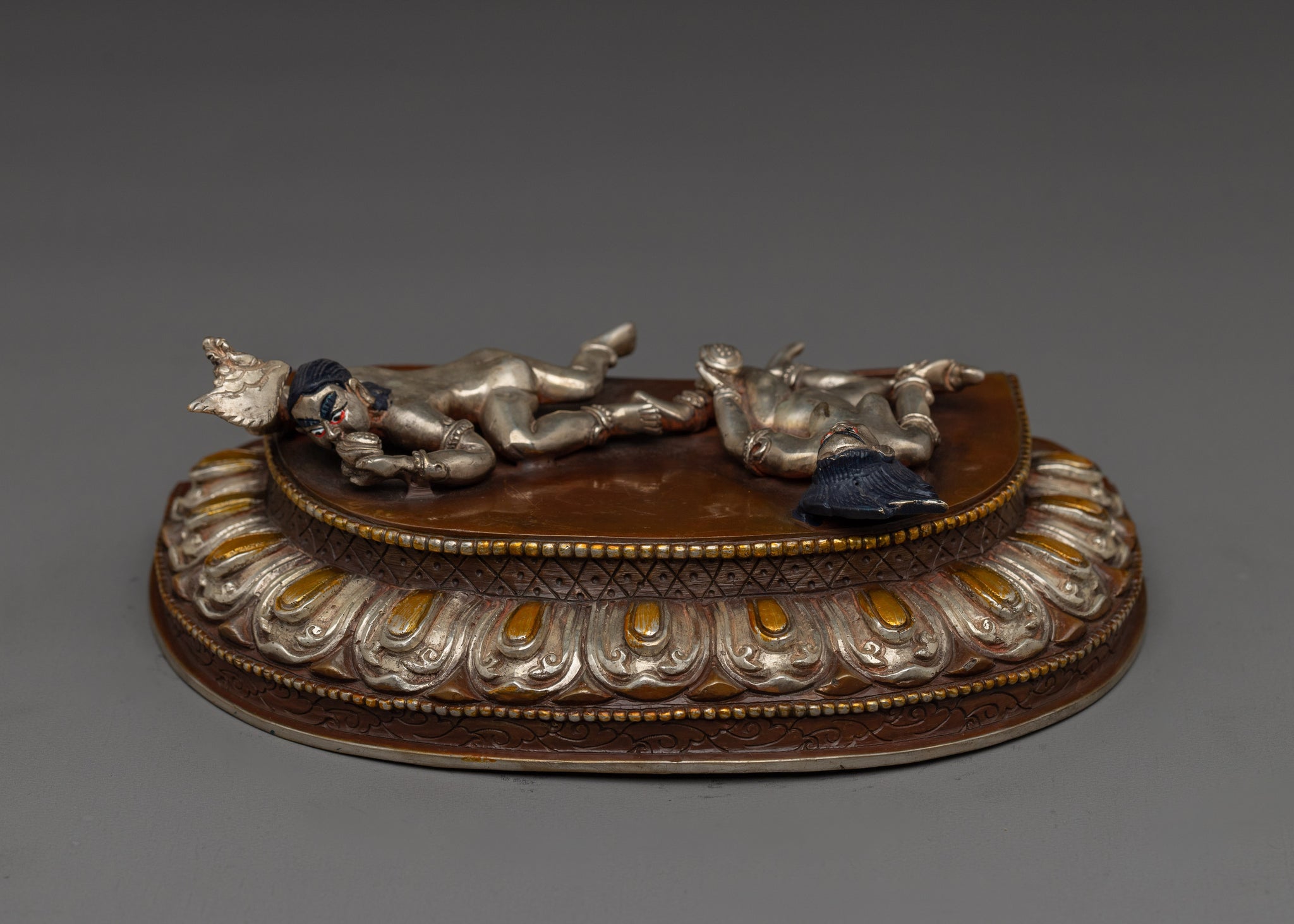 The Four-Armed Mahakala, renowned as a fearsome protector deity in the Buddhist pantheon, embodies a fierce but caring force. When shown with his consort, it represents the peaceful interaction of two energies working together to promote protection and spiritual growth. It's a dynamic symbol of power and compassion, displaying a divine symbiosis that leads people to enlightenment and spiritual fulfillment. Bringing this celestial couple into your area signifies allowing harmonious energies and a powerful sort of spiritual protection to enter.
