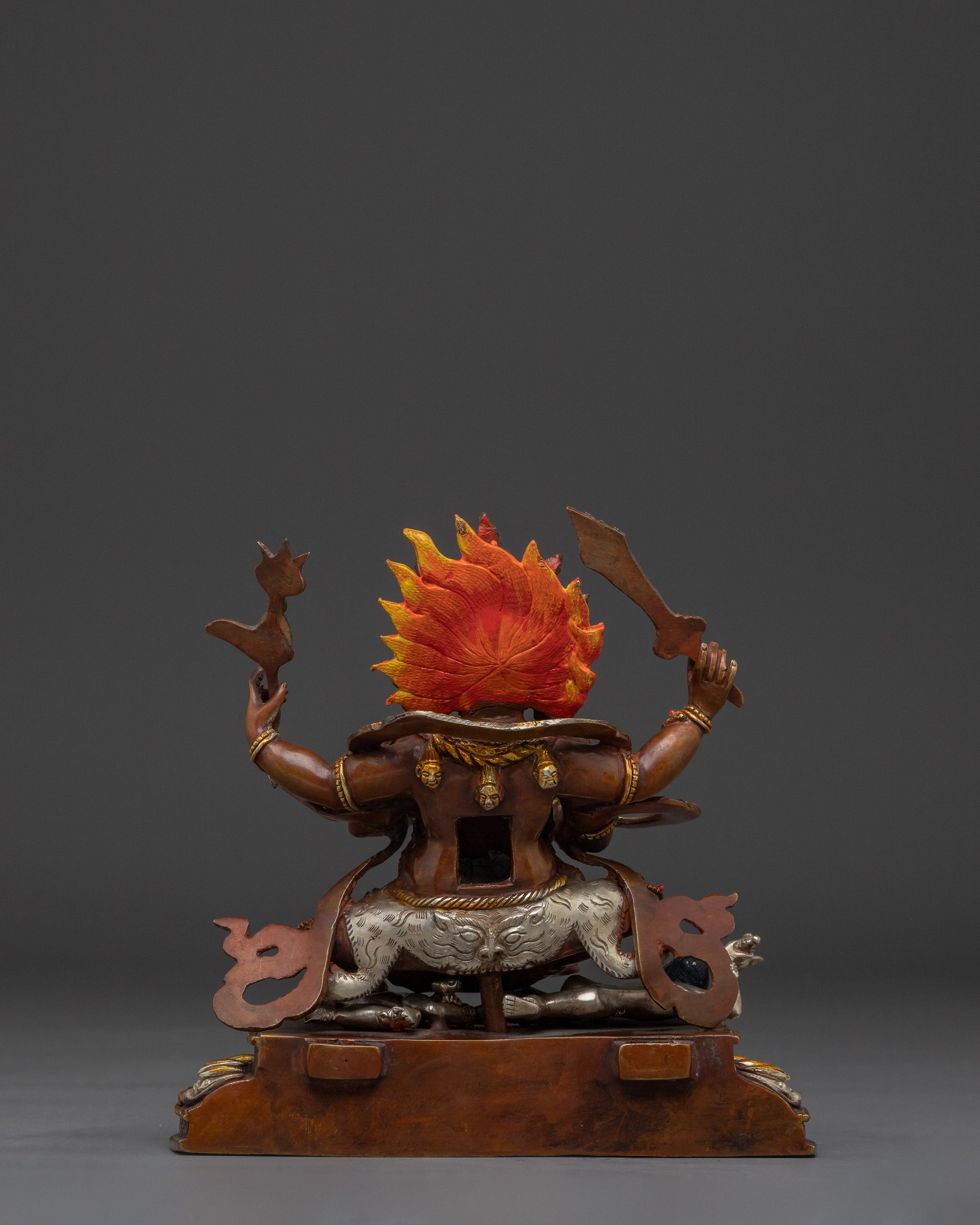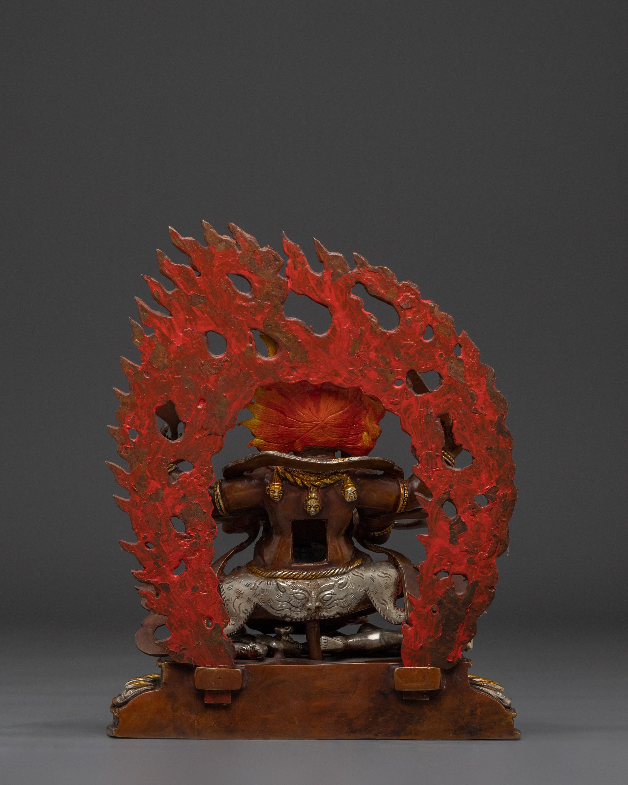 The burning flame on the background represents the elimination of ignorance, while the lotus foundation grounds the sculpture in spiritual tradition. This is more than just a statue; it is a spiritual ally created over centuries of Himalayan creativity and effort.