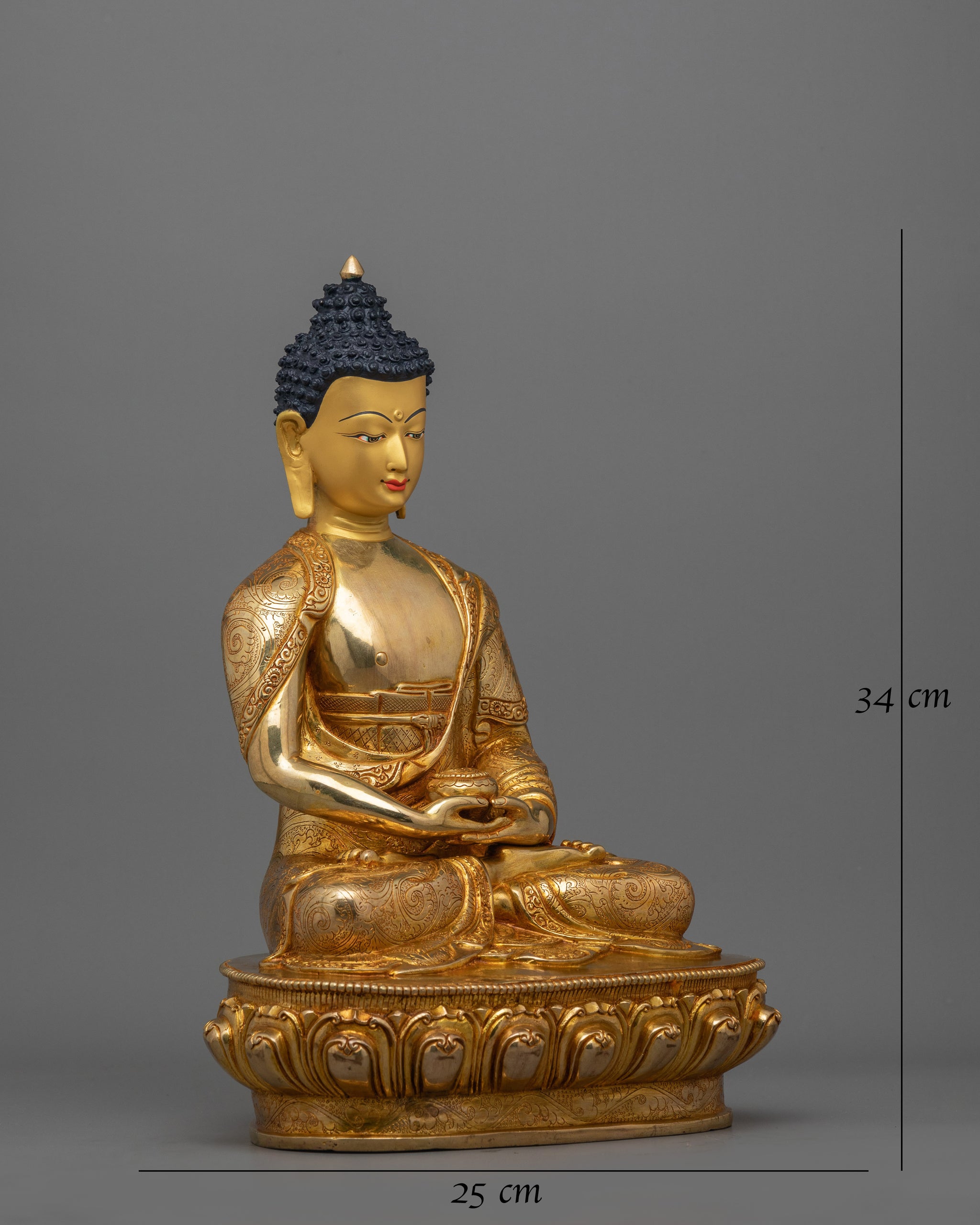 This First Pure Land Buddha Amitabha Statue stands at 13.4” (34cm) in height with a base width of 9.8” (25cm). Crafted from a copper body, the statue is enhanced with 24K gold gilding, giving it a radiant finish. Intricate gold and acrylic paintings bring the statue's features to life, adding color and detail to the serene depiction of Amitabha Buddha. Crafted by expert artisans, this item symbolizes the rich traditions of Himalayan Buddhism, making it an important addition to altars, meditation places, or holy collections.