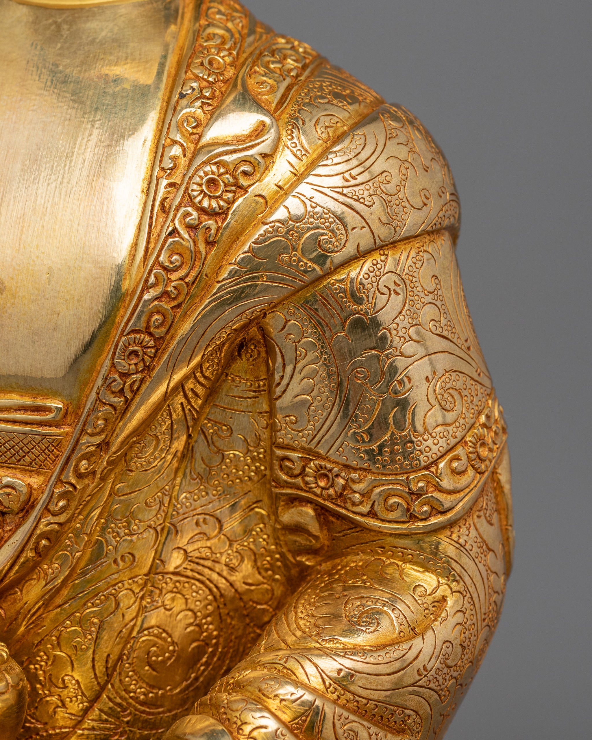 Amitabha is shown in a tranquil sitting stance, holding an alms bowl in his lap to symbolize renunciation and the simplicity of the enlightened life. His peaceful countenance represents the knowledge and compassion he bestows on individuals seeking rebirth in his Pure Land, Amitabha's dedication to assisting all creatures in achieving spiritual awareness and freedom is demonstrated by this gesture.