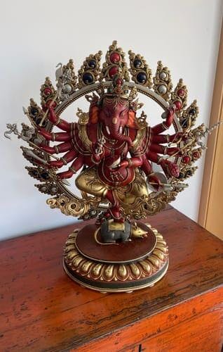 Ganesh, also known as Ganesha, Ganapati, Vinayaka, and Pillaiyar (Tibetan: tsog gi dag po) is one of the most well-known and most worshipped deities. We depicted Shri Ganapati with a body red in color, having an elephant face with sharp tusks, and possessing three eyes. His hair is tied in a topknot, and his crown is beautifully decorated with jewels on his head. His six right hands hold an axe, arrow, hook, vajra, sword, and spear. The six left holds a pestle, bow, katvanga, skullcup filled with blood, skullcup filled with human flesh, and a shield together with a spear and banner. Wearing various silks as a lower garment and adorned with a variety of jewel ornaments, the left foot is extended in a dancing position, standing upon a rat expelling various jewels.