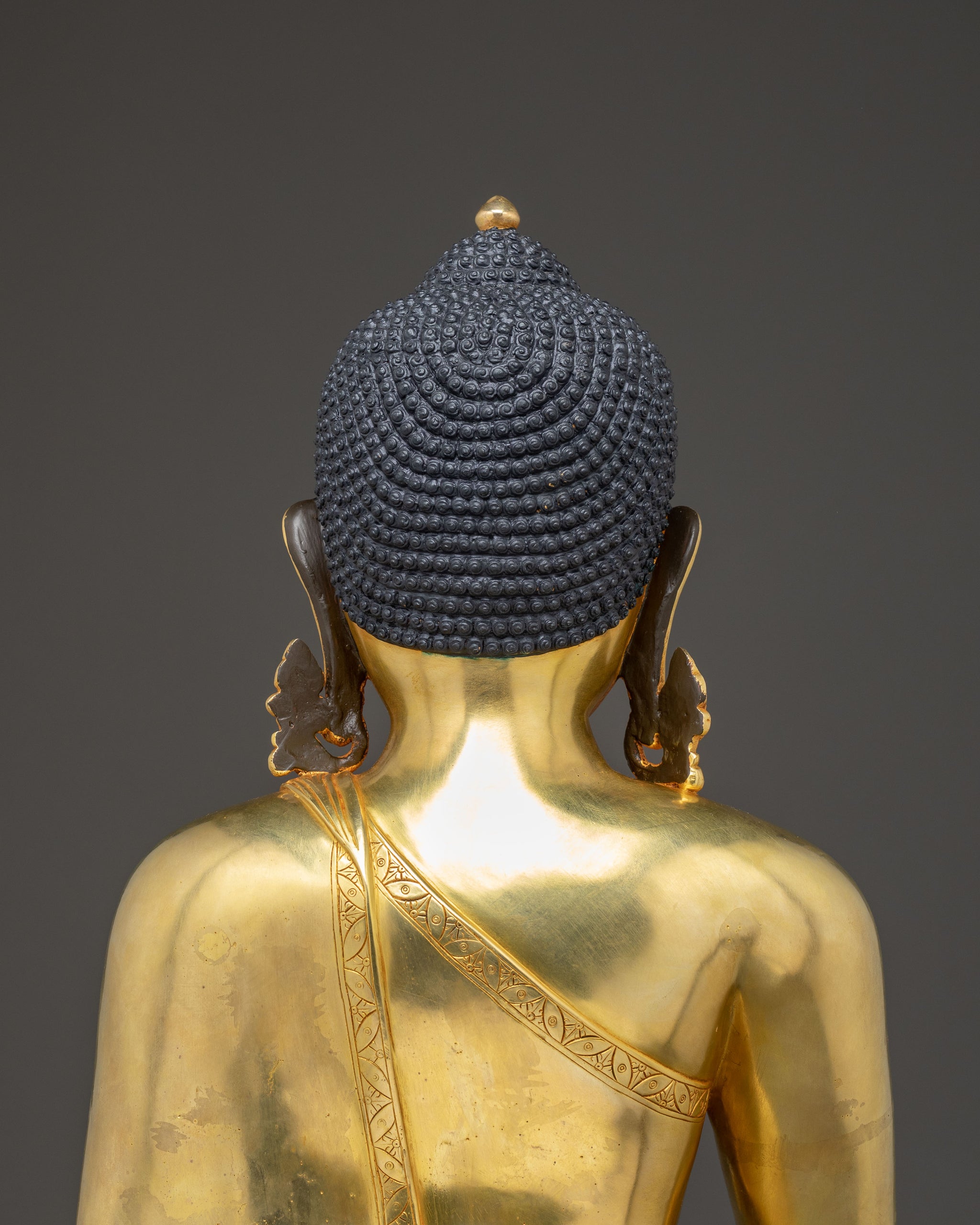 Shakyamuni Buddha is depicted sitting in the lotus position (padmasana), symbolizing his steady concentration and mastery over the distractions of the material world. His right hand stretched toward the earth in bhumisparsha mudra, representing his moment of enlightenment, inviting the earth to witness his waking. The left hand, lying gently in his lap in dhyana mudra holding an alms bowl, depicts the profound state of meditation and mindfulness that leads to insight and clarity.
