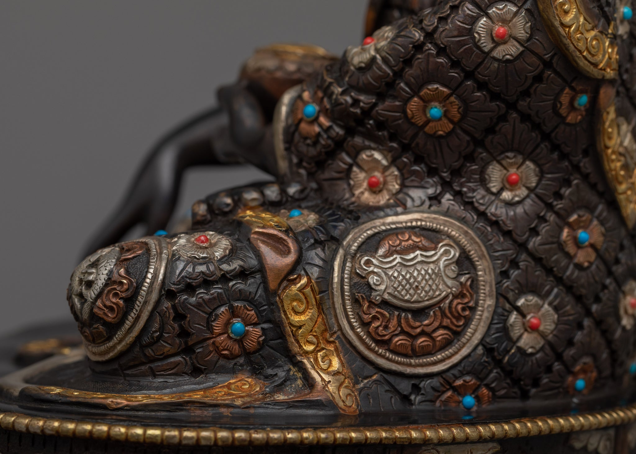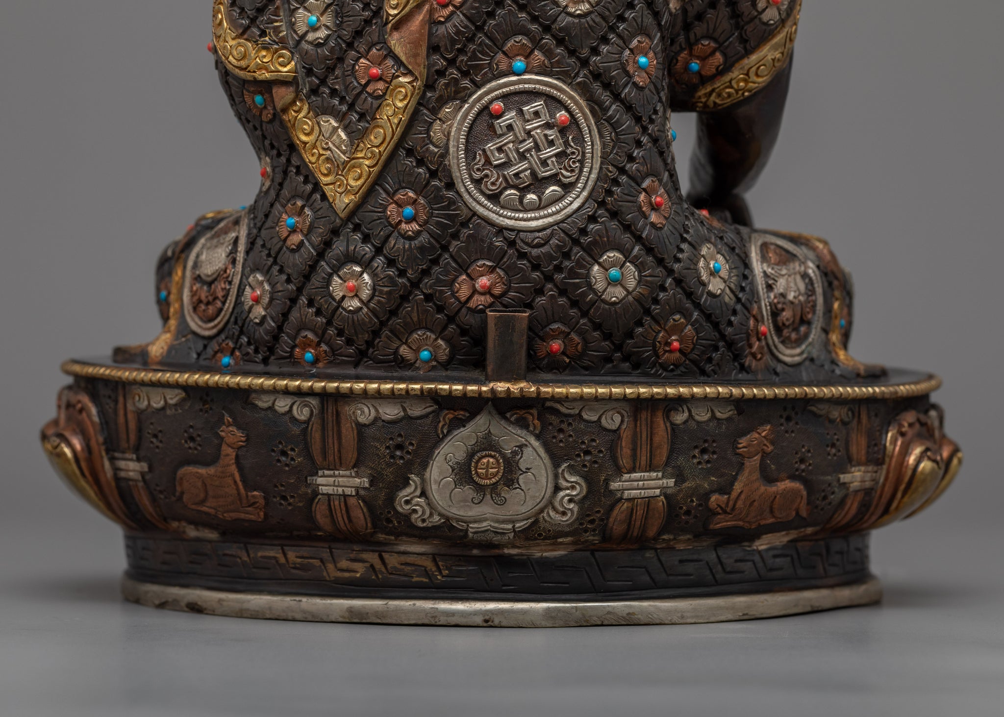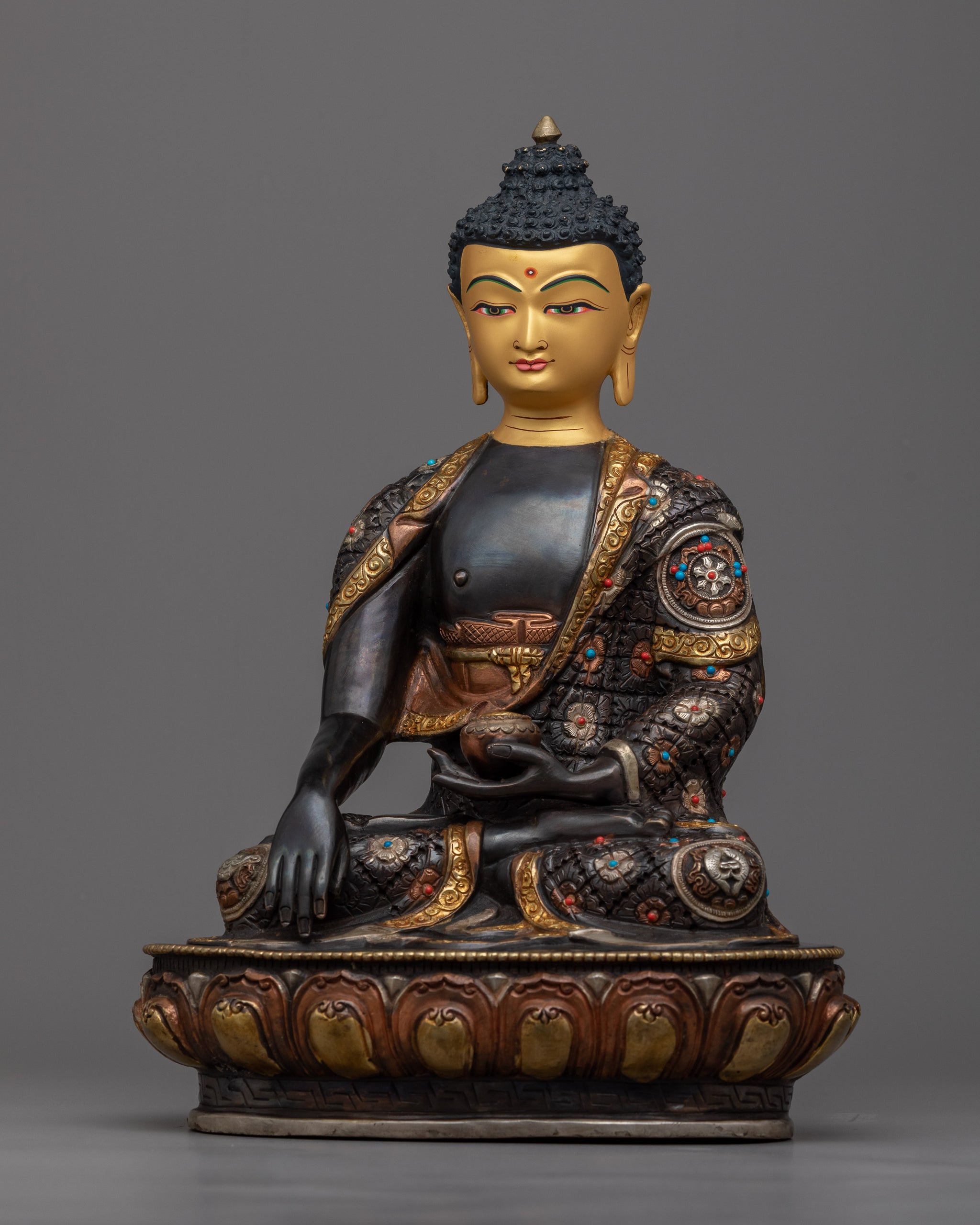 This statue is made of oxidized copper and is adorned with silver plating, conveying grandeur and spiritual purity. Our talented artisans painstakingly crafted the hand-carved motifs decorating Buddha's robes and ornaments as a visual narration of his teachings. The facial characteristics are enhanced with high-quality acrylic paints, and a liberal sprinkling of gold powder gives a touch of divinity to Buddha's tranquil expression.