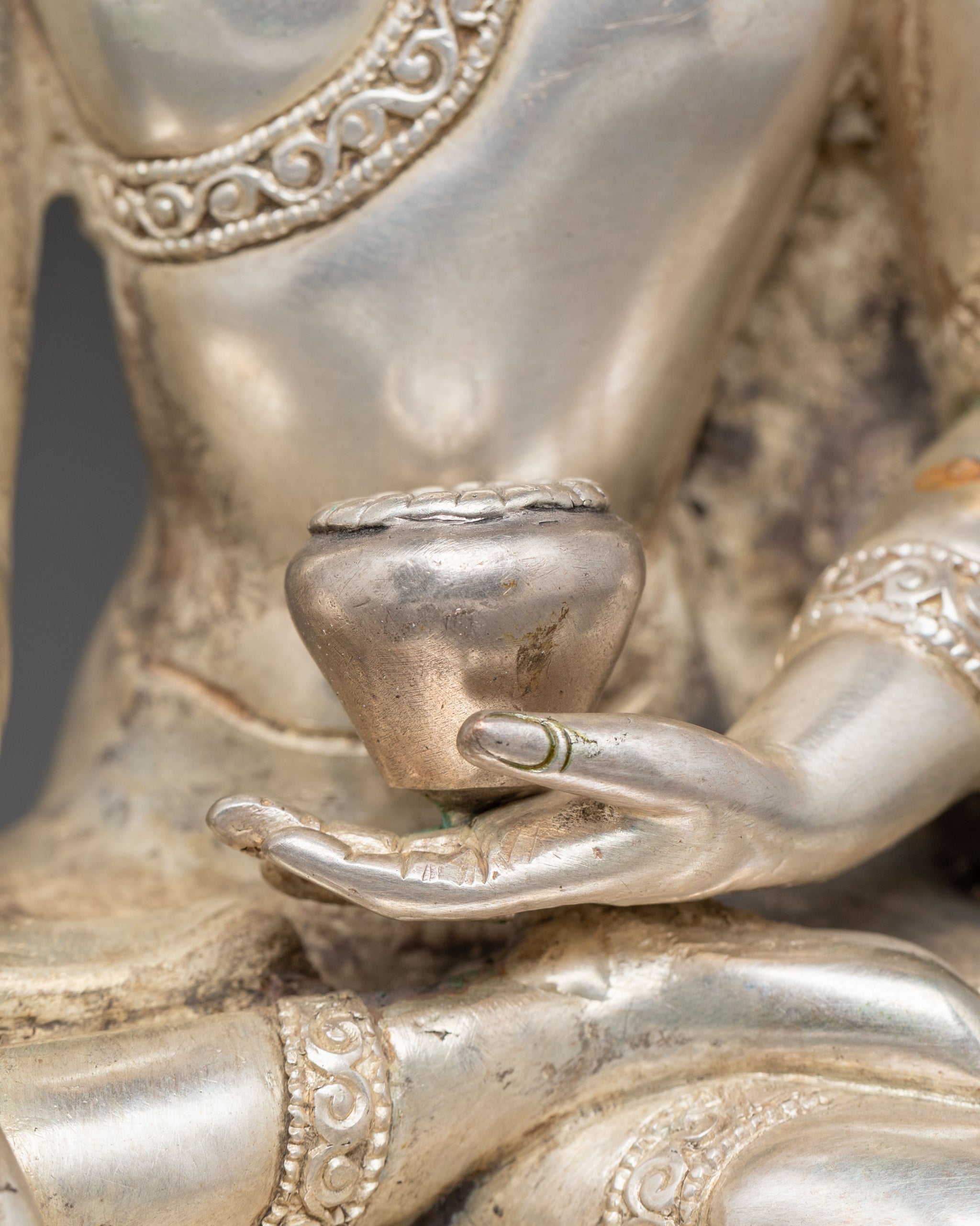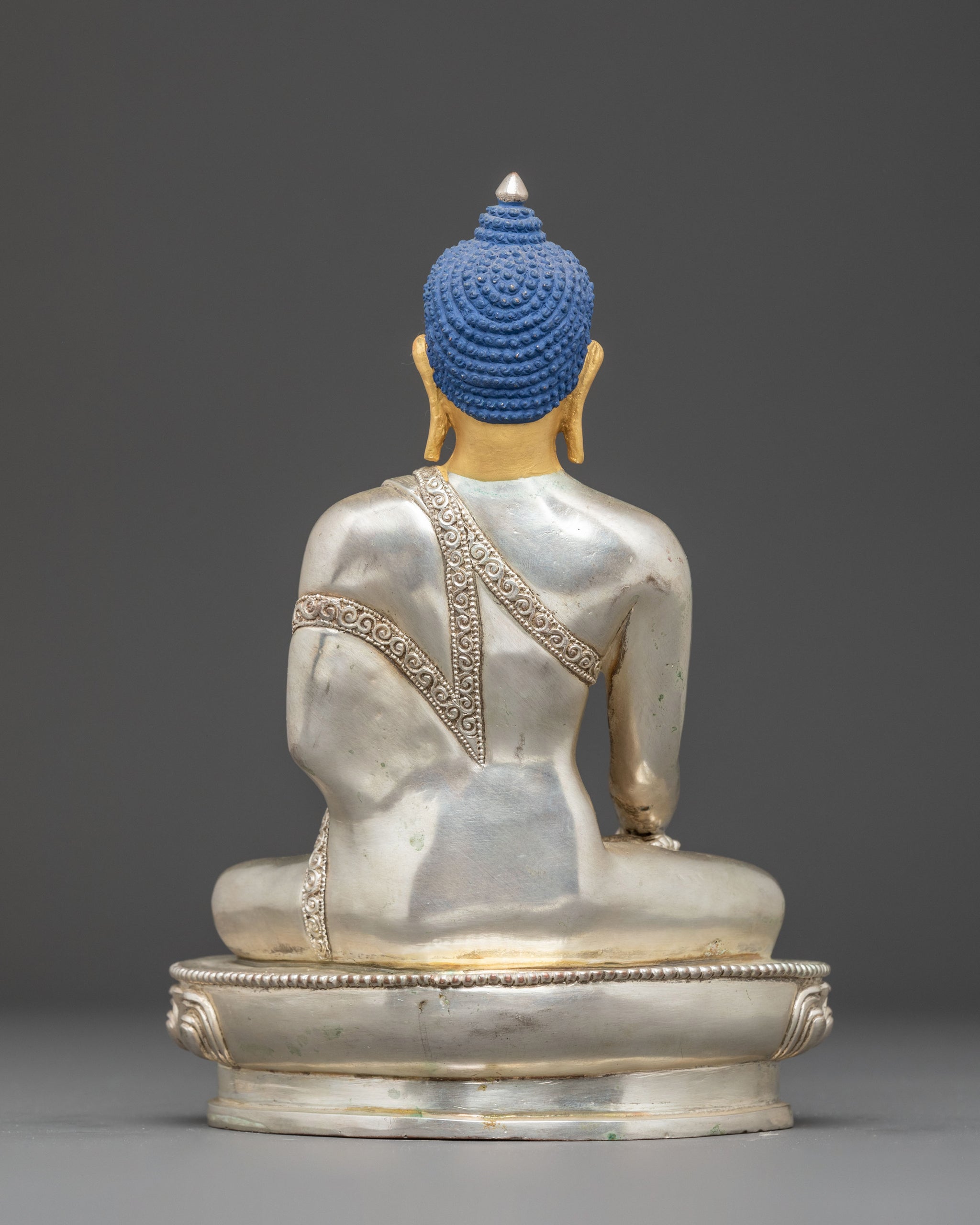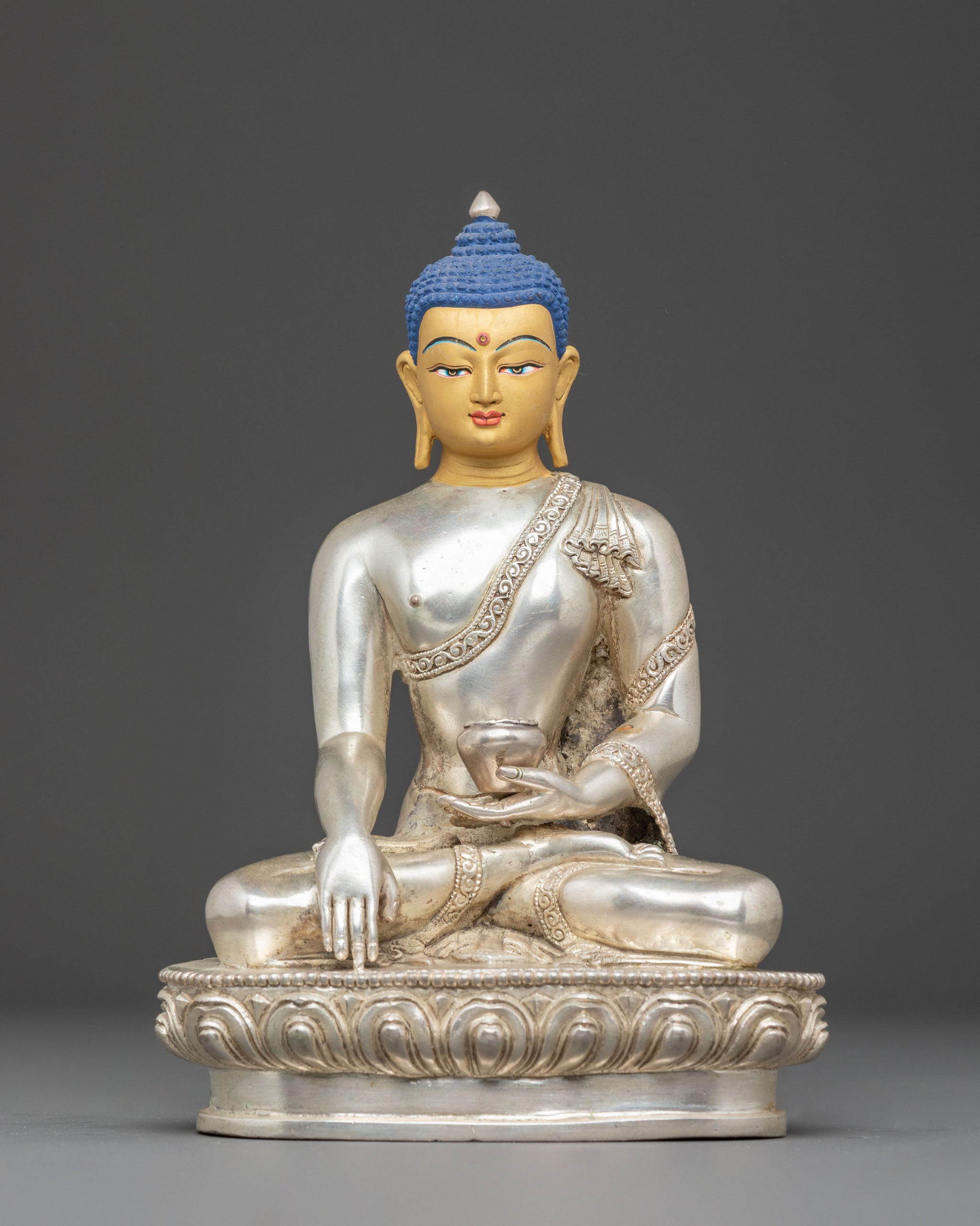 Gautama Buddha is depicted in a calm, meditative state with half-closed eyes, embodying profound inner peace and an awakened presence. His right hand is in the bhūmisparśa mudrā (earth-touching gesture), signifying the moment he called the Earth to witness his enlightenment. His left hand holds an alms bowl, symbolizing renunciation and the simplicity of the monastic path. Atop his head rests the uṣṇīṣa, representing supreme wisdom, while his hair is styled in snail-like coils, referencing the well-known story of snails protecting him from the sun during prolonged meditation.