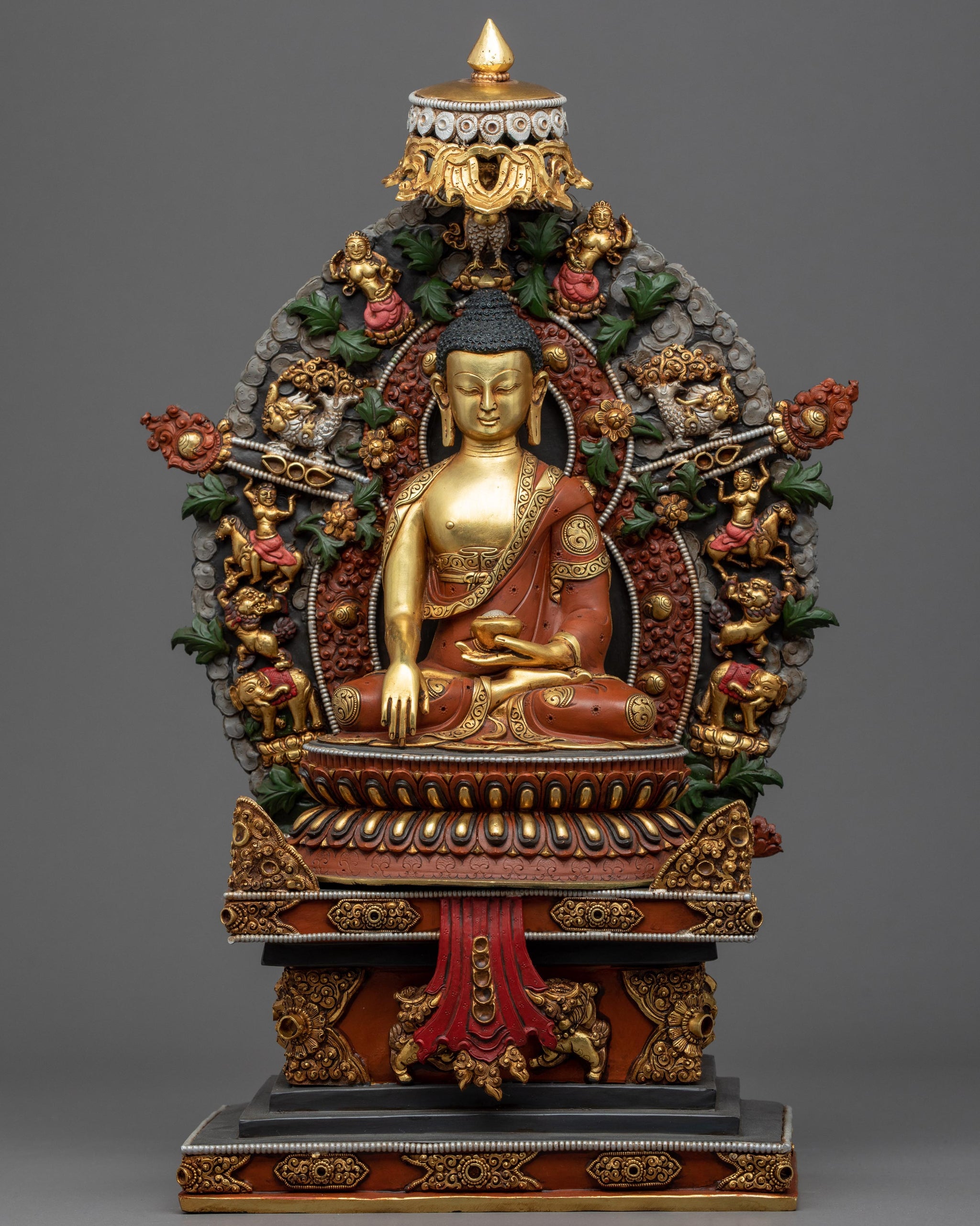The statue of the Gautam Siddarth Buddha was masterfully crafted by the artists of Nepal in our studio. This one-of-a-kind art piece depicts the deity seated upon a lotus throne with a serene expression. At the same time, he holds an alms bowl in his left hand while his right hand is slightly touching the earth, touching mudra. Carved from a copper body and then gilded with 24k genuine gold, the throne of the statue is specially made with the vision of the artists with multiple carvings representing multiple mythical creatures which are individually painted with acrylic paint, highlighting every aspect and detail of the statue. Above the statue, an umbrella is placed signifying the person or symbol below is the center of the universe. Months of hard work were done for this flawless piece of art to be complete, with every detail given time and attention. You can use this figurine for different Buddhist Rituals and meditational practices.