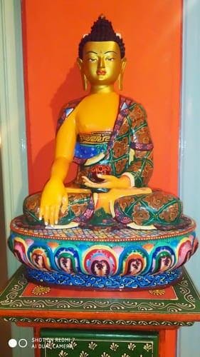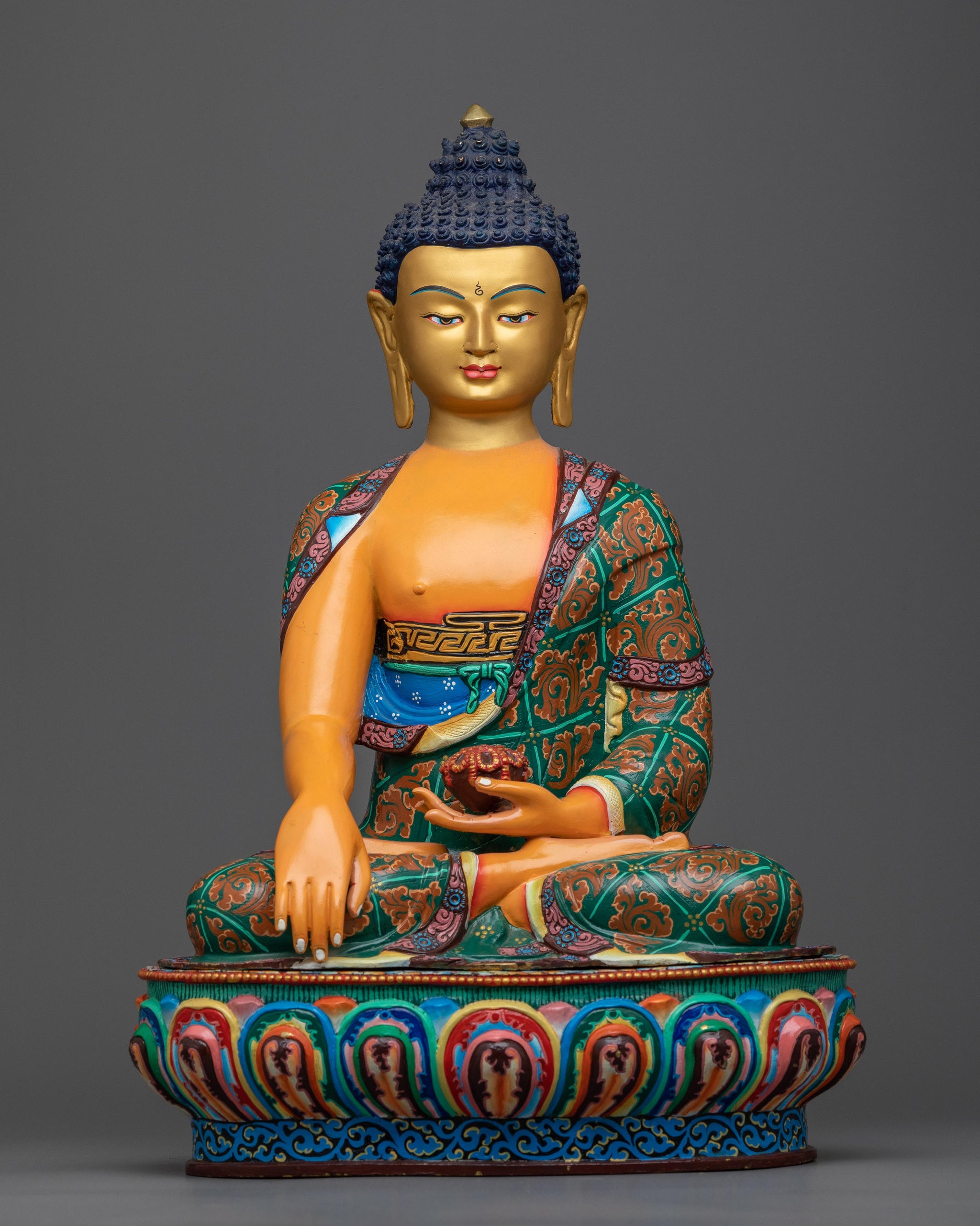 Enhance your space with the Gautama Buda's calming and transformational aura. Each curve and detail on this painstakingly carved statue tells a story about Buddha's path to enlightenment and his profound teachings. The gold and acrylic paintings dance in harmony against the backdrop of a sturdy copper body, bringing levels of depth and intrigue to this amazing sculpture.