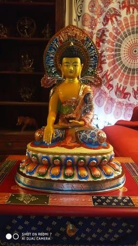 Our statue, a work of art, is cast from solid copper and gilded with dazzling 24K gold, creating a tranquil divinity aura. The themes and exquisite embellishments on the robes and body ornaments were painstakingly hand-carved, reflecting the endless hours of dedication and mastery that went into each creation. The faces of the deities are sprinkled with heavy gold powder, and the body's emphasized with colorful acrylic paintings to further enhance the deity's aura.