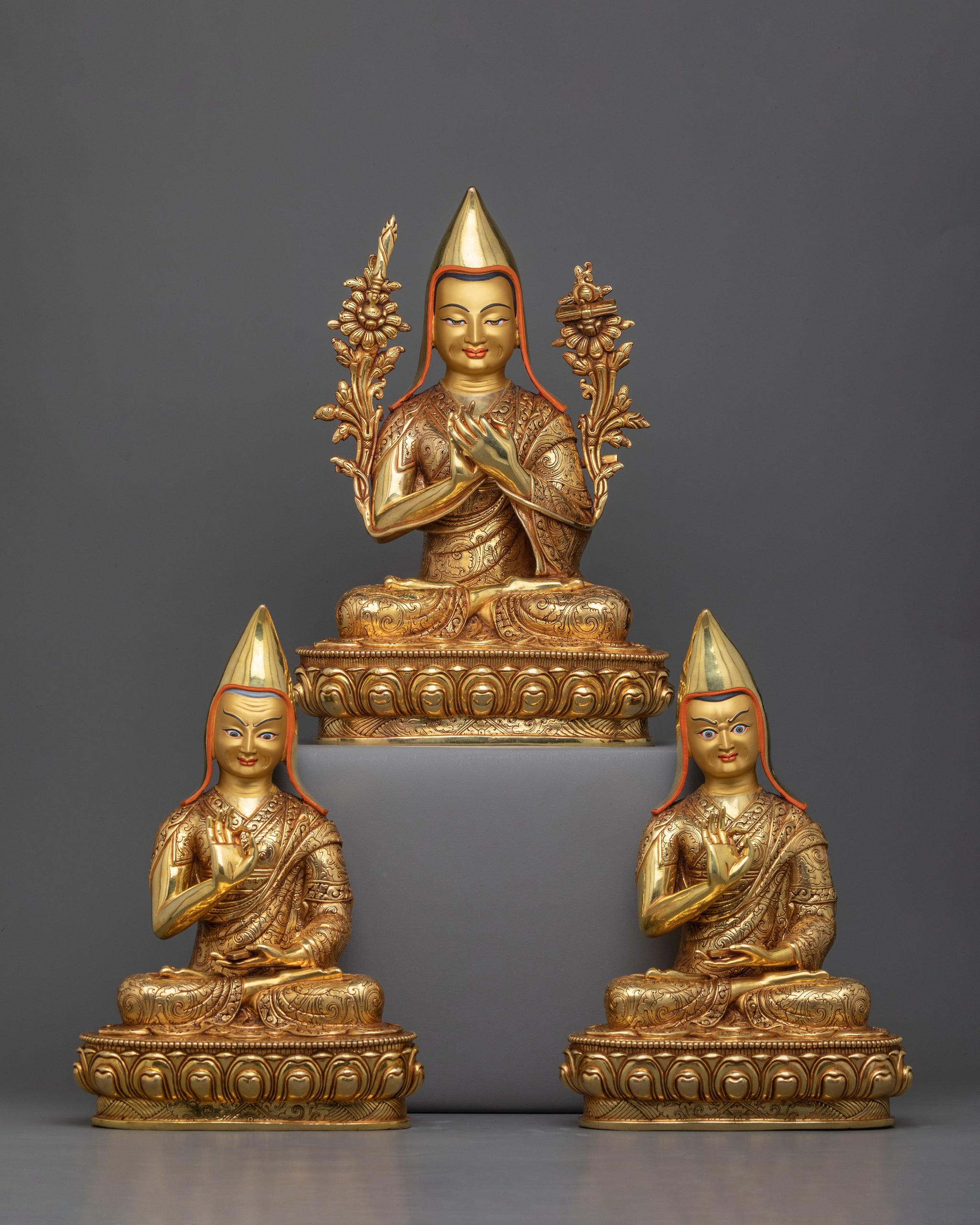 The Gelug Masters Set, which includes carefully sculpted statues of Tsongkhapa and his beloved followers, allows you to feel the holy presence. The Tsongkhapa statue, which weighs 4.62 kg and is 13.8 inches tall, is the focal point of this collection. The collection also comprises statues of Je Khendrup and Je Gyaltsab, which have respective heights of 12.2 inches and weighs of 2.87 kg and 2.95 kg. These statues are made of premium supplies, such as acrylic paints on copper bodies, 24K gold gilded, and gold, guaranteeing their exquisite beauty and long-lasting sturdiness.