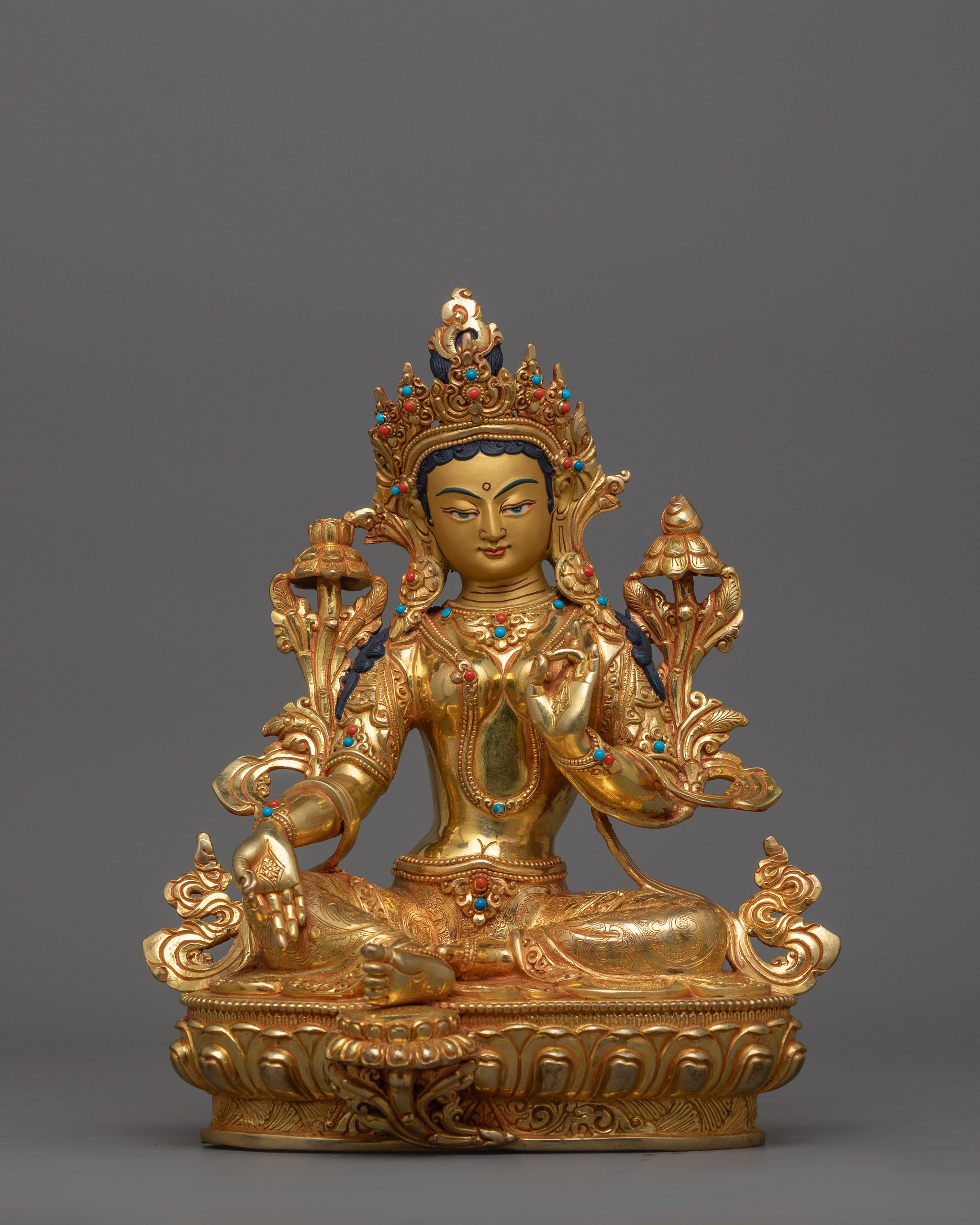 This Goddess Green Tara with Beautiful Gemstones radiates vibrant compassion and dynamic protection. Seated gracefully in a lotus posture, this statue measures Size: 9.4”/24cm (Height) x 7.9”/20cm (Base) Weight: 2.76 kg. Handcrafted in Nepal by master artisans, this statue is made of 24K gold-gilded and copper. It is meticulously sculpted with intricate gold and acrylic painting and accented by delicate gemstones.
