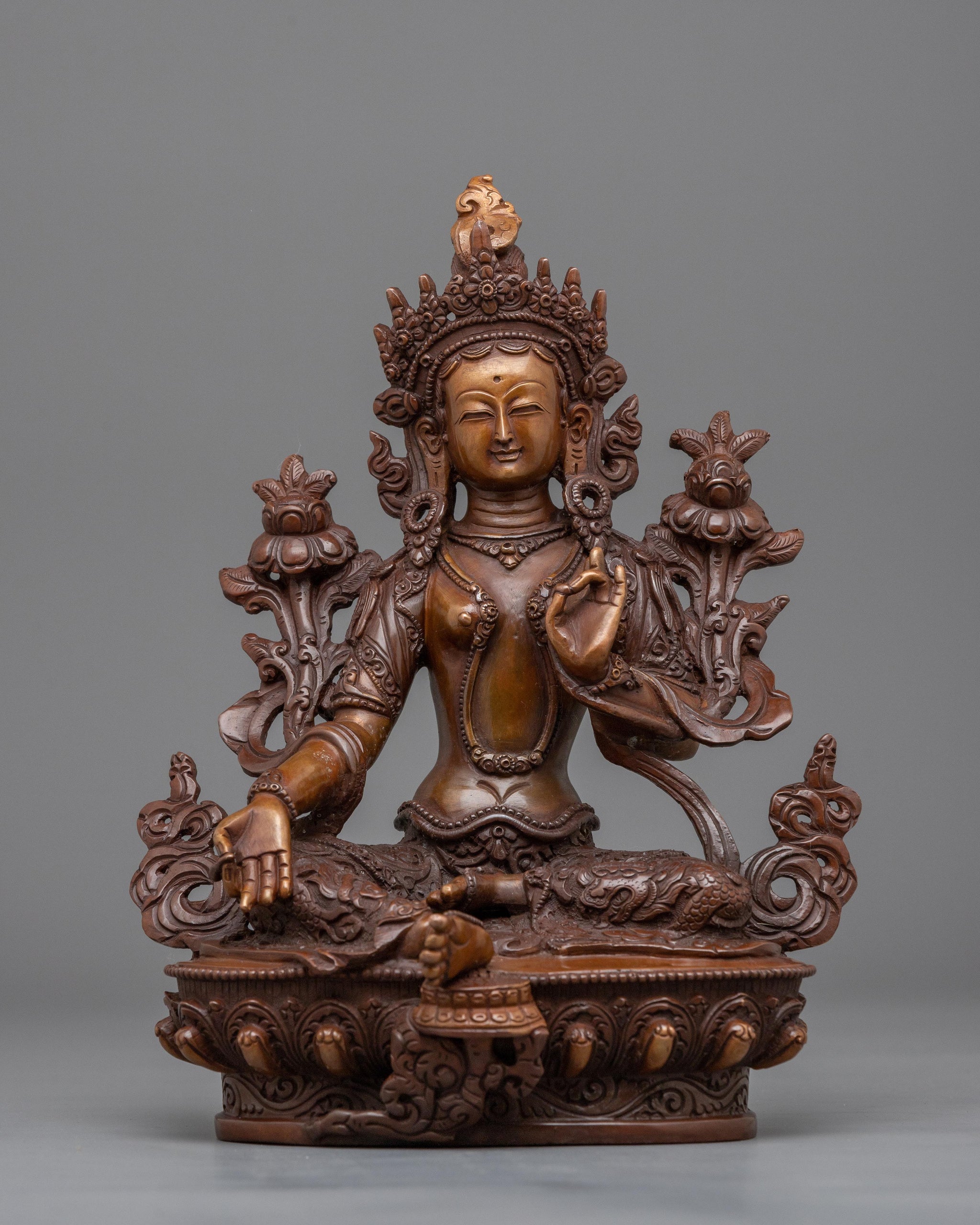 Unveil the brilliant presence of the Goddess Syamatara in your holy sanctuary. Standing 8.7"/22 cm and weighing 1.70 kg, this finely constructed statue displays great craftsmanship and attention to detail. Crafted from oxidized copper, this work of art exudes a calm atmosphere that beckons peace into your surroundings. Carefully carved ornate dragon designs adorn the attire of the famed Green Tara, lending the statue a sense of divine elegance and meaning. Experience Syamatara's transforming force by allowing her serene essence to accompany you on your spiritual path.