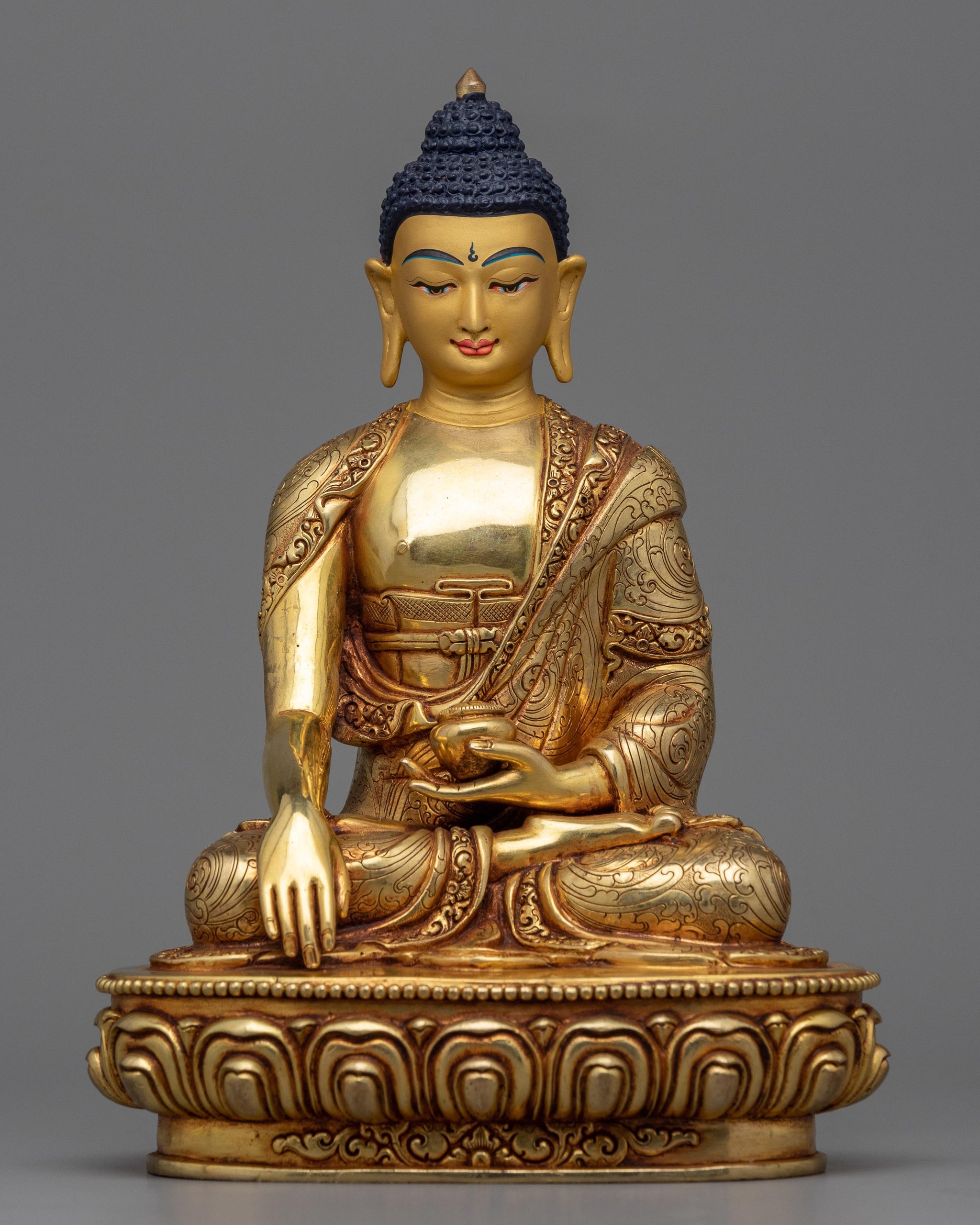 This Shakyamuni Buddha Statue is hand-carved in our studio by skilled Vajrayana artisans who are traditionally trained in the Vajrayana Buddhist tradition of artistry. The statue is made of premium copper and gilded in 24K gold. This statue portrays the Buddha sitting peacefully on a moon disc lotus seat performing the "Bhumisparsa mudra," or "earth-touching stance," with the right hand on the ground representing the moment Buddha attained enlightenment claiming the heart earth as his witness, and the other holding an alms bowl, a symbol of the Buddha's denouncement of earthly desires.