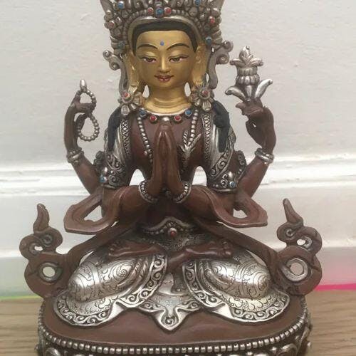 Meticulously handcrafted in our workshop, this Gold Painted Chenrezig Statue is intricately designed with unique Nepali patterns. This statue is comprised of oxidized copper, partially gilded in gold and partially plated in silver. The Bodhisattva has four arms and is seated on a moon disc lotus seat. Here, the first pair of arms are depicted brought together in front of the chest to form the "Namaskara Mudra," and his second pair each hold an object like the crystal rosary on his left and an Utpala flower on his right. Our artists have carefully put precious jewels to enhance the statue's beauty.