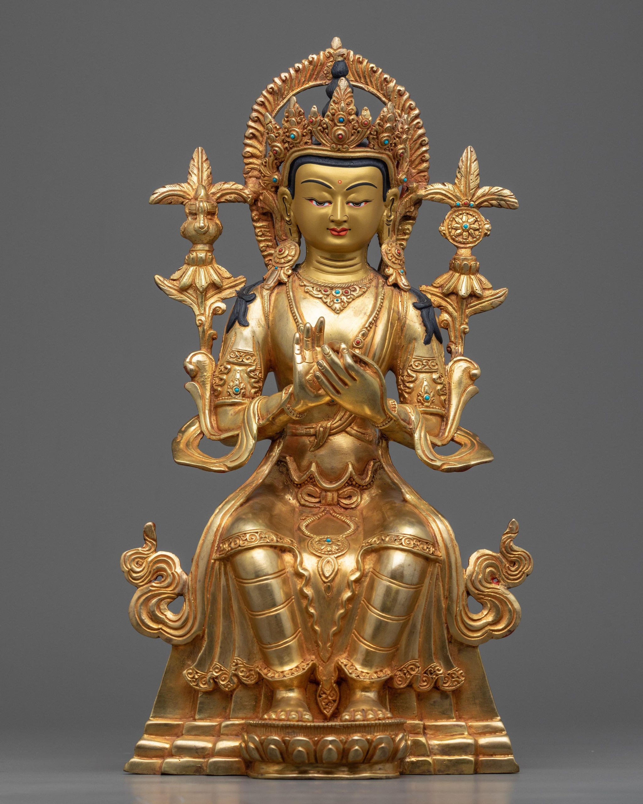 We created this stunning gold buddha Maitreya statue in our studio using a traditional Himalayan carving technique passed down from generation to generation from Nepal. The Buddha, seen as the embodiment of loving-kindness, is depicted seated on a throne, elegantly and with a smiling face. His feet rest on a moon disc lotus seat. The Buddha can be seen performing the "Dharmachakra Mudra," representing the Buddha's first sermon.