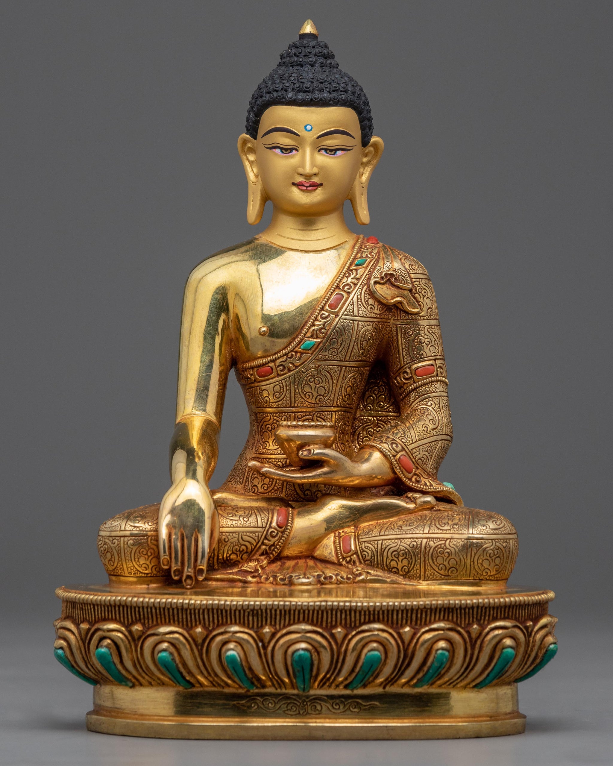 We have masterfully hand-carved the Buddha Shakyamuni Statue in the traditional Himalayan style. Crafted from a copper body and gilded with 24k genuine gold, which highlights the intricate design patterns of the statue. In the statue, Shakyamuni Buddha sits atop a moon disc lotus with an alms bowl over his lap on his right hand with a serene expression. He portrays the 'Bhumisparsa Mudra,’ representing the Buddha's awakening. The statue is bejeweled with precious gemstones meticulously placed by our artists, particularly for Shakyamuni's robe and lotus seat. Gilded gold, the statue exhibits excellent luster.