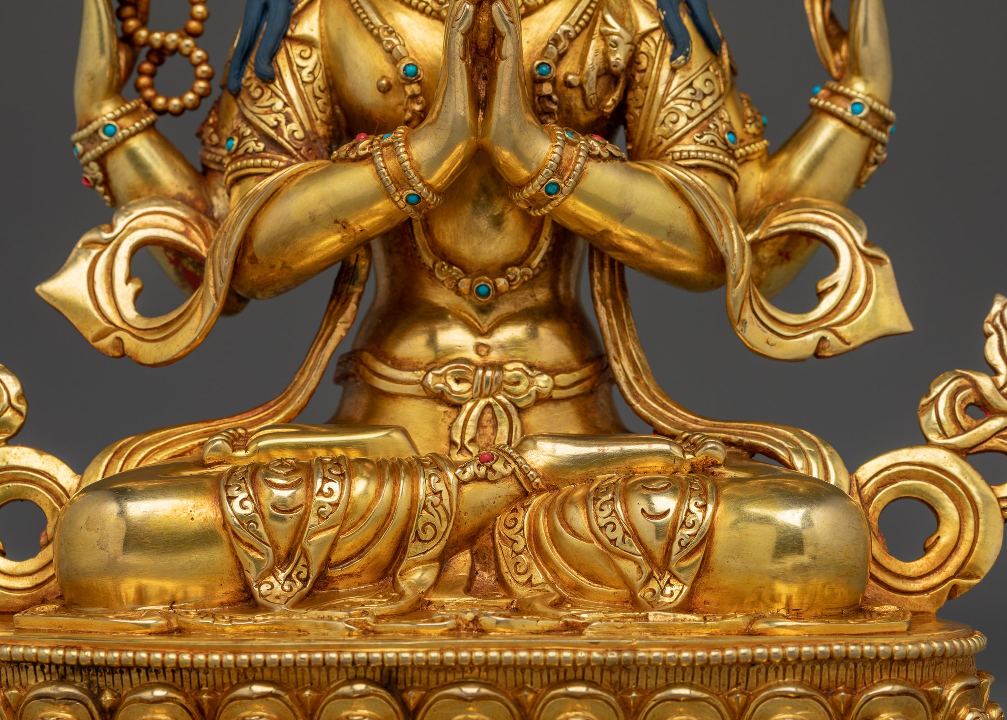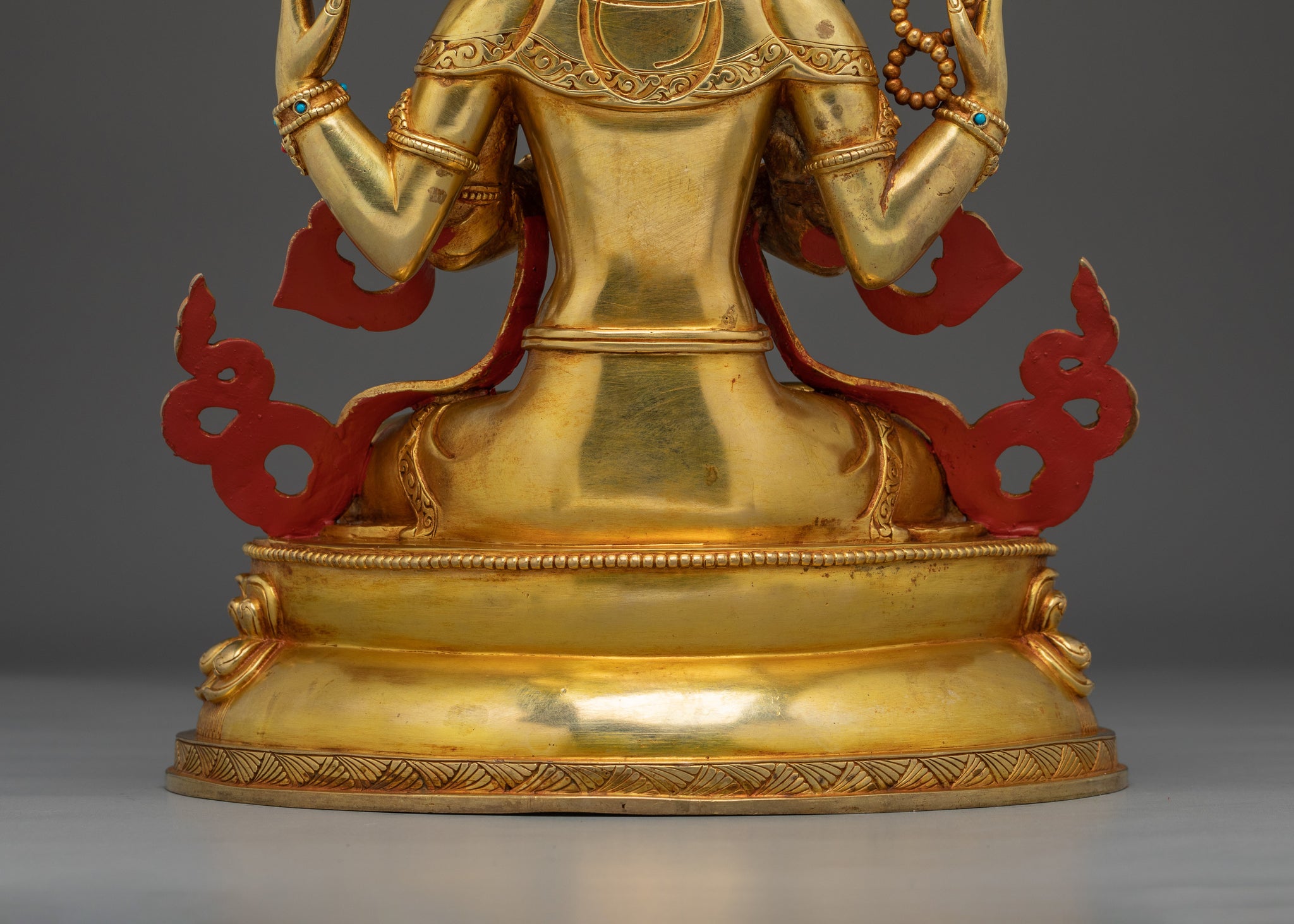 A precious example of sacred elegance, this 13.2-inch gold-gilded copper Avalokiteshvara sculpture is minimal in size but profound in significance. This four-armed Avalokiteshvara, gilded in stunning 24K gold and cast from copper, exudes the caring nature for which he is admired. Its 3.75 kilogram weight makes it the perfect size for a meditation space, personal altar, or quiet nook, giving heavenly peace wherever it is located.